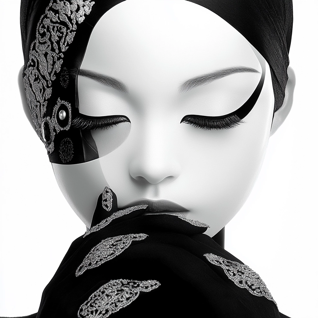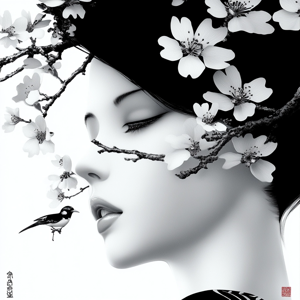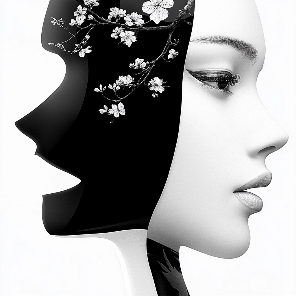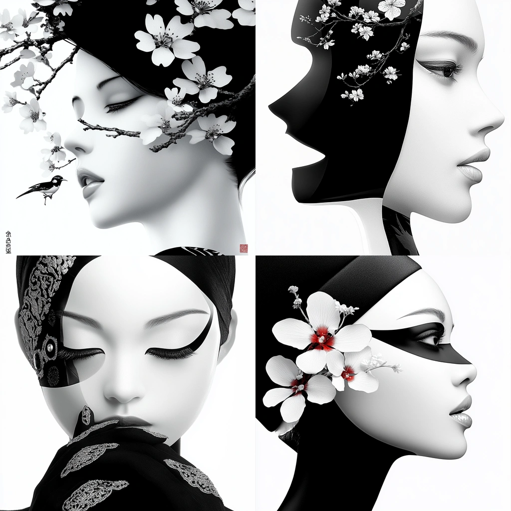 The high contrast of black and white creates striking visual silhouettes, with smooth transitions between light and shadow. Red highlights add depth, drawing attention to specific details.