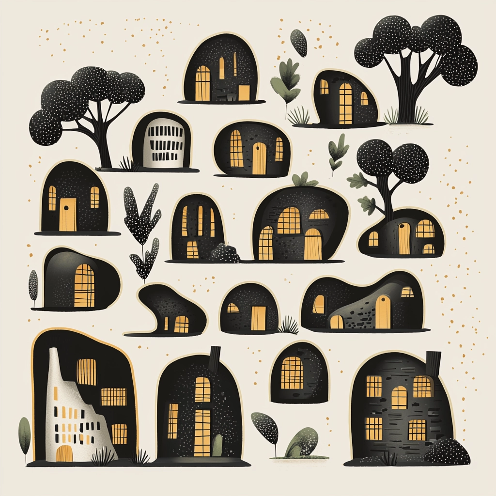 The lighting highlights a clear contrast between textured black and flat beige, with selective gold adding luminous accents. The spatial feel is layered, with distinctively shaped cutouts providing depth.