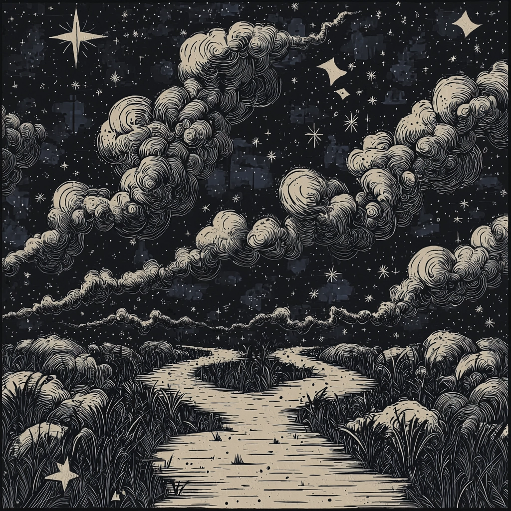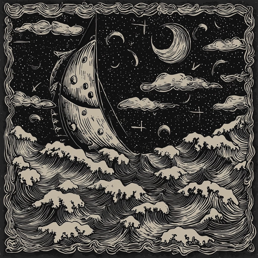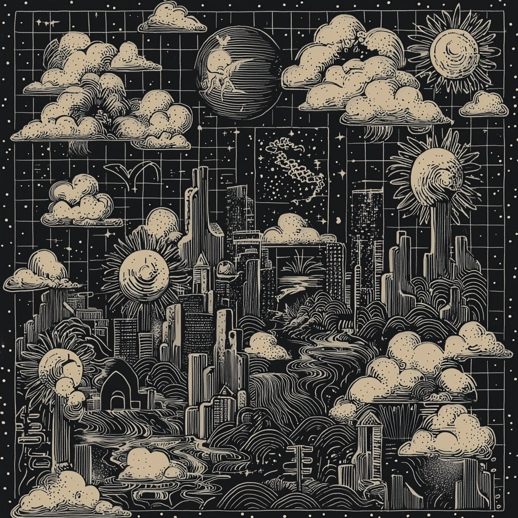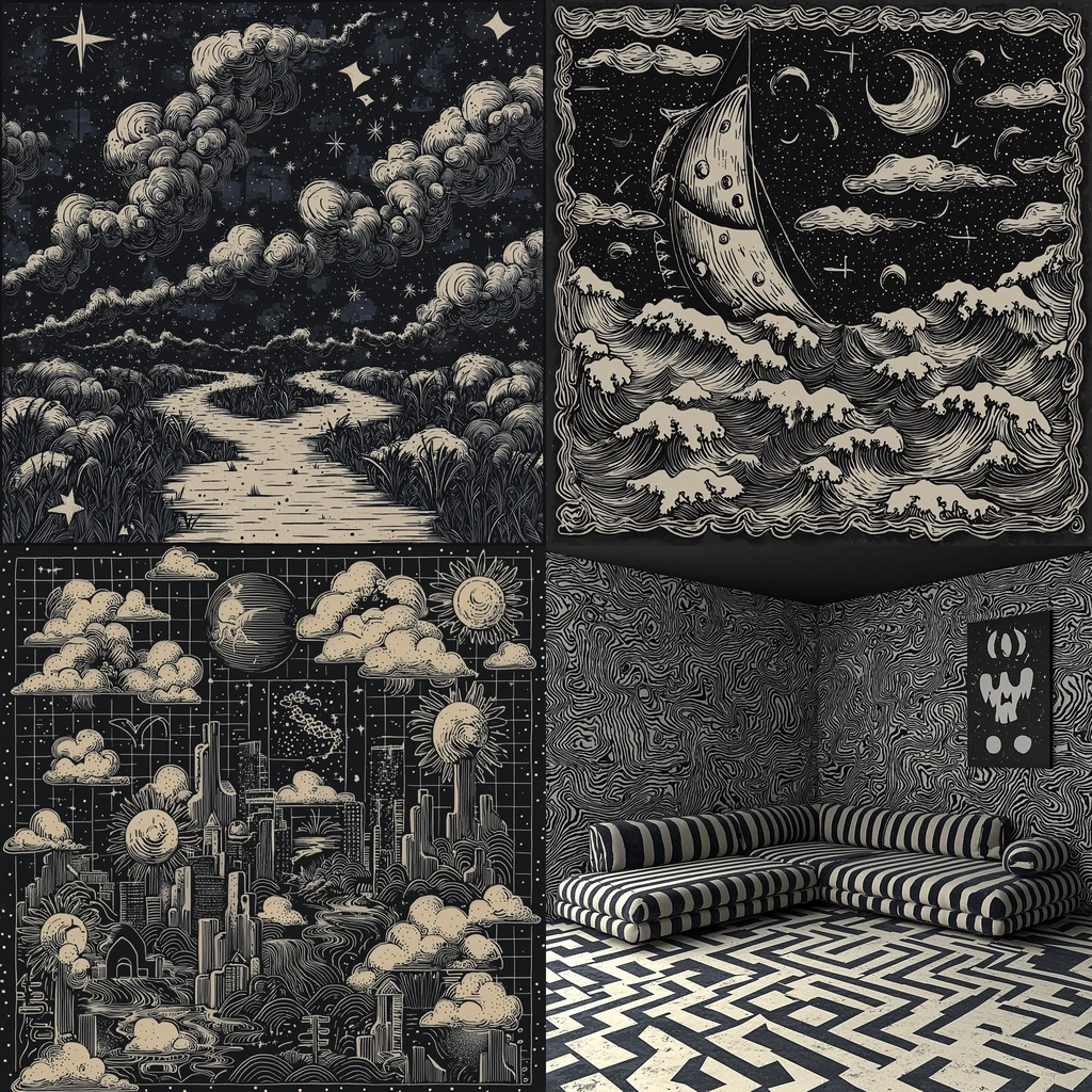 Intricate black and white designs with cosmic themes and dynamic lines.