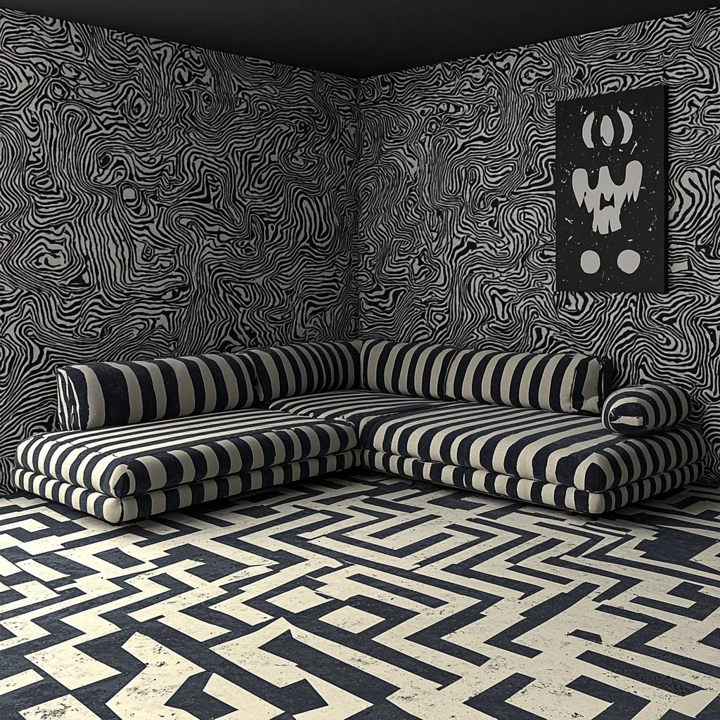 The lighting focuses on stark contrasts accentuating the interplay of light and dark. The color scheme is a bold monochrome palette, creating a timeless aesthetic. Spaciousness is conveyed through the meticulous detailing and depth created by overlapping elements. Textures are smooth yet visually rich, presenting a tactile quality.