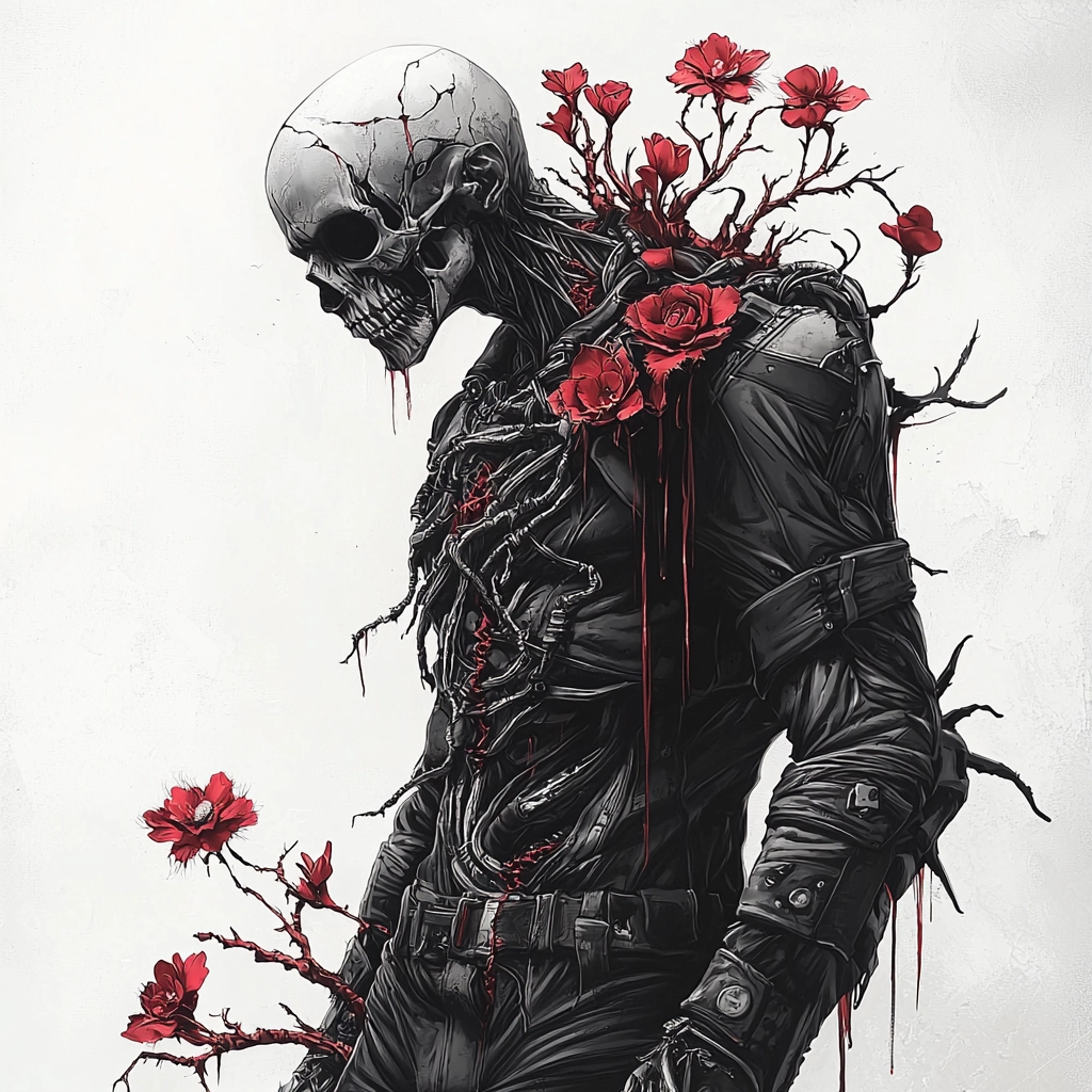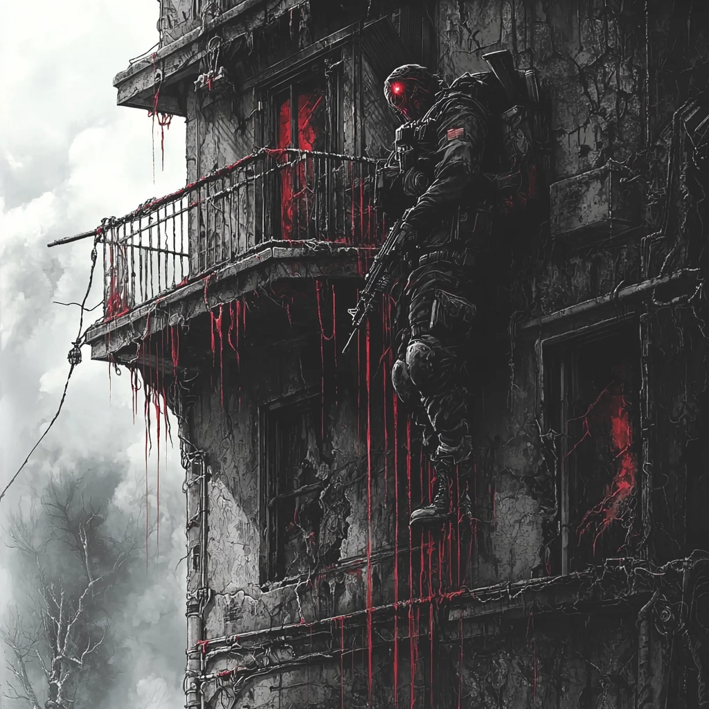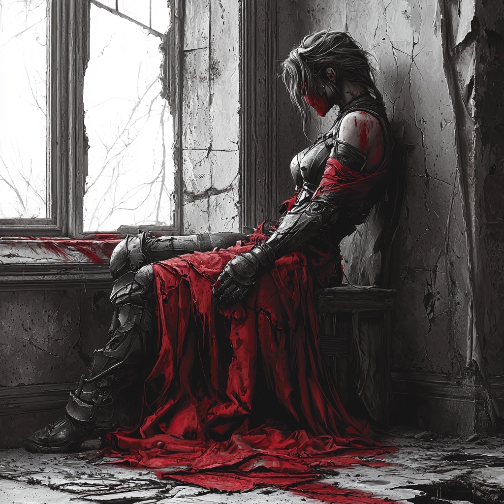 Dramatic contrast emphasizes stark scenes punctuated by visceral red.