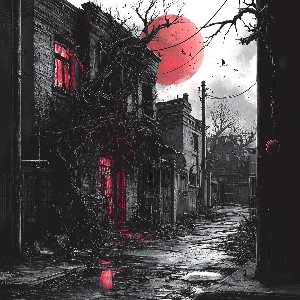 The lighting is bold, highlighting the interplay of shadows and defining forms with precision. Red is used sparingly yet decisively against a largely monochrome background, creating a sense of depth enhanced by the intricate texture of worn surfaces.