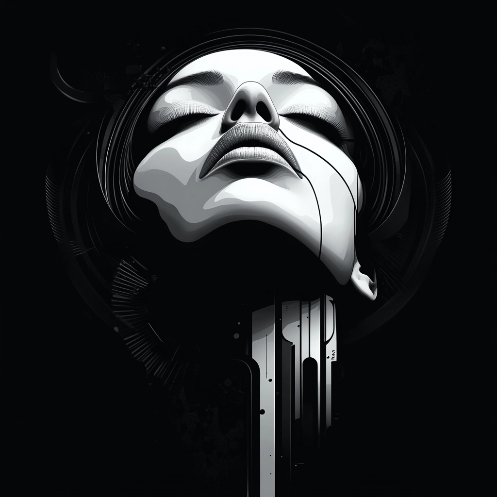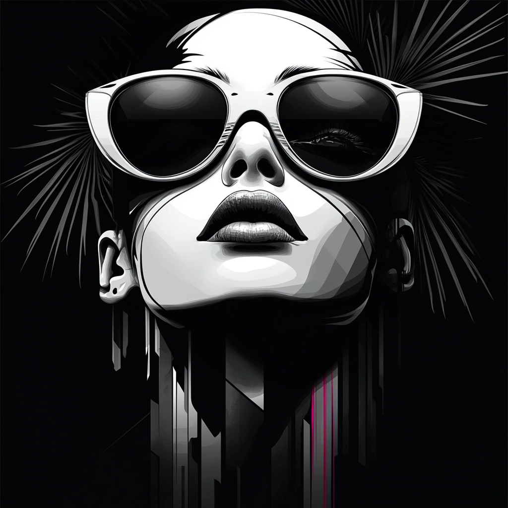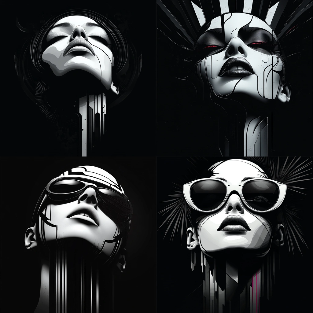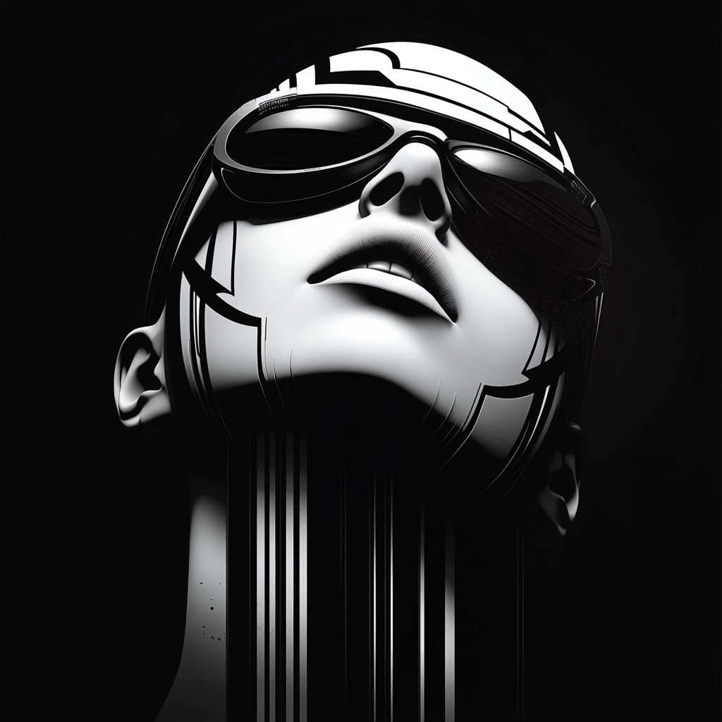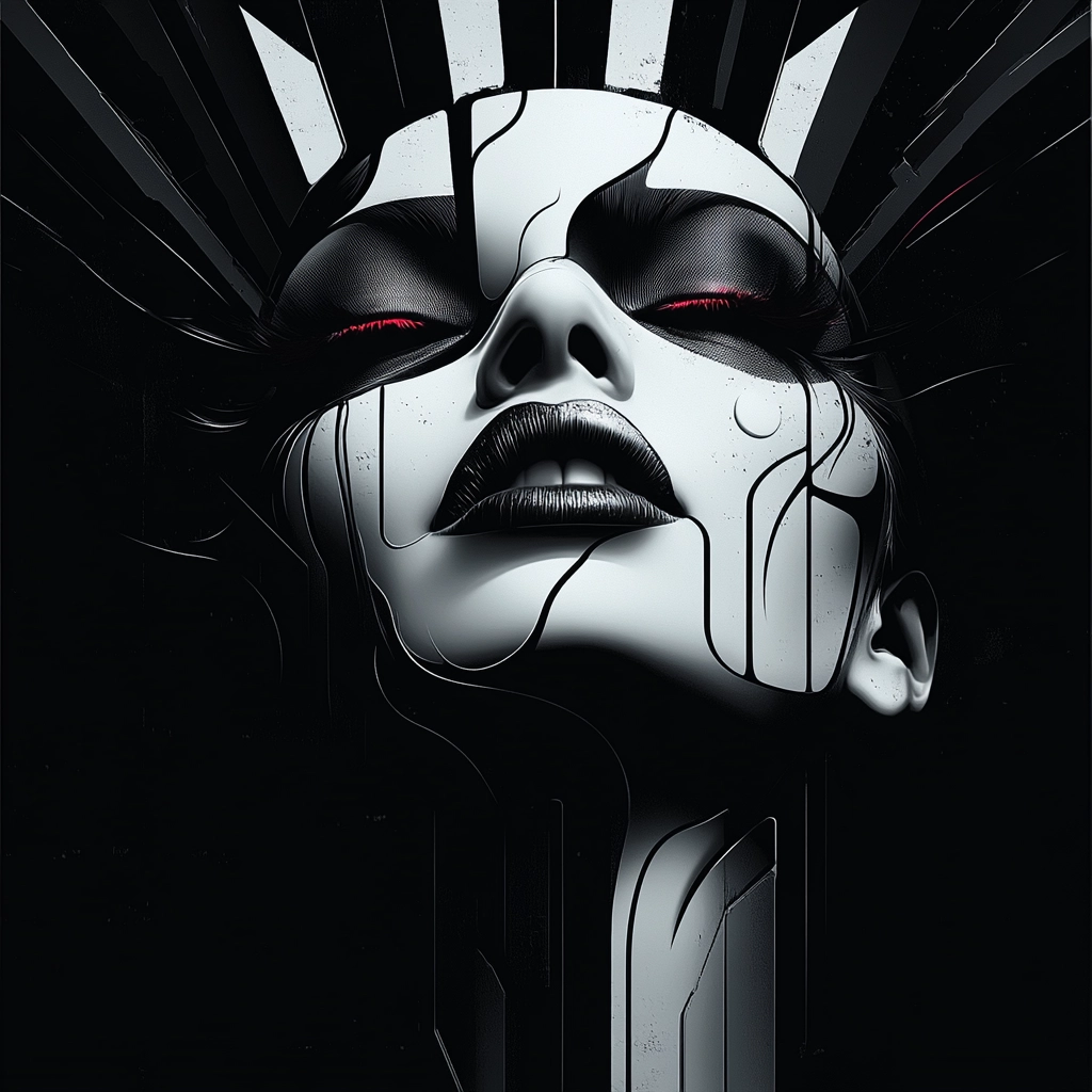 Dynamic contrast of black and white dominates the composition with sharp lines and sleek textures.