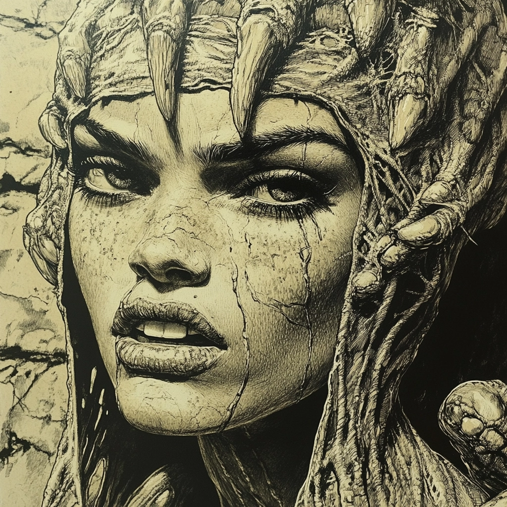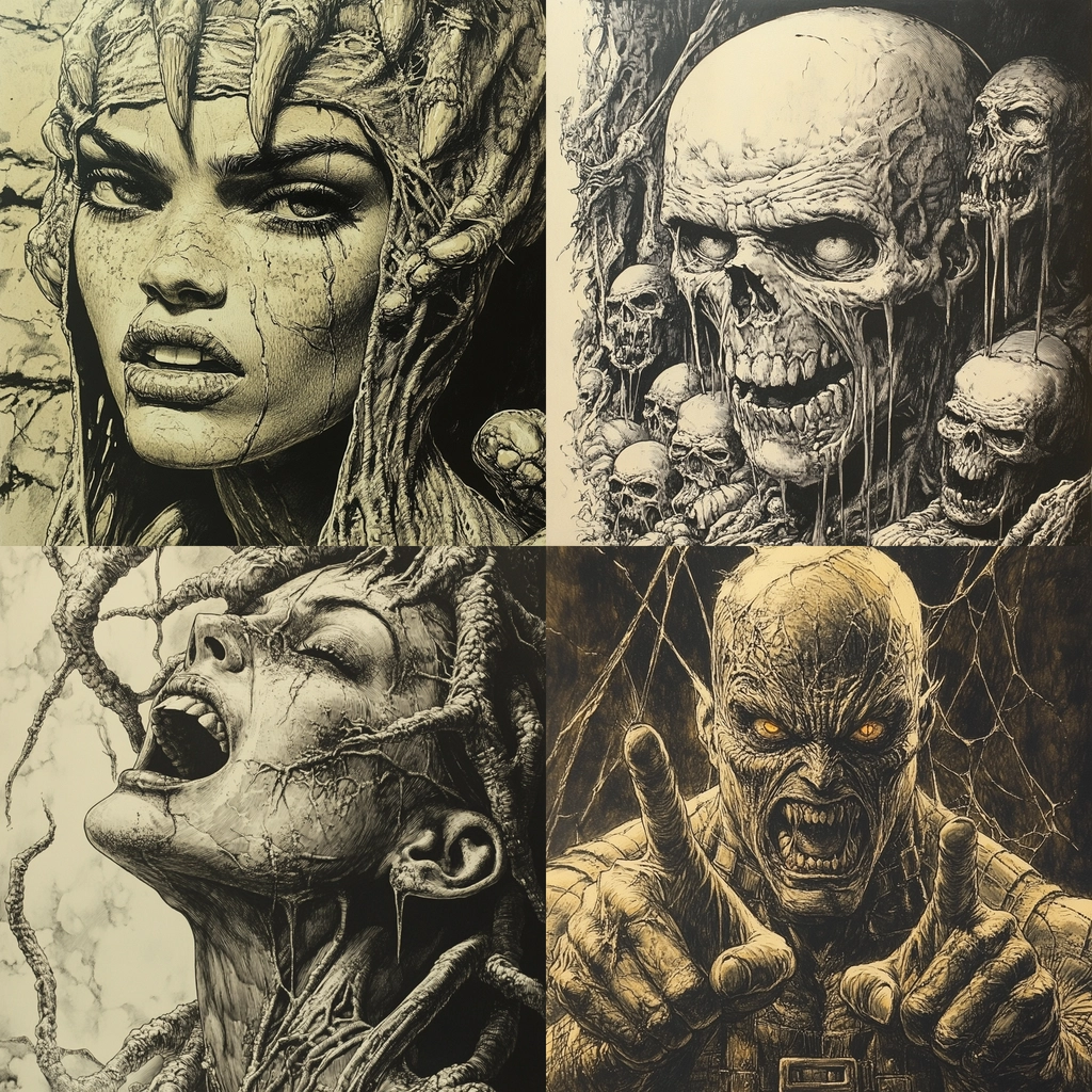 Intricate linear details and complex textures dominate the monochrome scenes.
