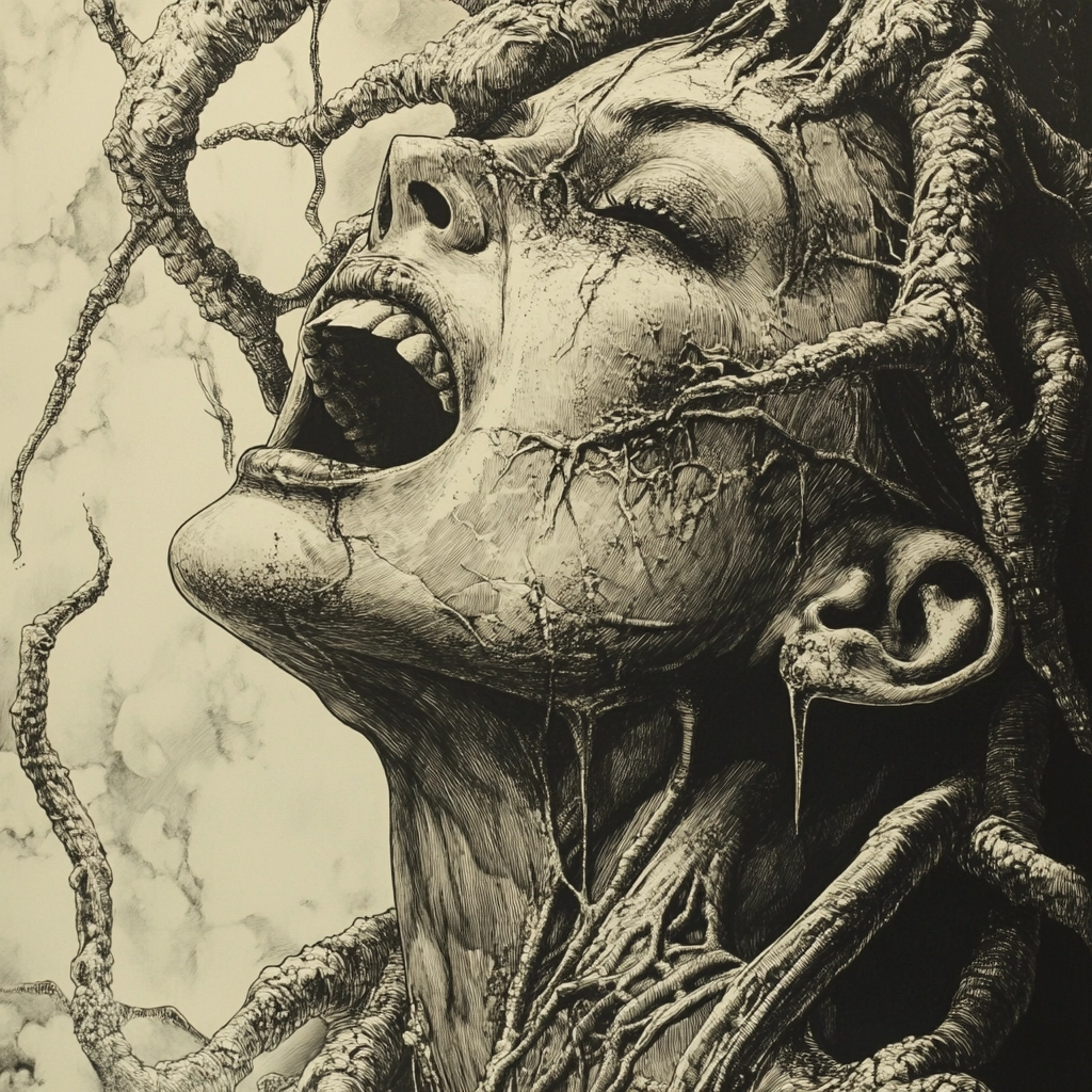 The use of stark lighting brings out the intricacies of dense textures and winding shapes, creating a striking contrast between smooth surfaces and rough, fibrous textures. The spatial sense is constructed through overlapping linear elements, amplifying depth.