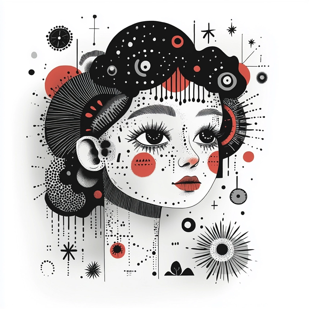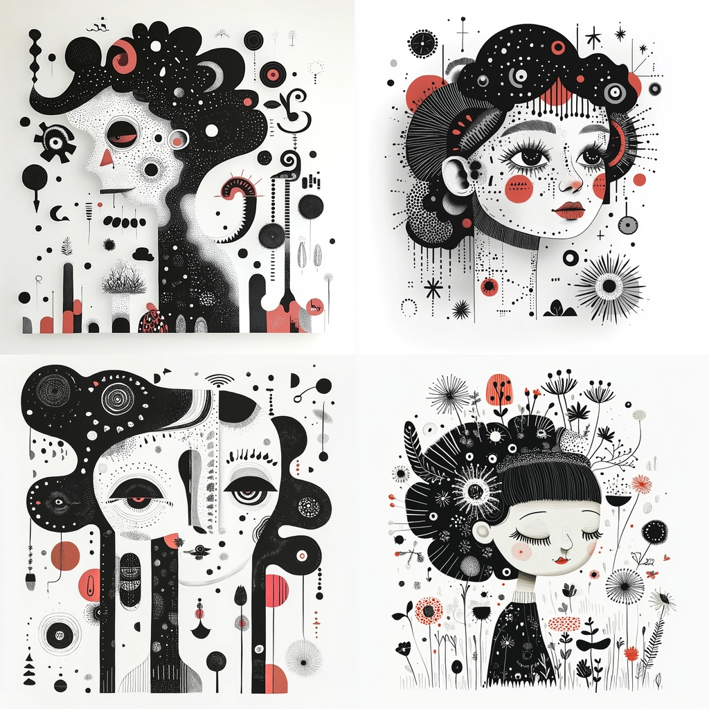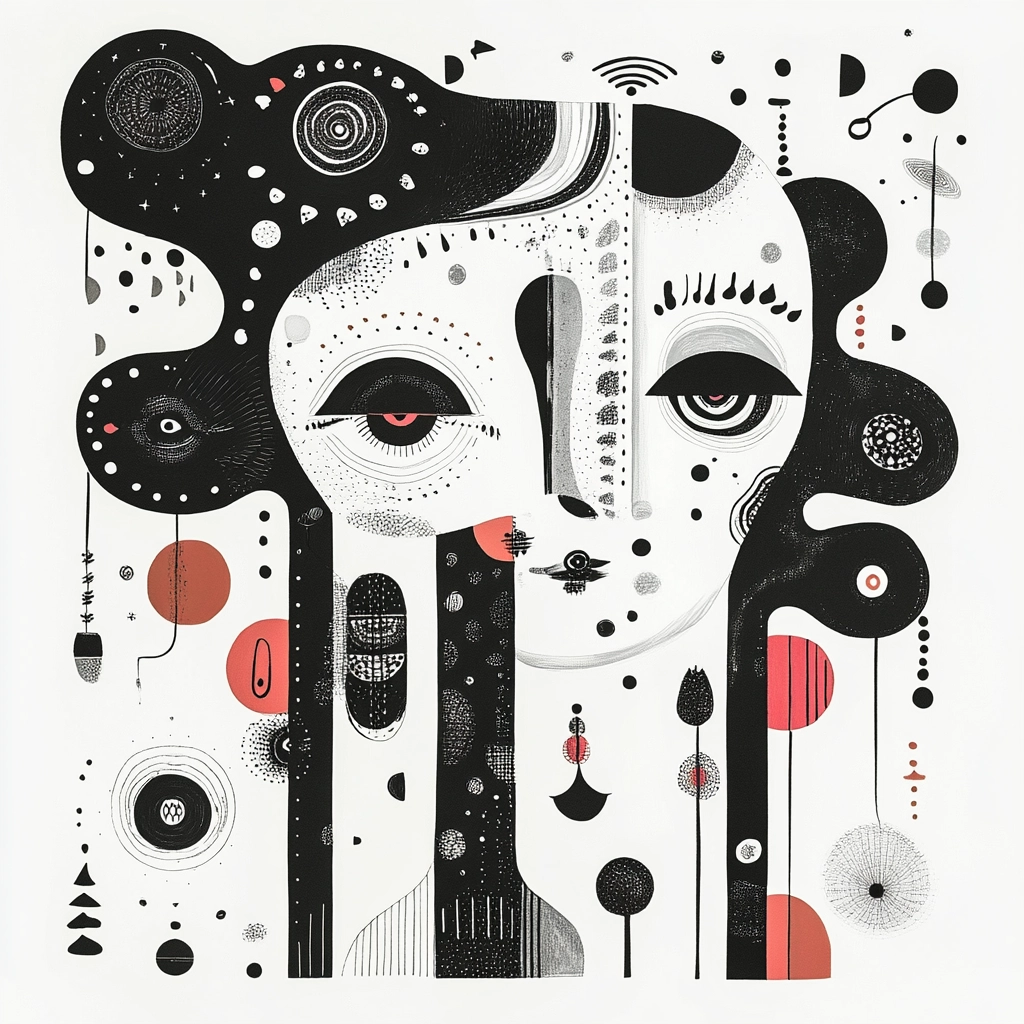 The intricate use of lighting manipulates perception, casting shadows that suggest depth, while the monochrome palette is punctuated with red, providing emphasis. Each form is crafted with texture and precision, achieving a balance between space and density.