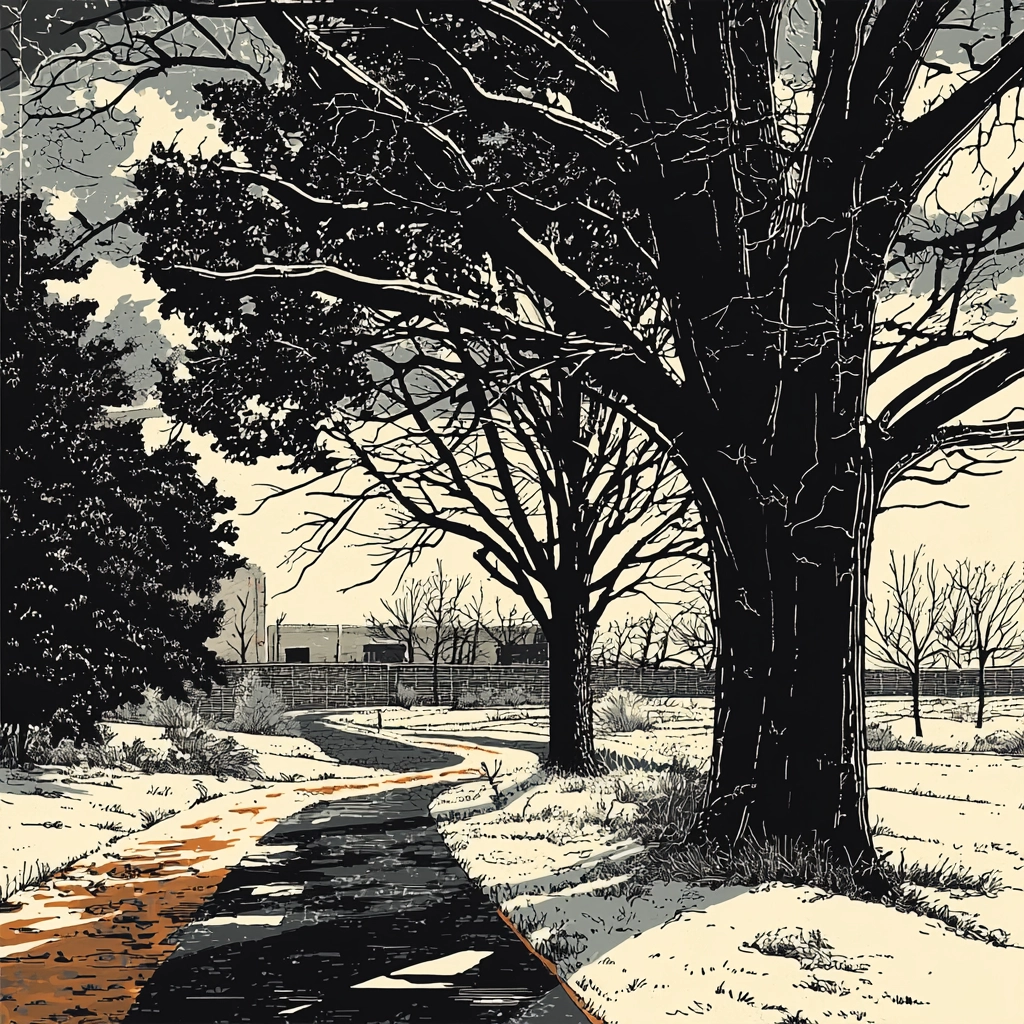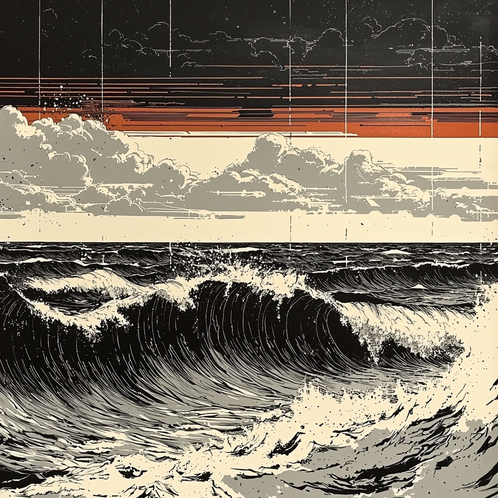 The pieces employ high contrast with stark black and white tones, punctuated by warm orange highlights. Lighting is dramatic, creating strong shadows and bold outlines. Textures are vividly rendered, enhancing depth and spatial differentiation.