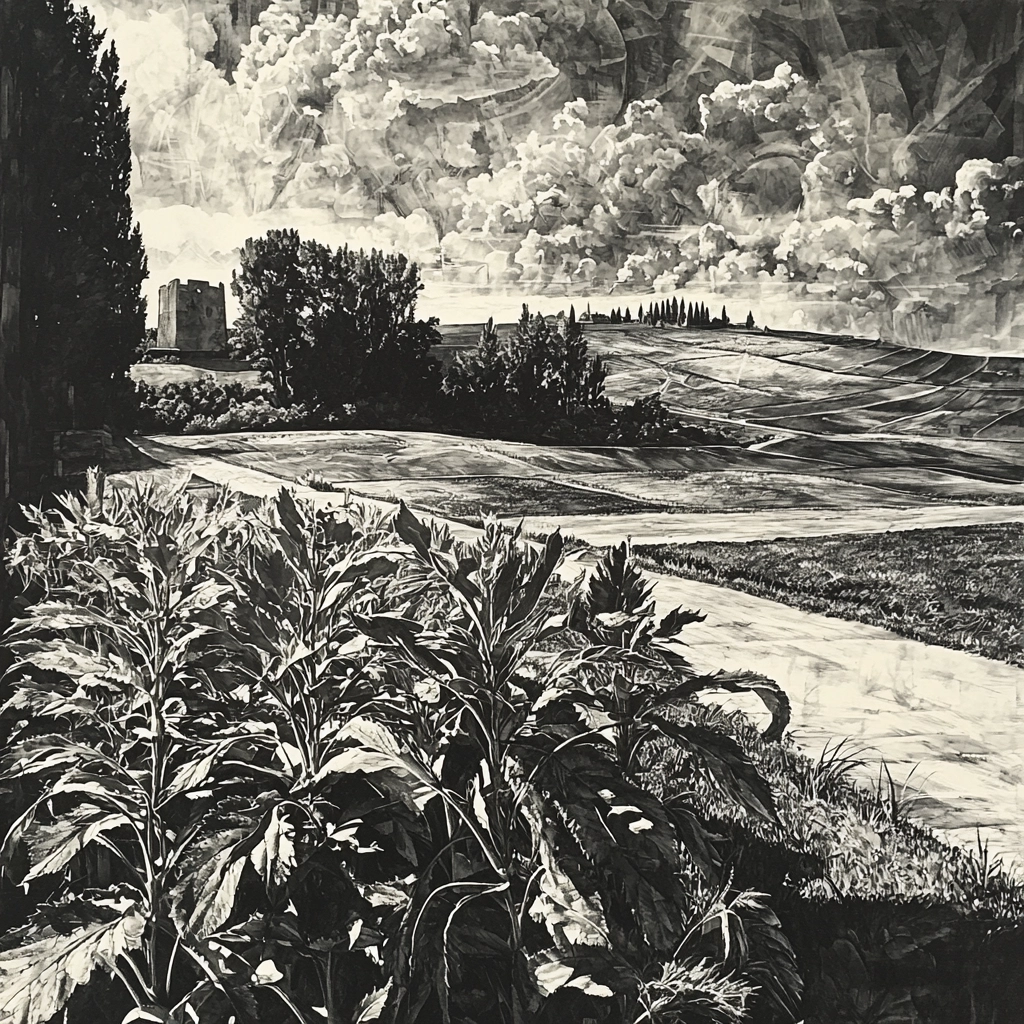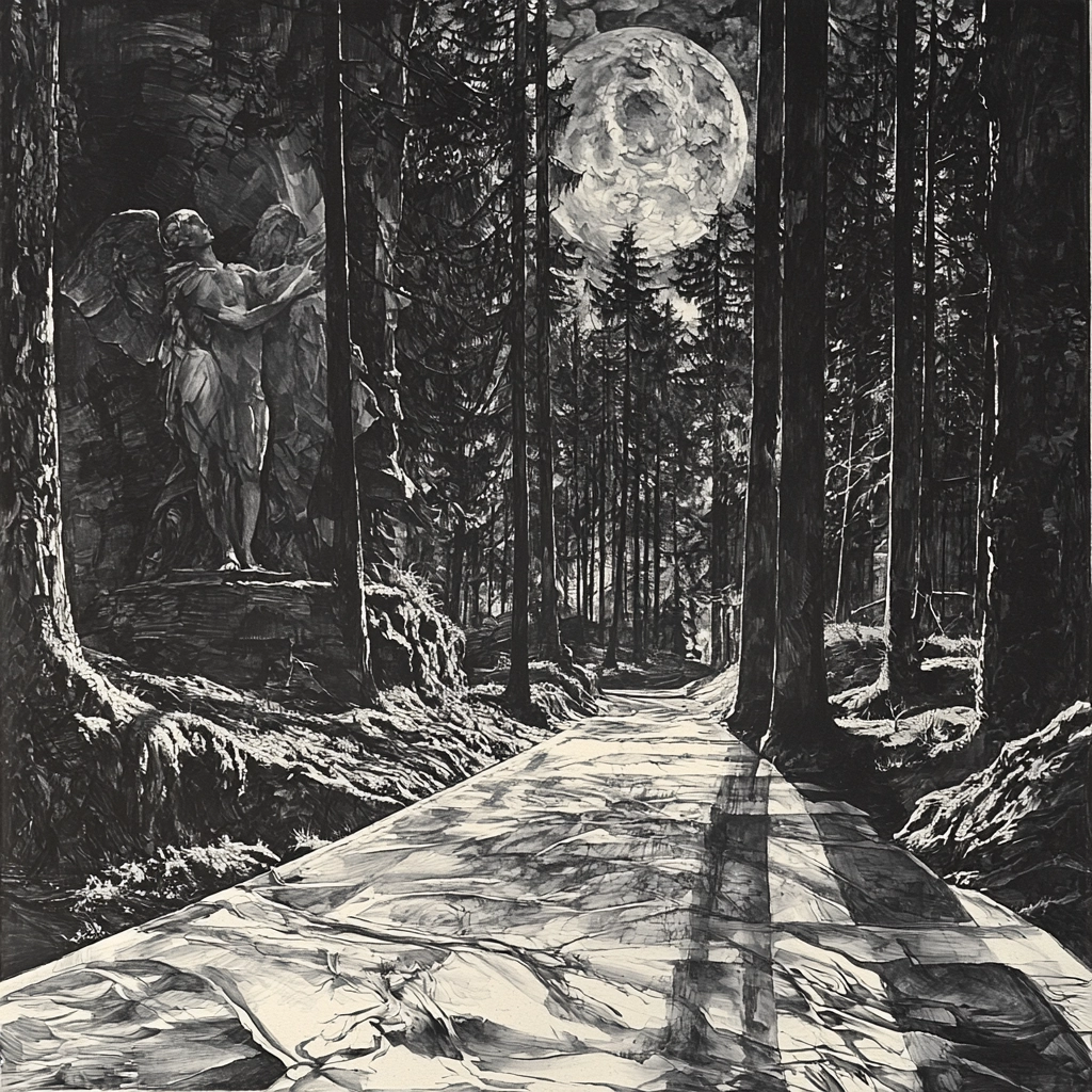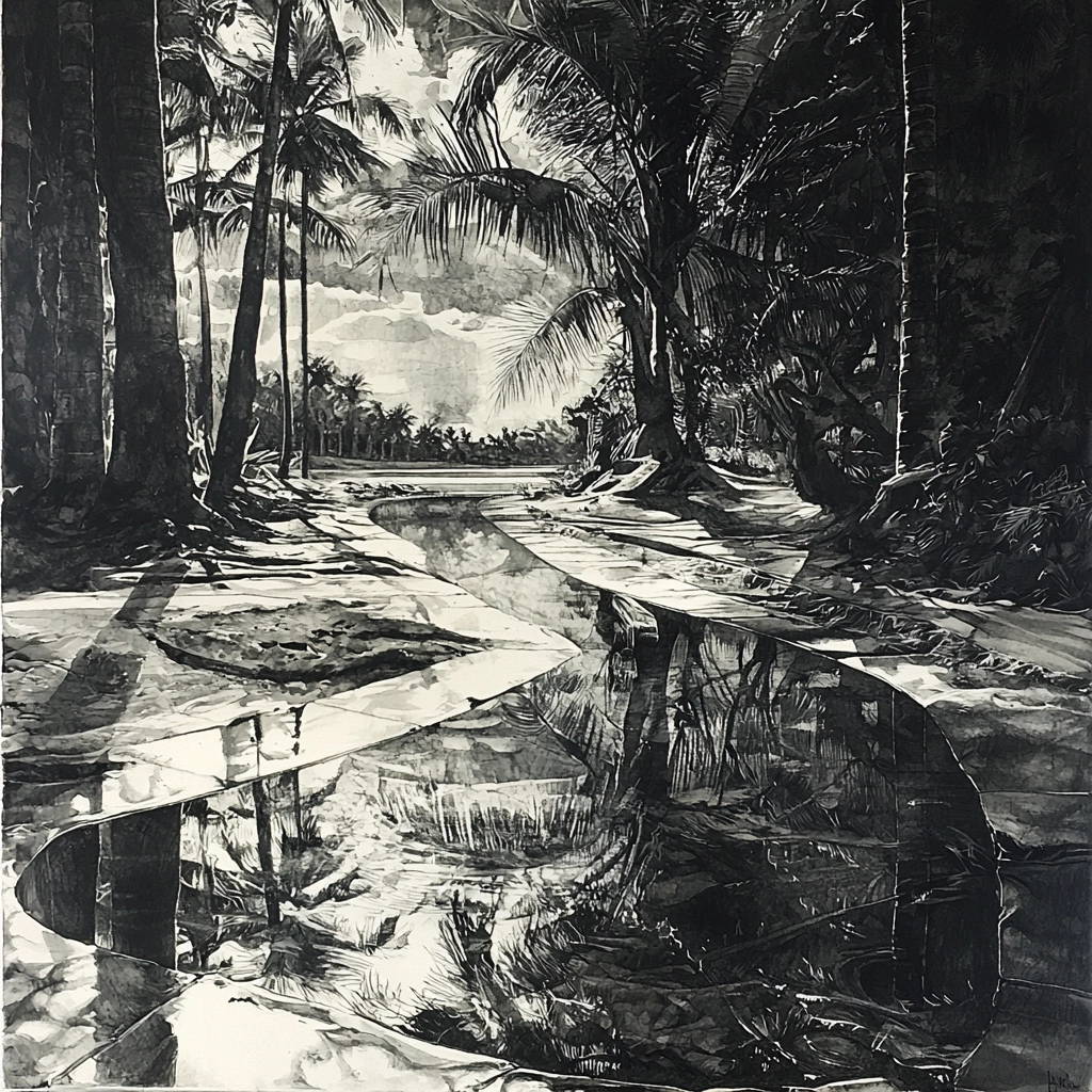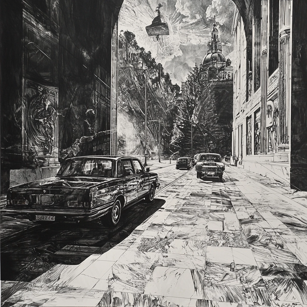 The interplay of light and shadow creates a dramatic spatial depth, with a keen emphasis on texture and detail. The grayscale palette reinforces contrasts, enhancing the perception of dimensionality and structure within the scenes.