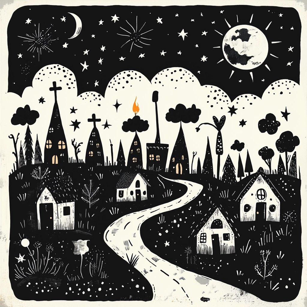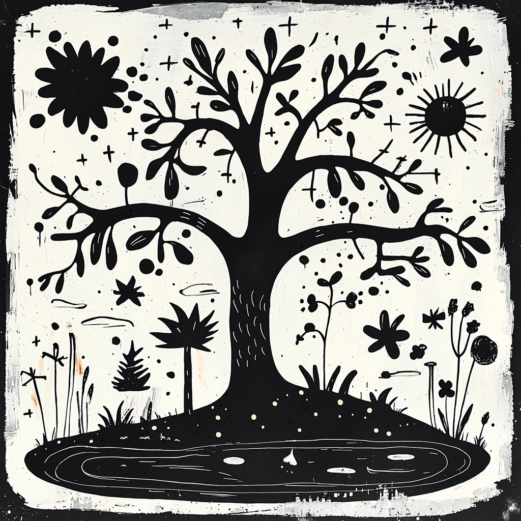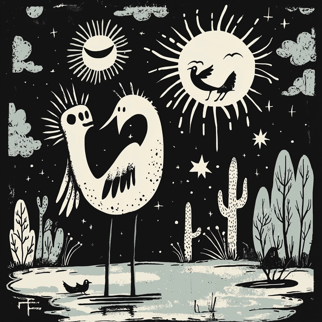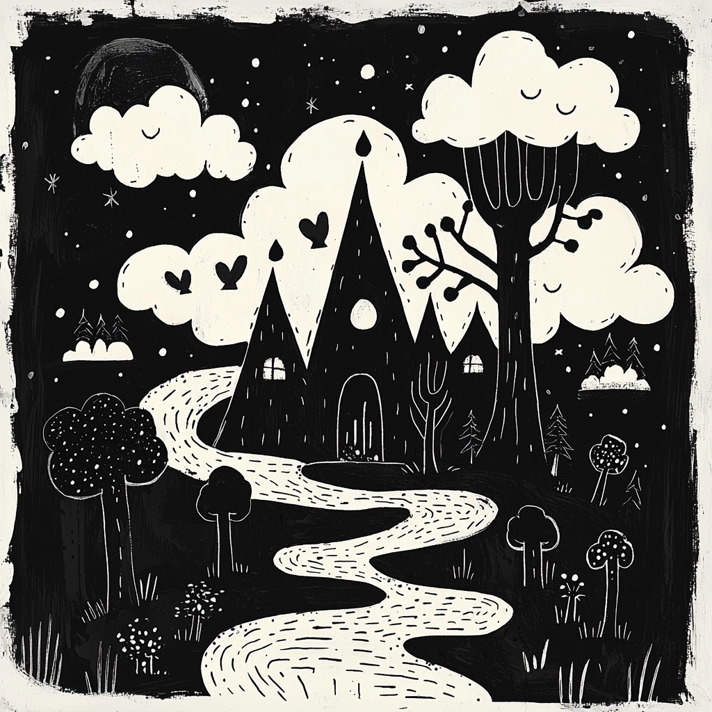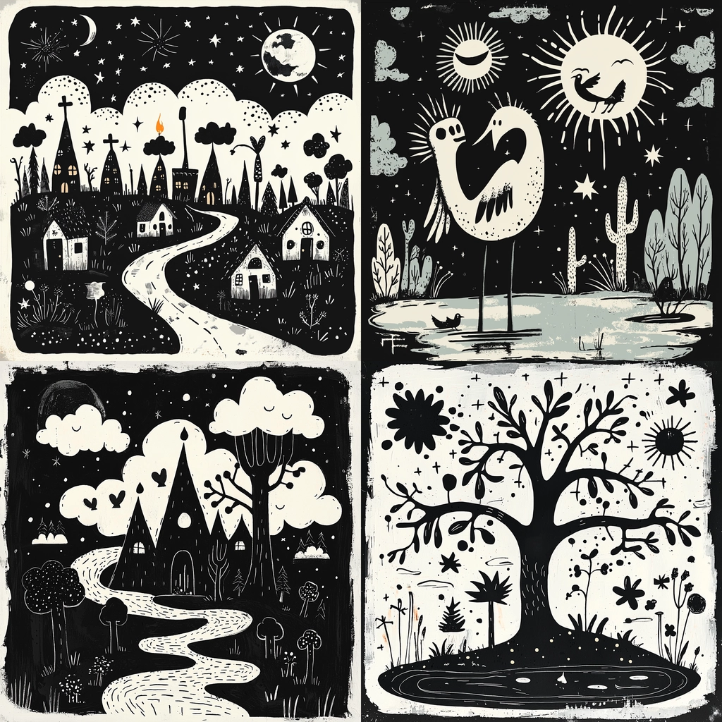 The monochrome color palette creates stark contrasts, accentuating playful forms and simple shapes. Lighting effects are minimal yet effective, producing a flat but bold impression. Textures are smooth, conveying naive outlines against a uniform backdrop.