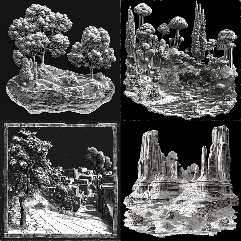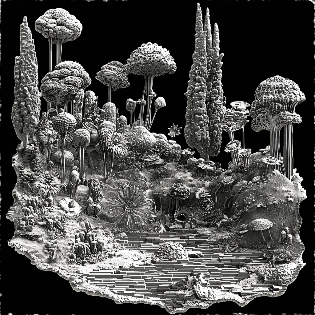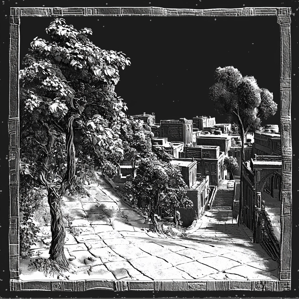 Intricate black and white detailing creates a contrast-rich visual narrative.