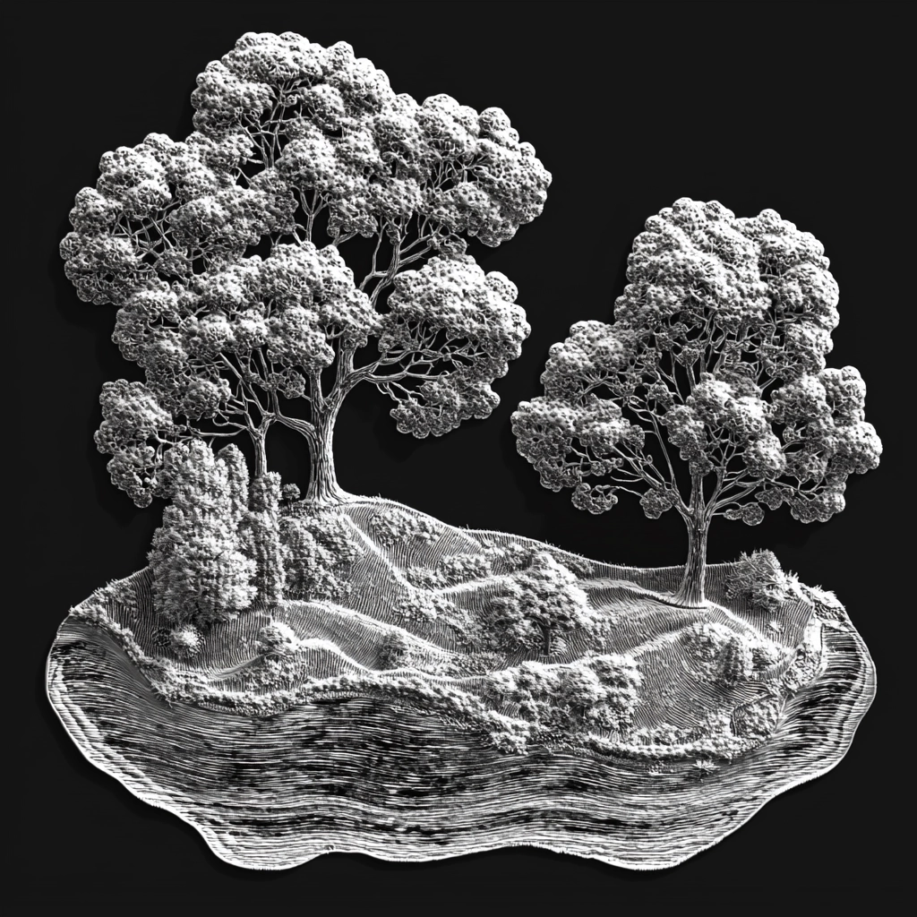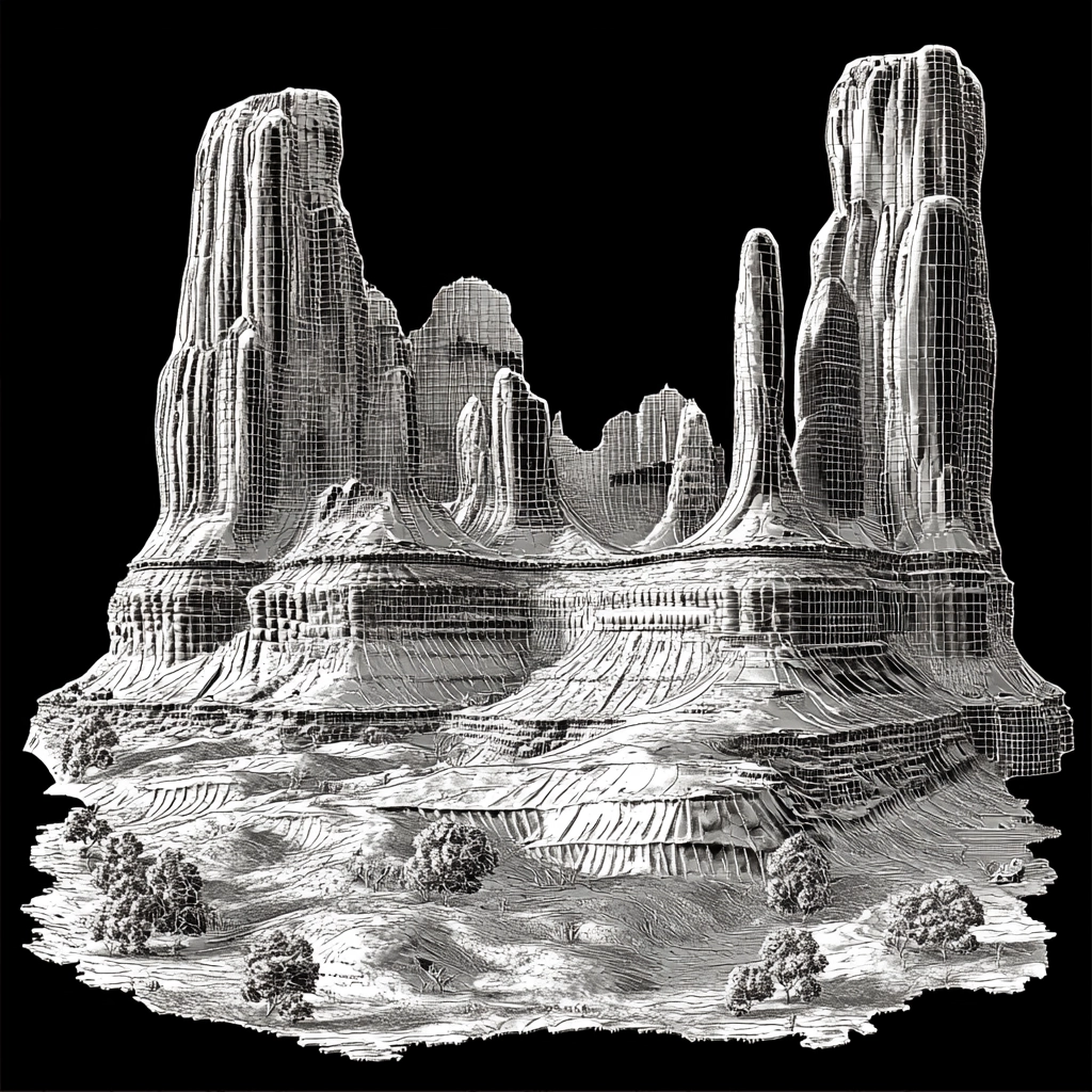 The use of stark black and white produces strong illumination effects, emphasizing texture and depth. The precise detailing in the texture captures the viewer's interest while the disciplined use of negative space evokes a sense of vastness and perspective.