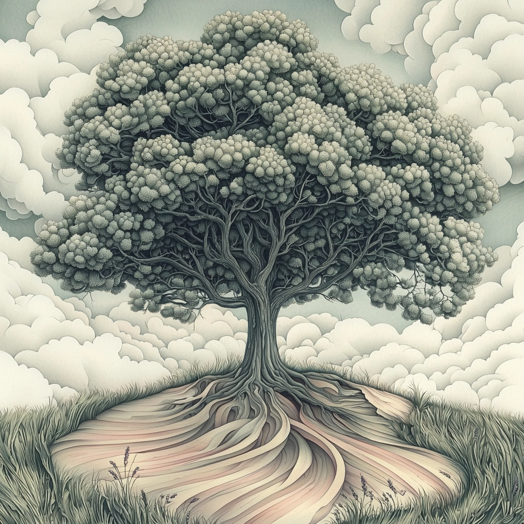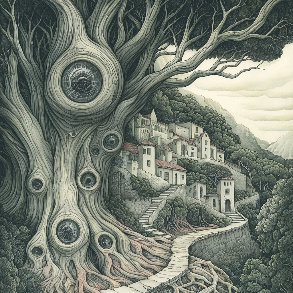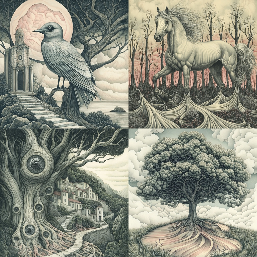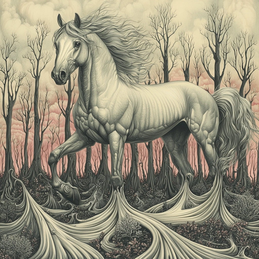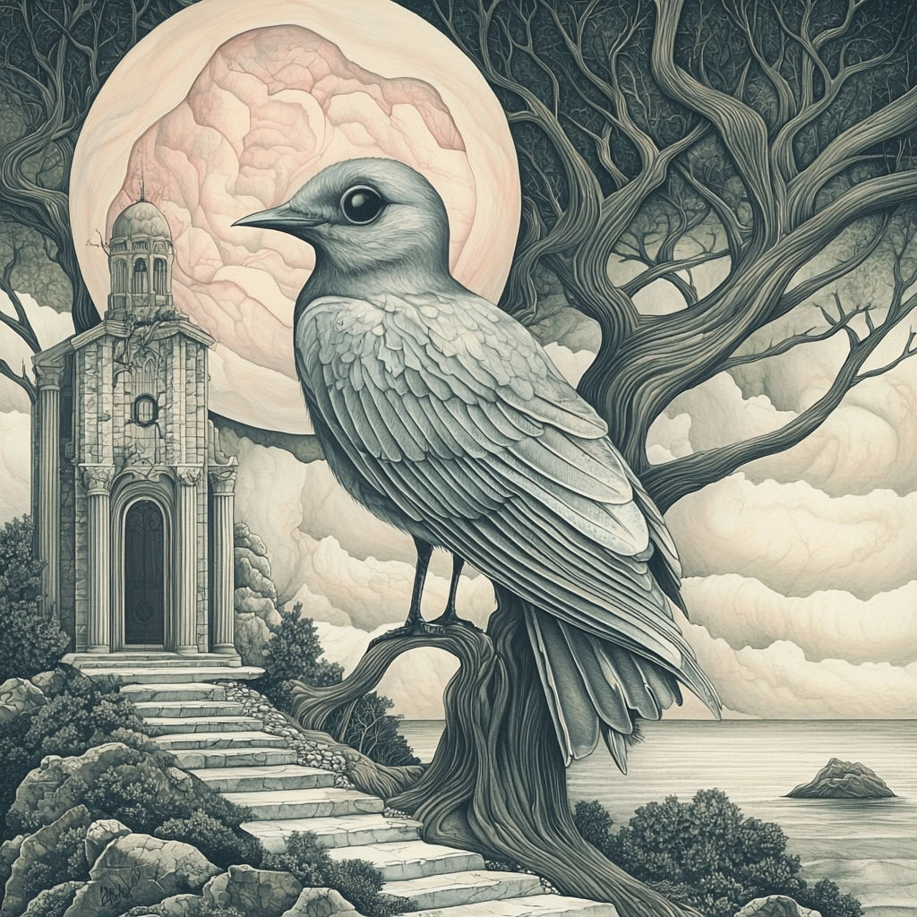Subtle lighting highlights complex forms and creates depth, with gray tones providing contrast and texture. Fine lines enhance the detailed rendering, generating a clear spatial differentiation across layered foreground and background elements.