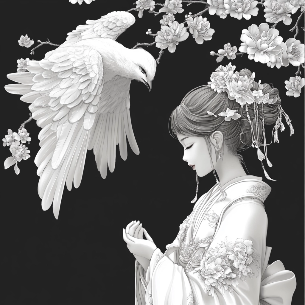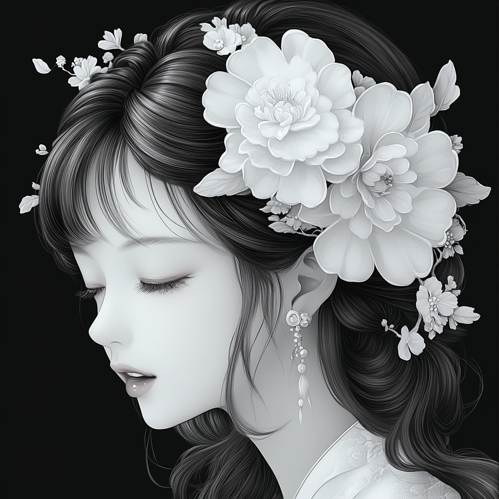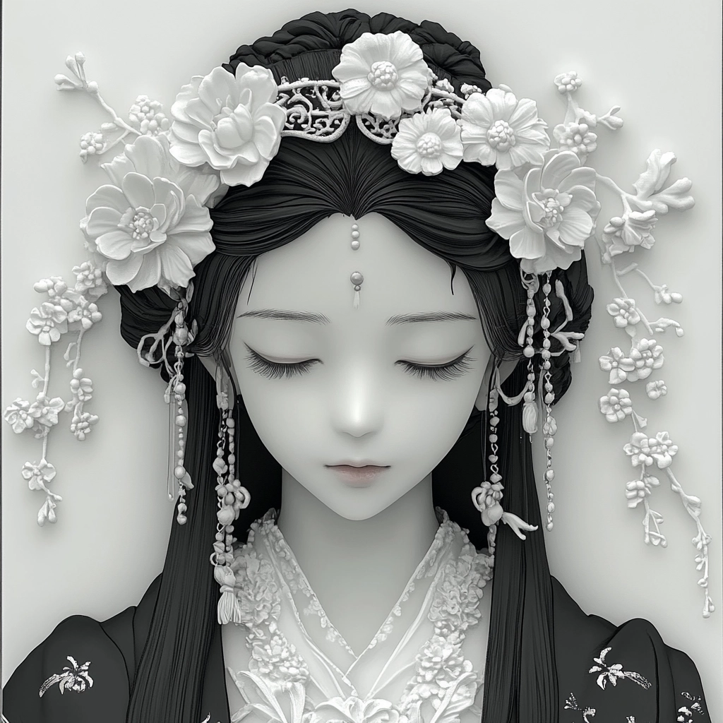 Lighting reveals intricate details in textures while maintaining a sense of depth and subtle spatial gradients. The controlled use of monochrome highlights precise floral and textile motifs, lending a sense of timeless elegance without overwhelming complexity.