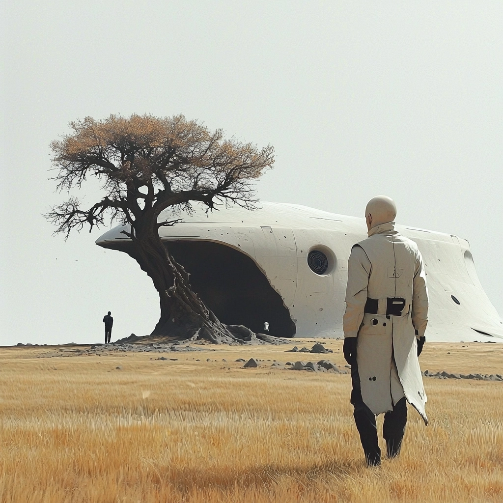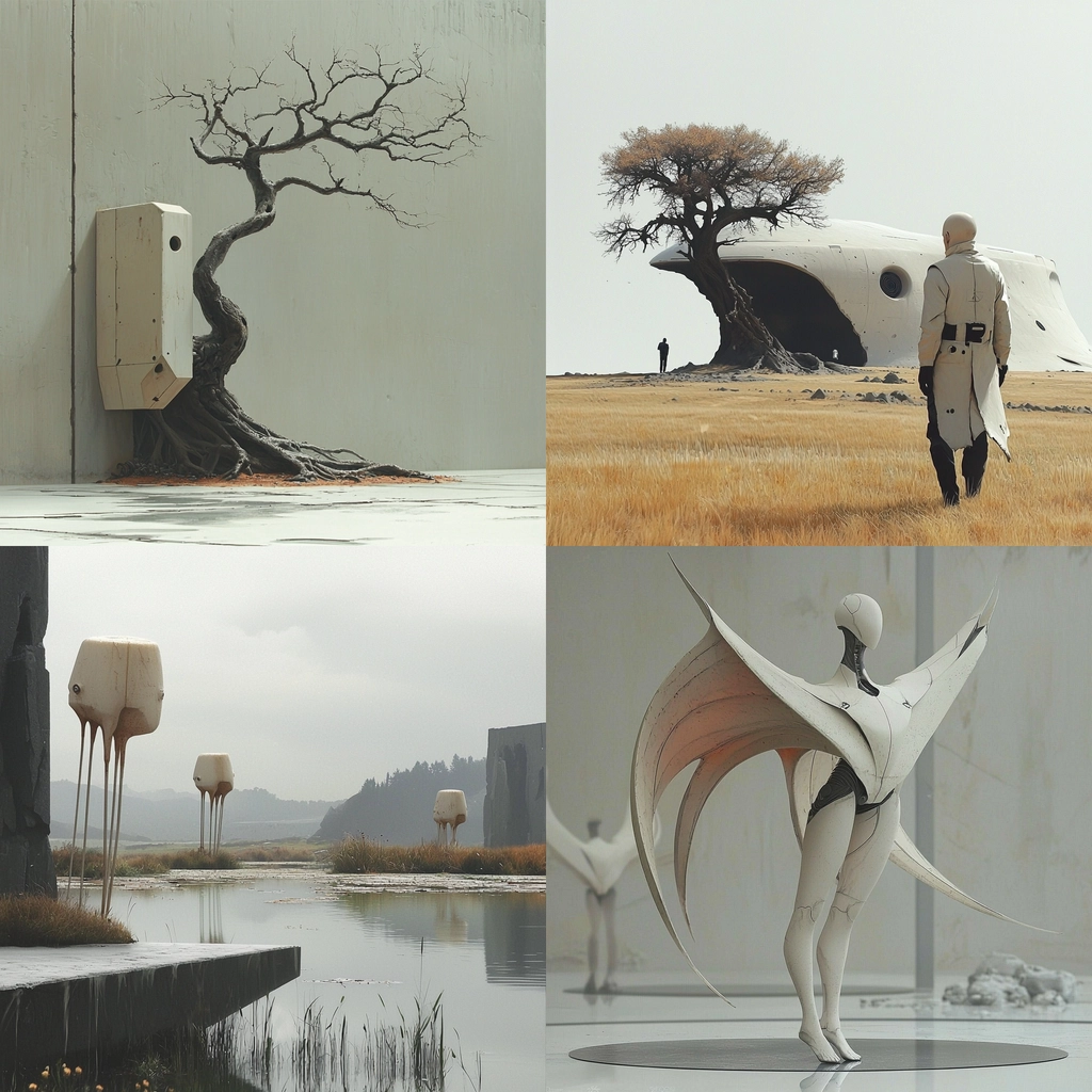 The artwork exhibits a modern futuristic theme with a restrained color palette focused on gray and beige tones, which create a cohesive and conceptual experience.