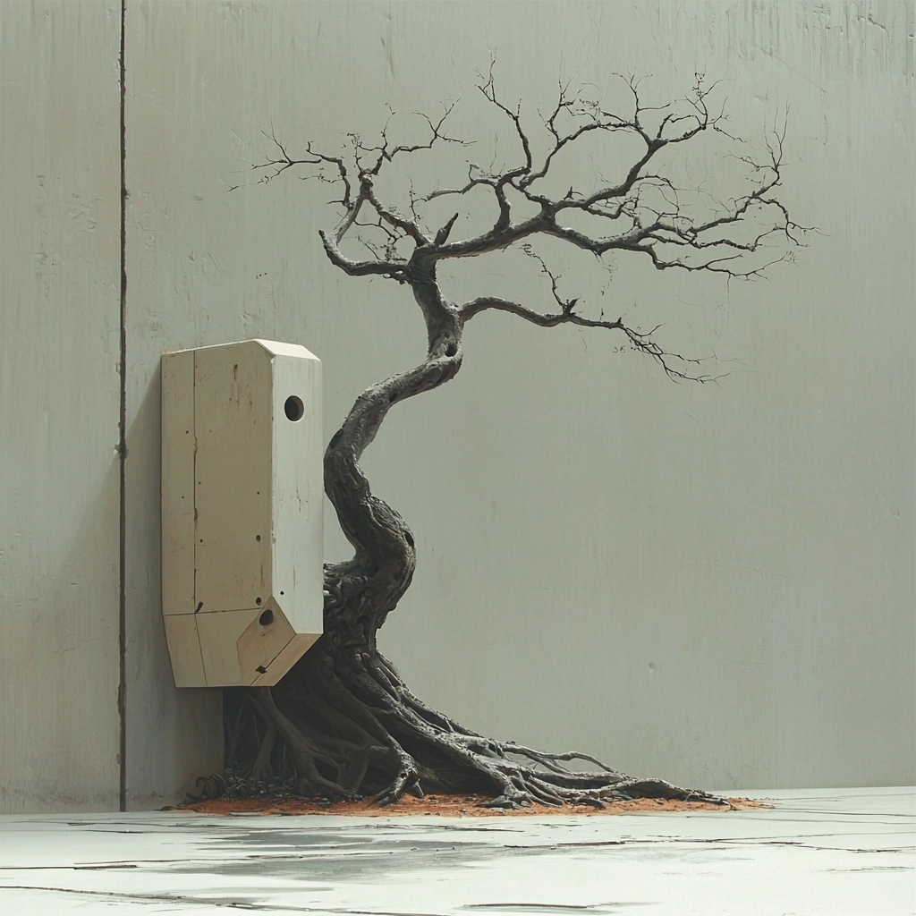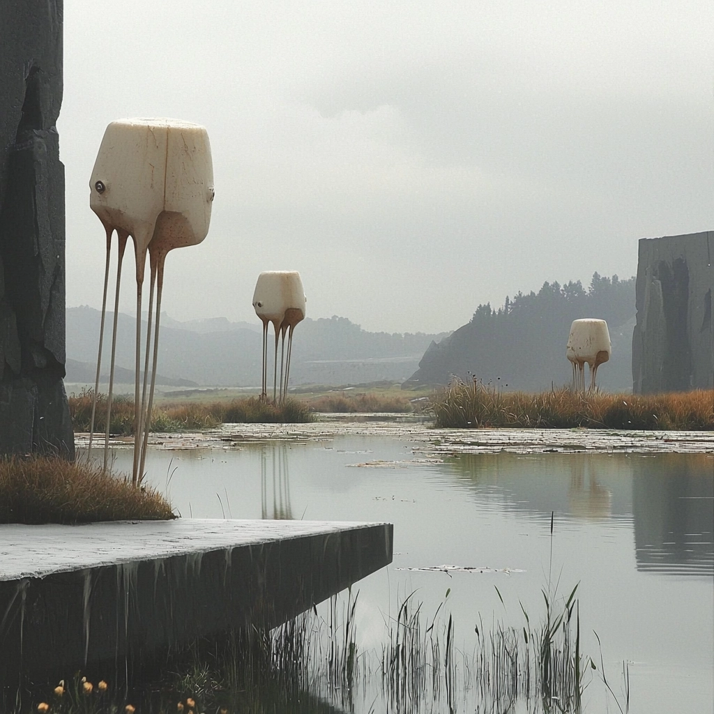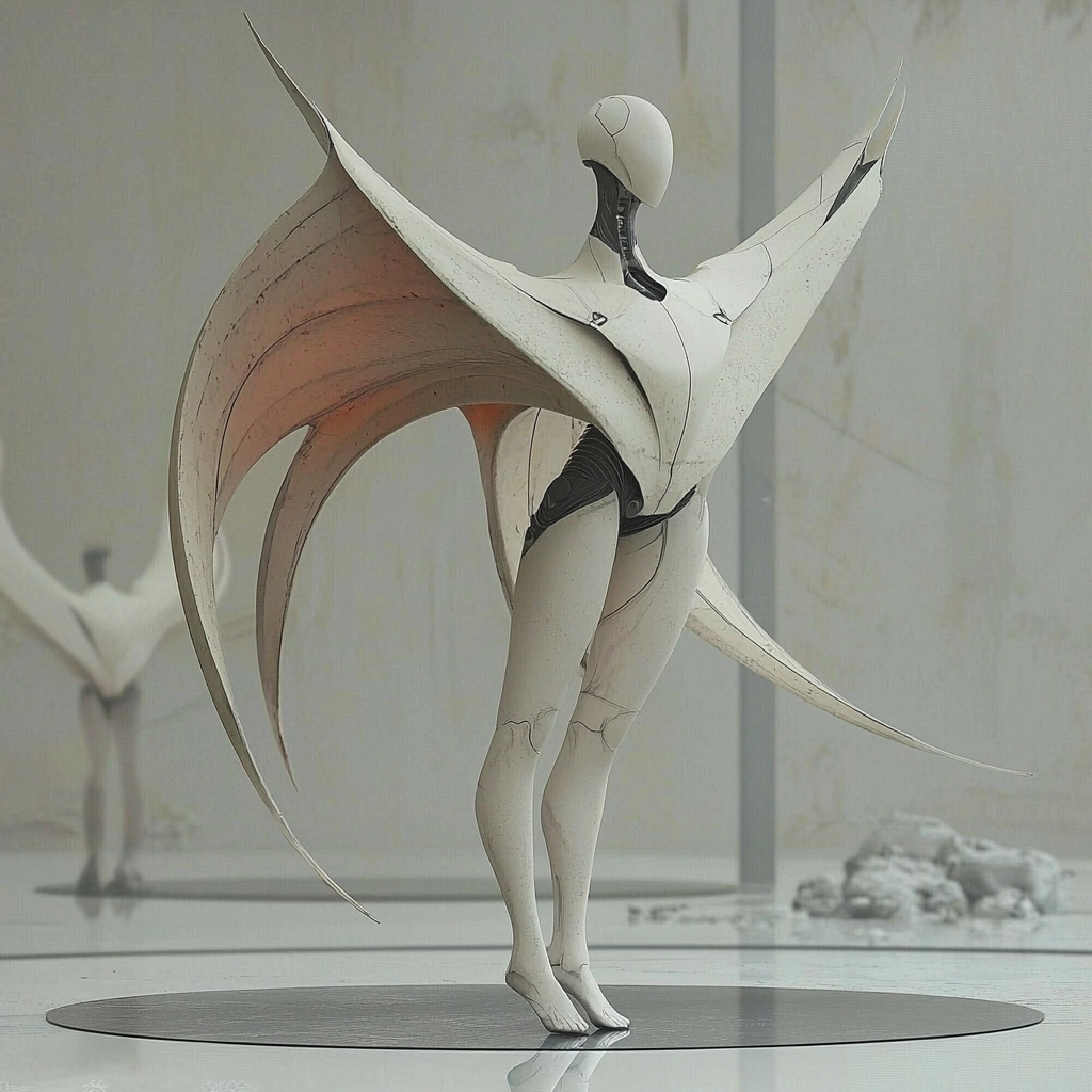 The pieces utilize subtle gradients and neutral shades, establishing a sense of depth with minimalistic lighting. The smooth textures are contrasted by sharp outlines, producing a striking balance that highlights the interaction between geometric forms and organic display.