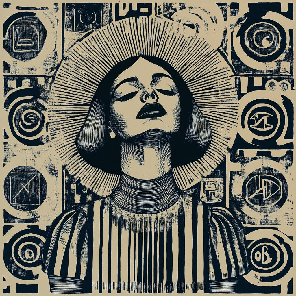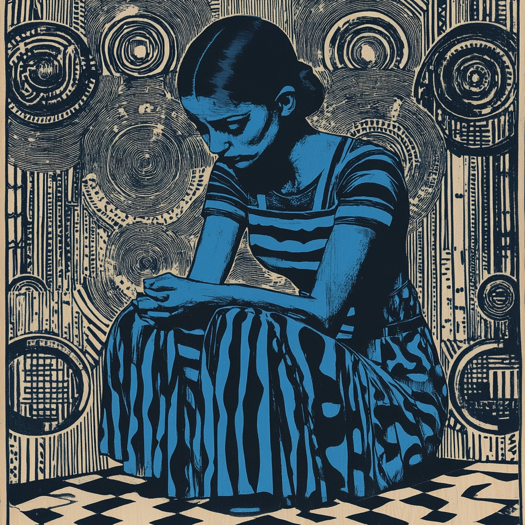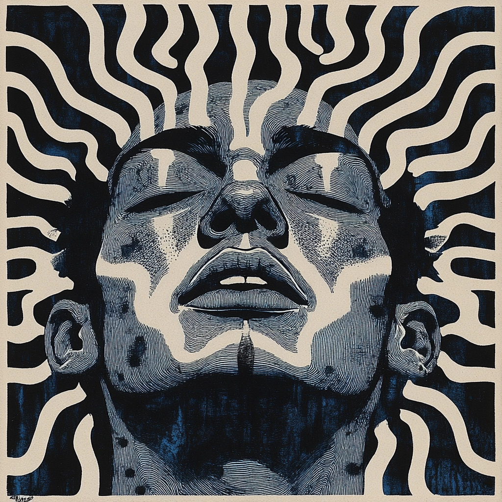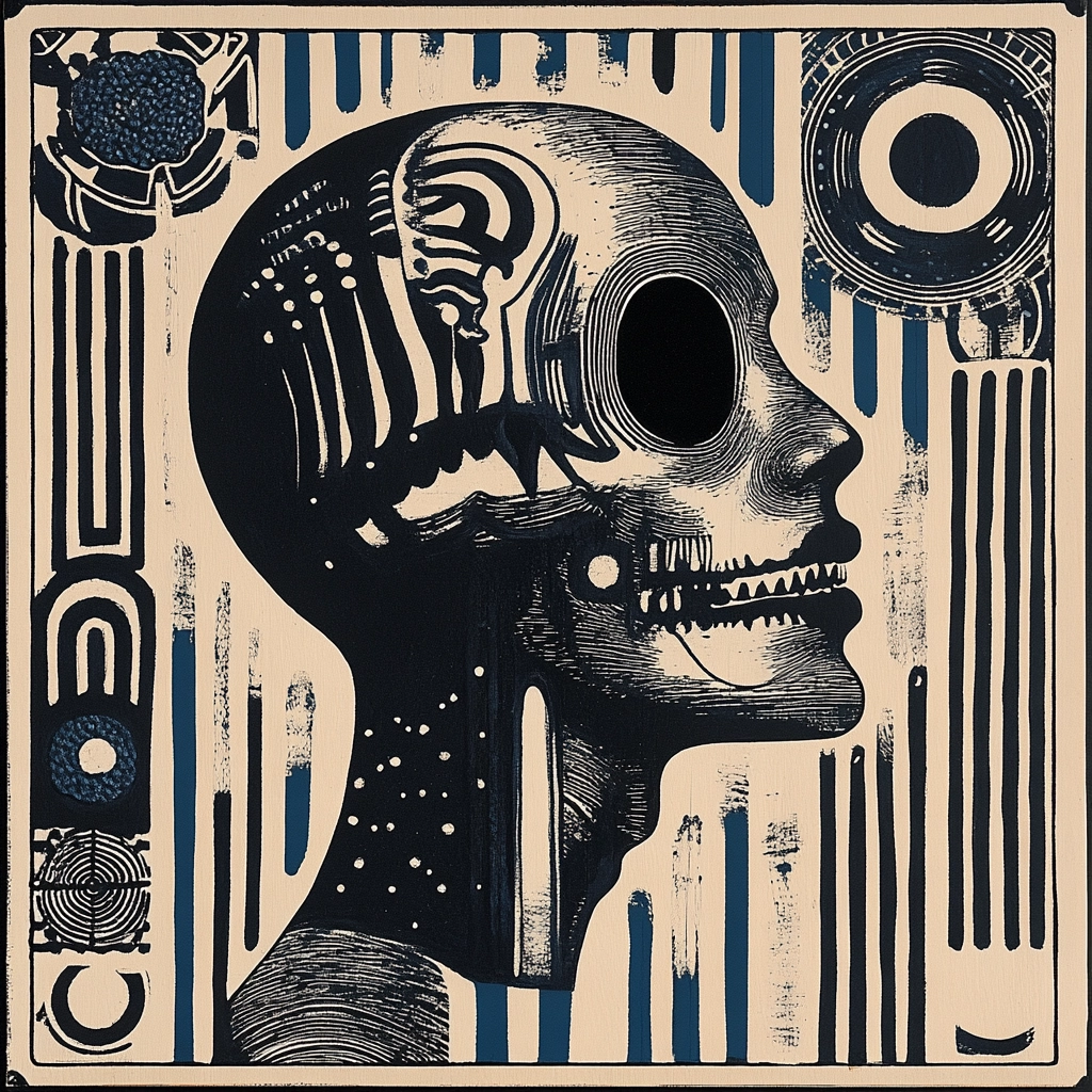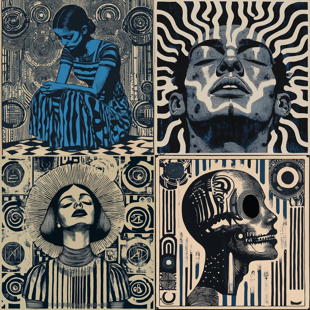 The pieces showcase high-contrast lighting with prominent geometric lines and shapes, creating a textured illusion of depth. The dark tones enhance the intricate details and visual complexity.