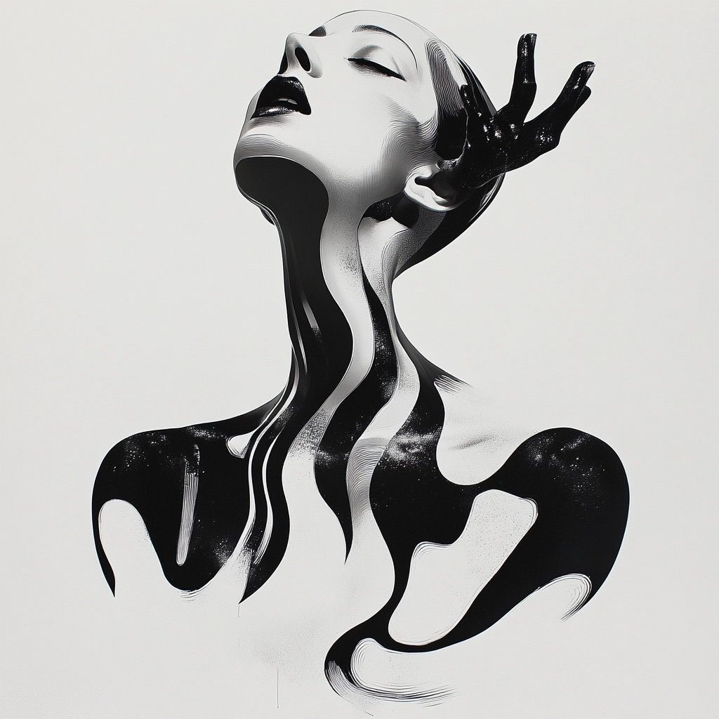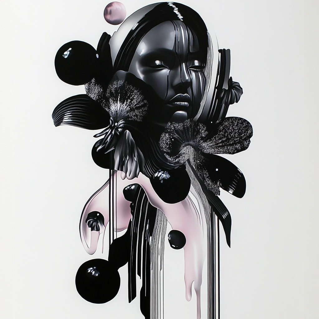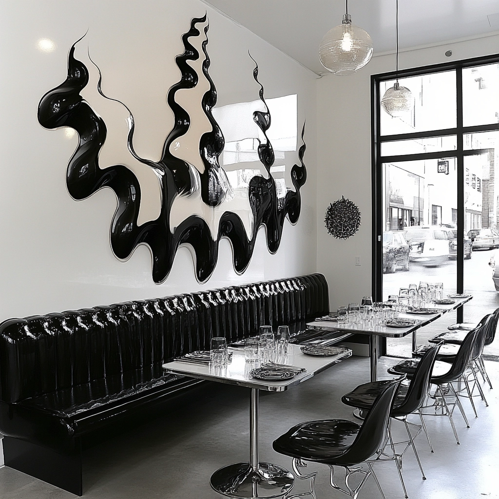 High-contrast black and white compositions emphasize glossy surfaces and fluid contours, combining sharp silhouette profiles with reflective textures to create dynamic visual tension within a minimalist spatial setting.