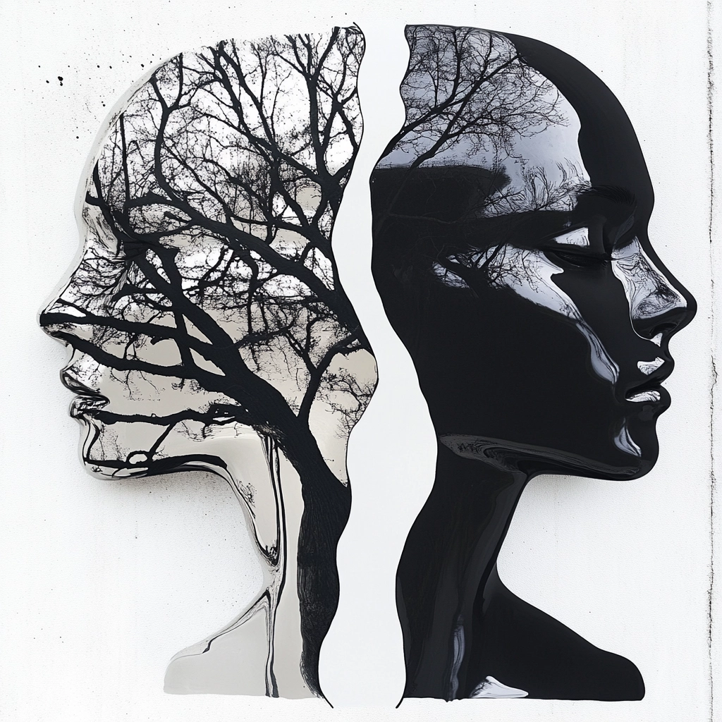 Lighting is directed to enhance the reflective quality of smooth, glossy surfaces, generating strong highlights and deep shadows. The monochrome palette emphasizes contour and form, with spatial depth suggested through overlapping shapes and subtle gradients. Textural contrast arises between polished, shiny elements and matte backgrounds, sharpening visual focus and structure.