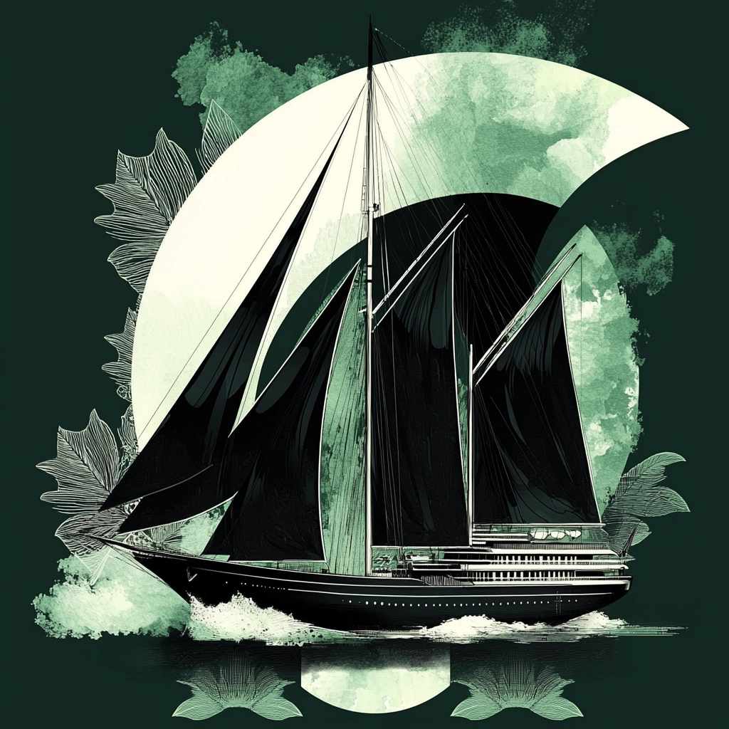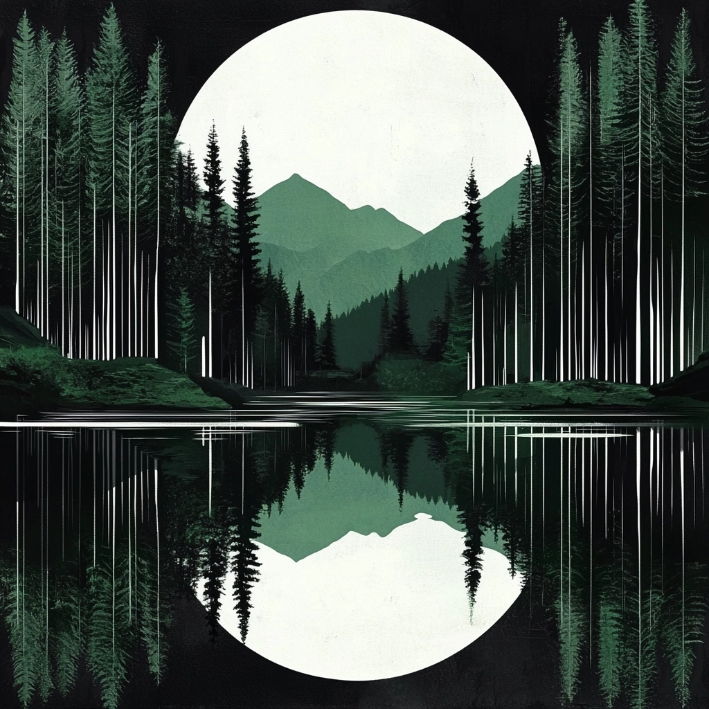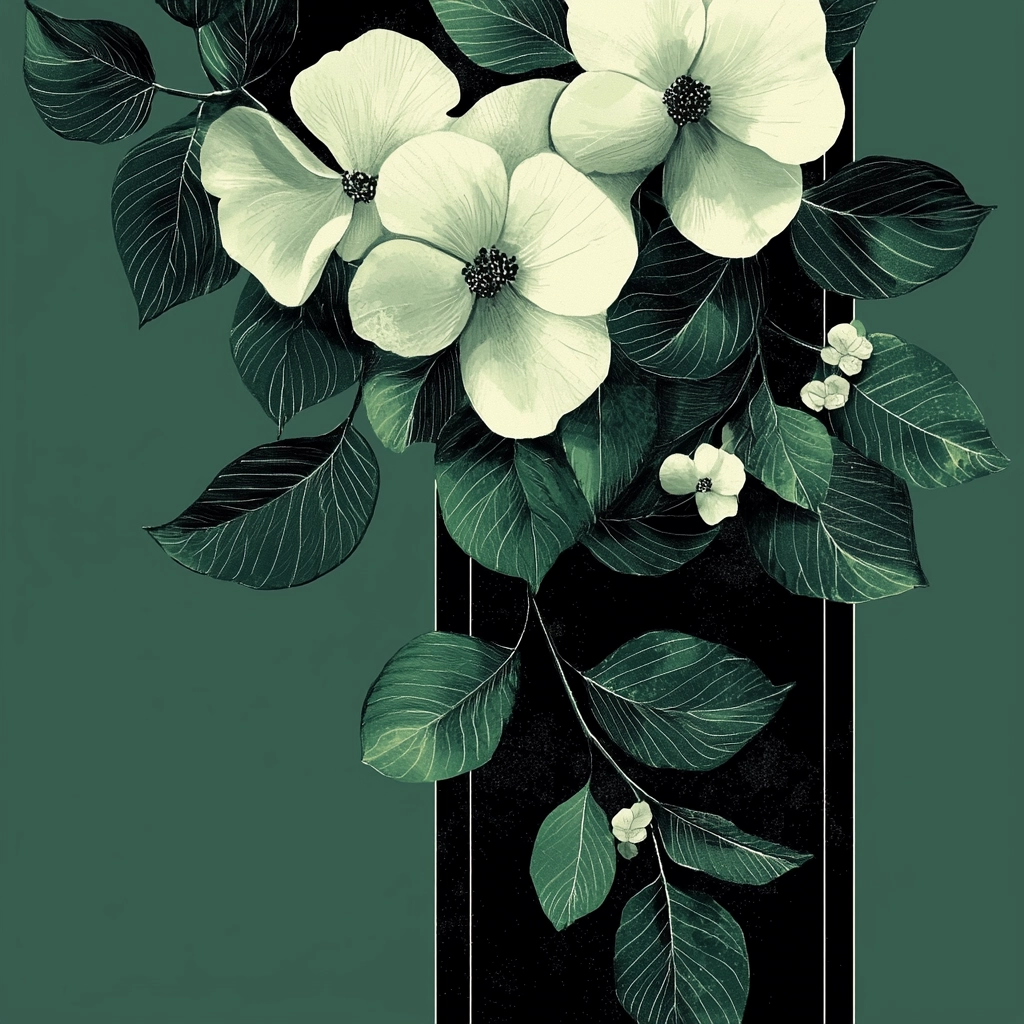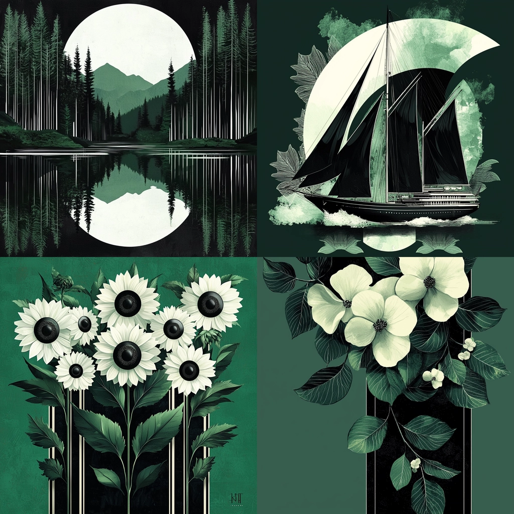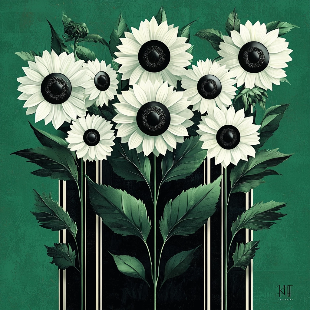 Crisp delineation enhances structured forms, balanced by predominantly green hues, which establish harmony. High contrast with black and white boosts the definition, setting off the central focus with deliberate clarity and refined textures.
