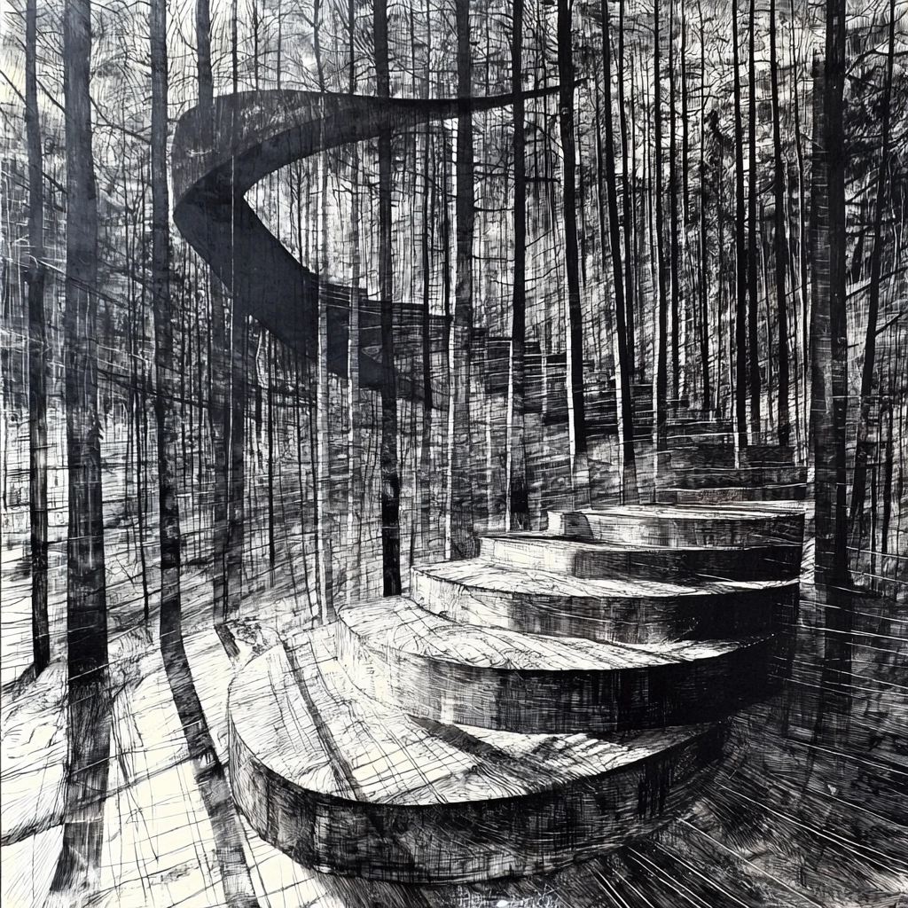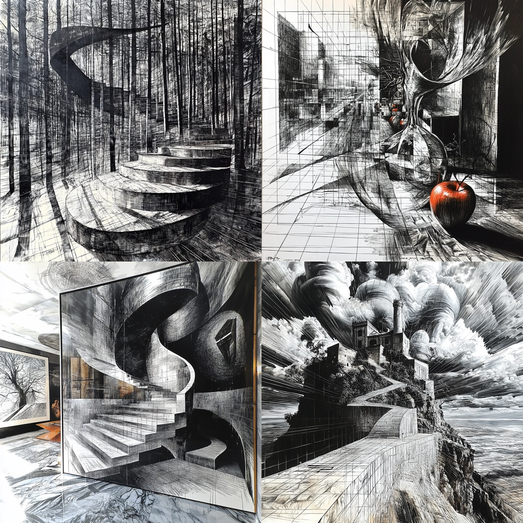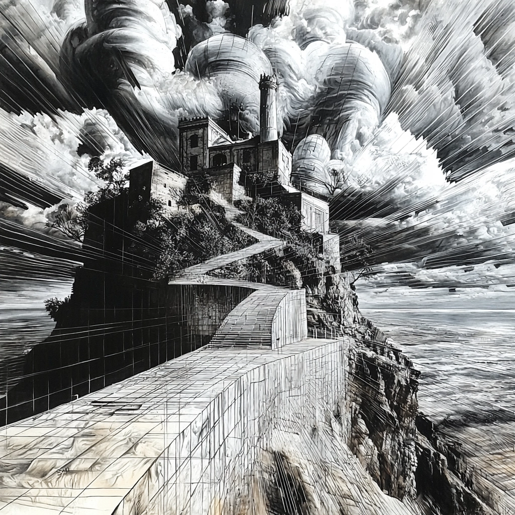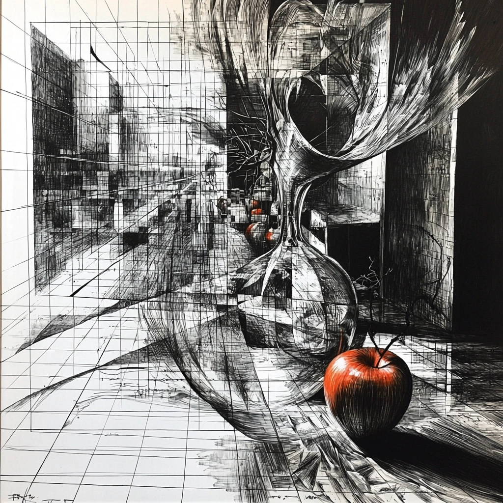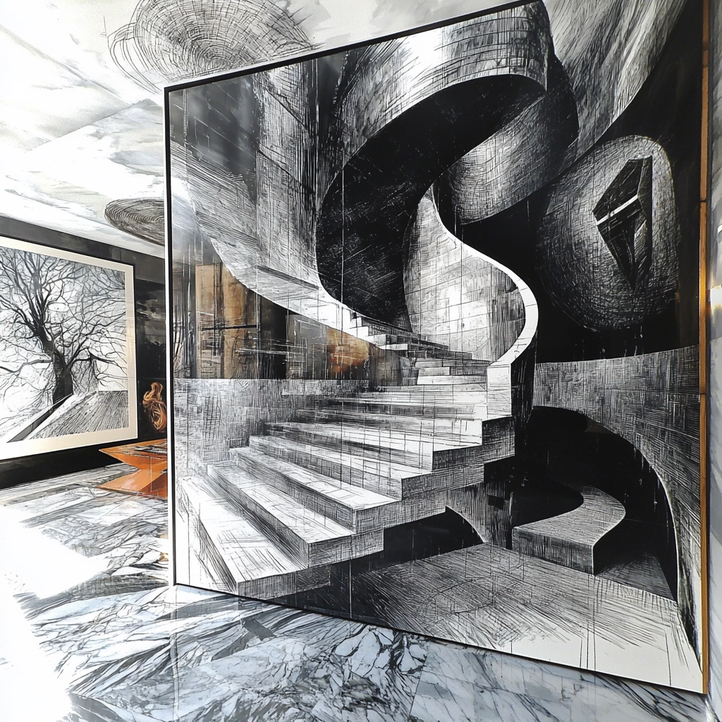 The interplay between light and shadow creates intense contrasts enhanced by sharp lines and detailed textures. The grid patterns introduce a sense of structure and depth while the grayscale palette adds a striking visual tension, amplifying the spatial complexity and textural richness.