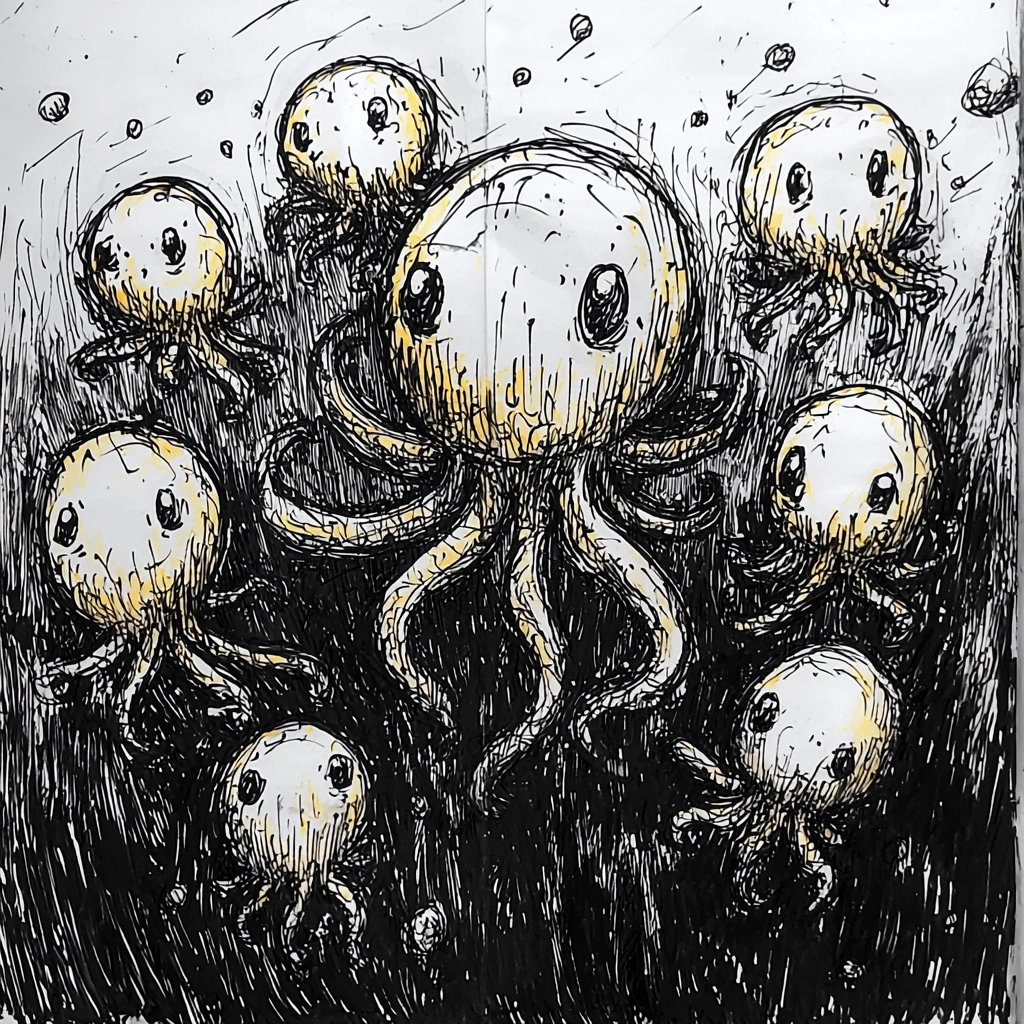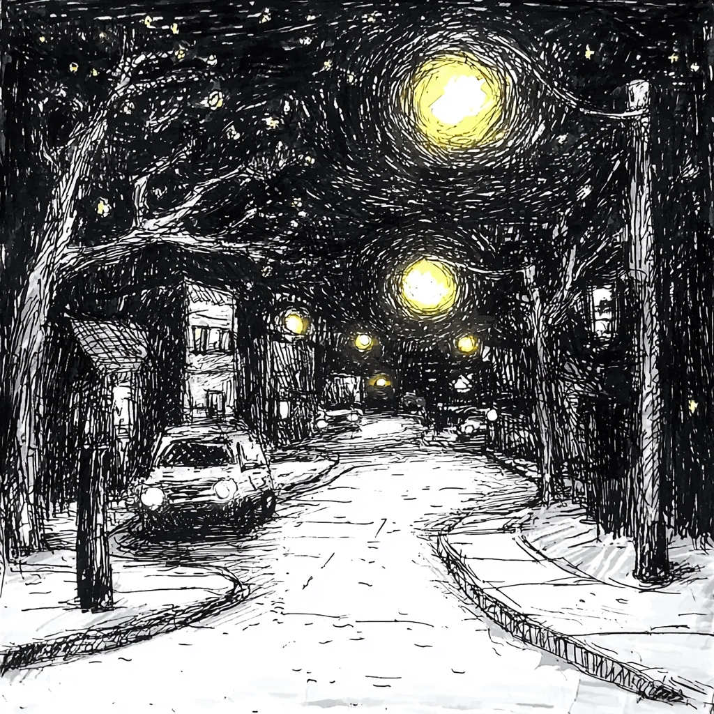 The use of strong ink lines creates a realistic texture, enhanced by spotlight effects that punctuate the composition. Yellow areas add focus and depth, while the monochrome palette intensifies spatial relationships and contrasts.
