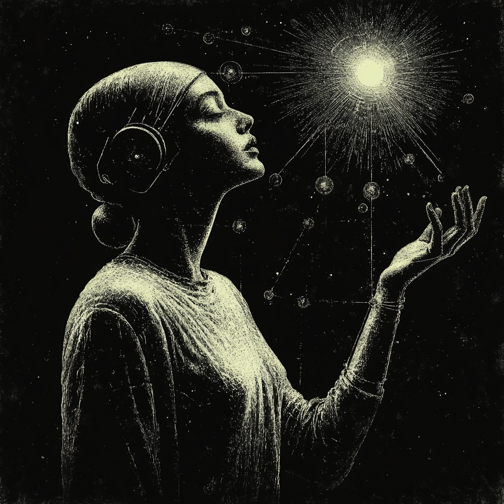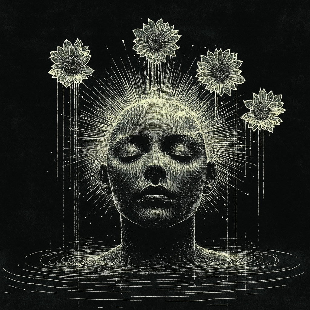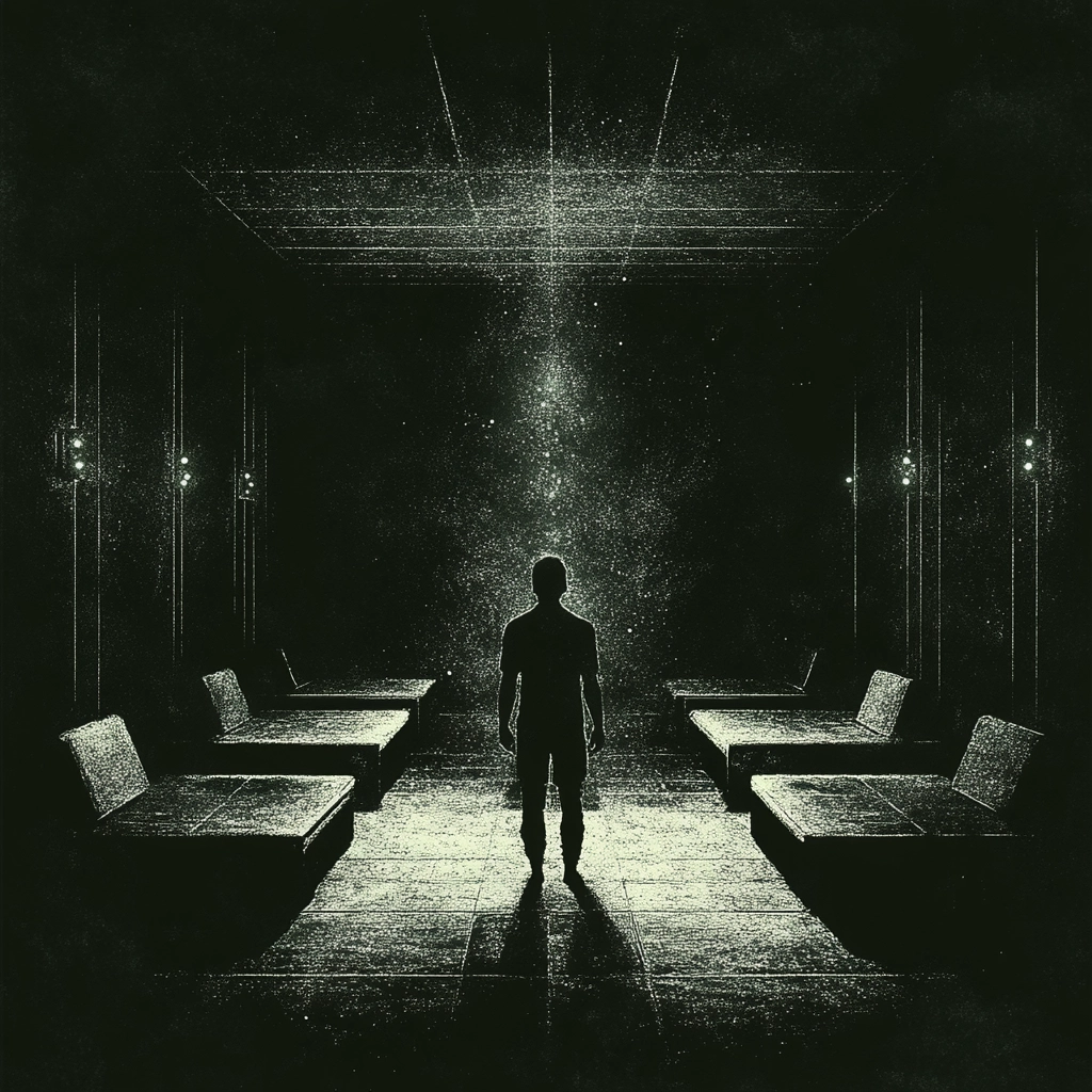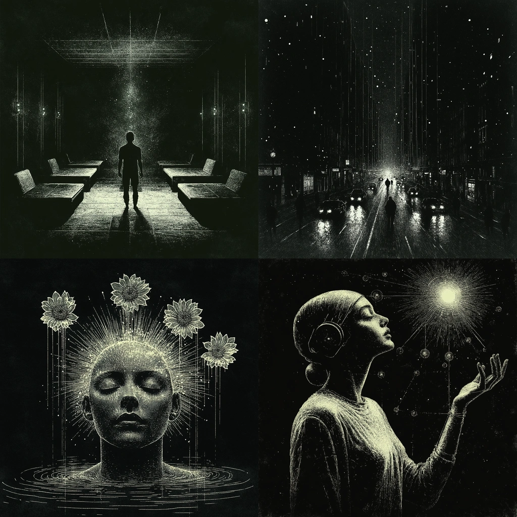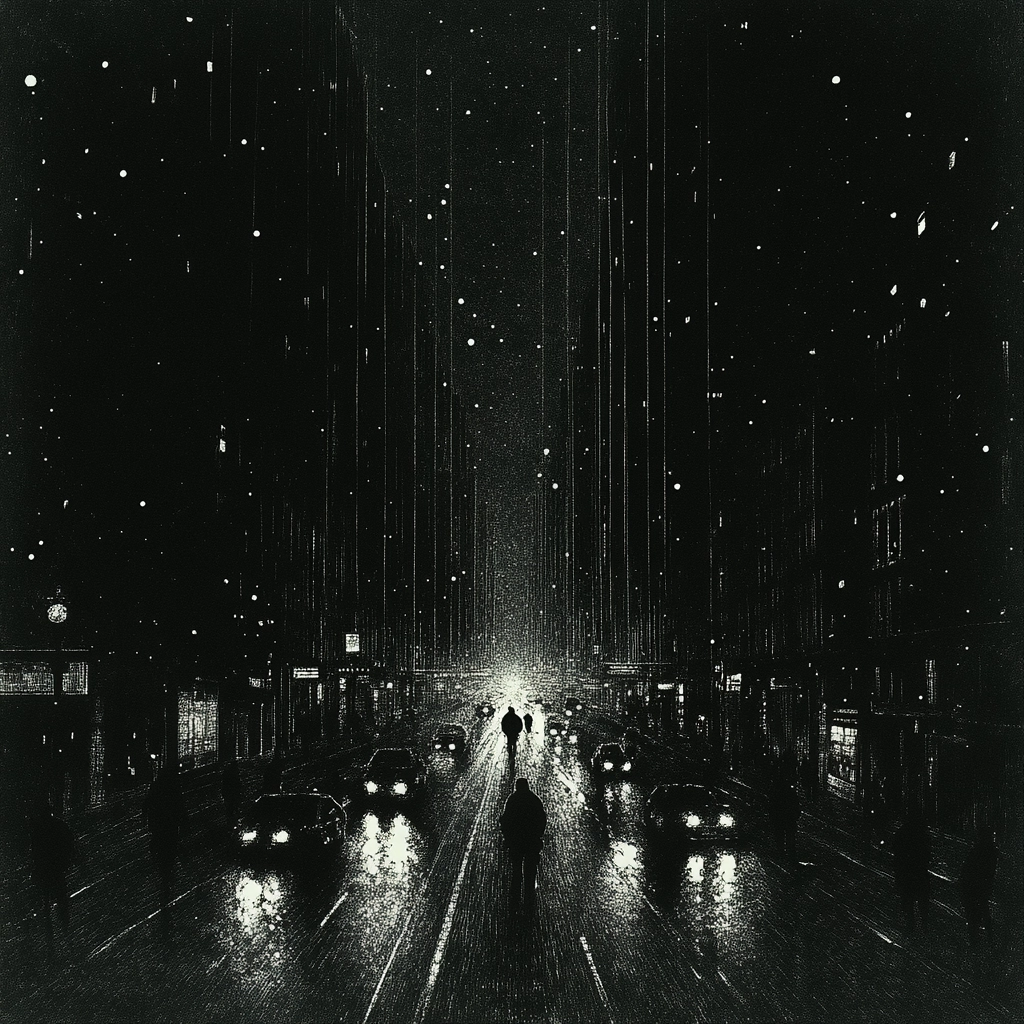 Sparse highlights punctuate a dark minimalist aesthetic.