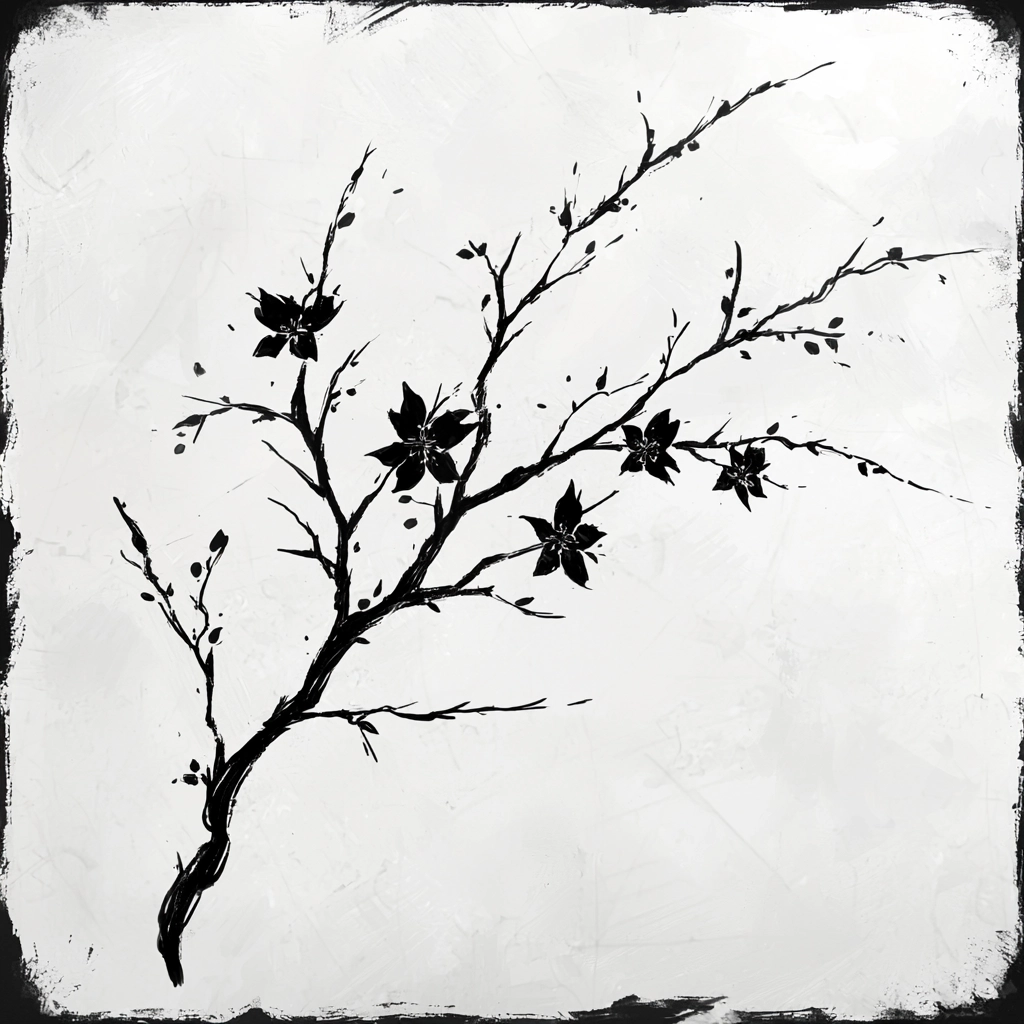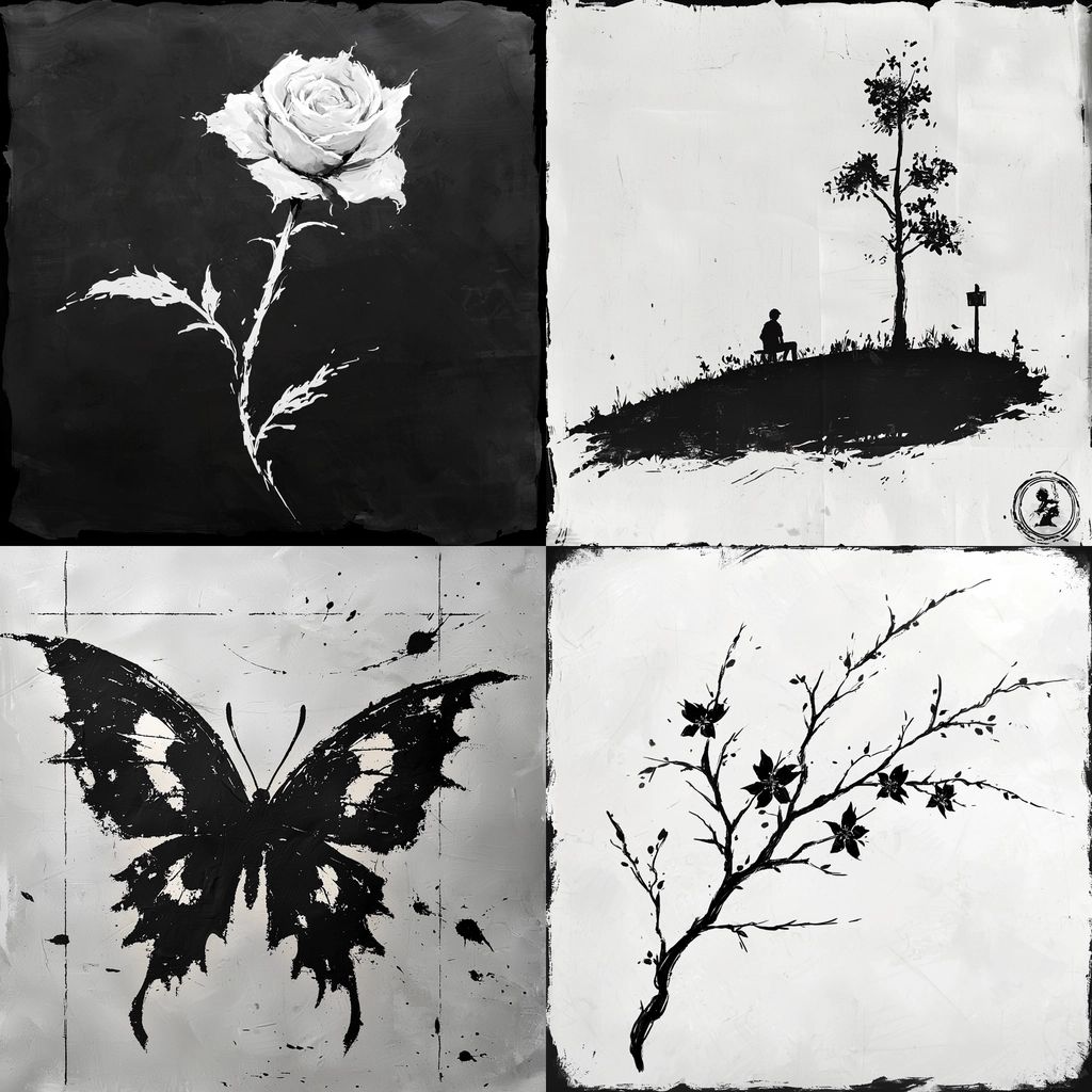 Utilizes stark contrasts with dominant black and white shades, emphasizing fine lines and detailed textures. The use of light and shadow gives a three-dimensional depth to the overall composition while maintaining simplicity and clarity.