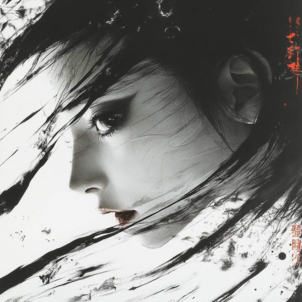 The artwork presents dynamic ink strokes against a monochromatic backdrop.