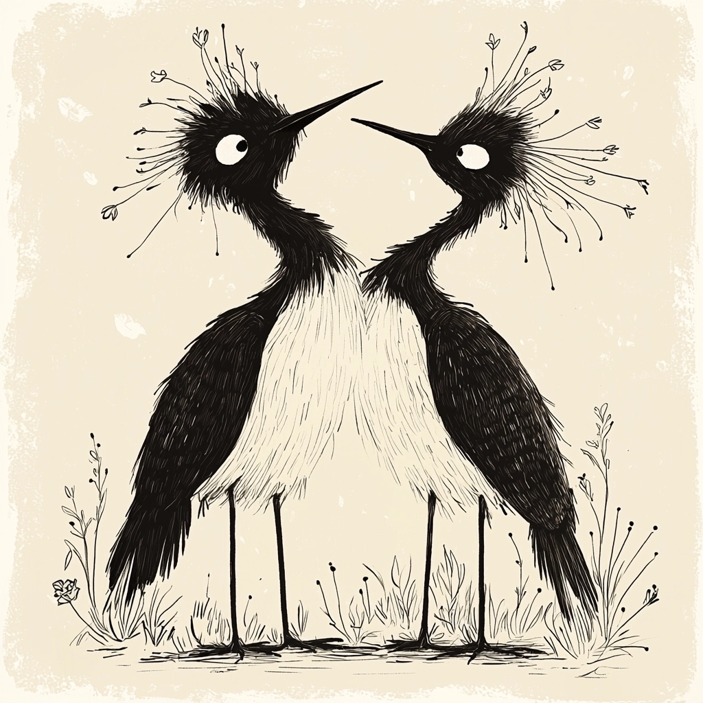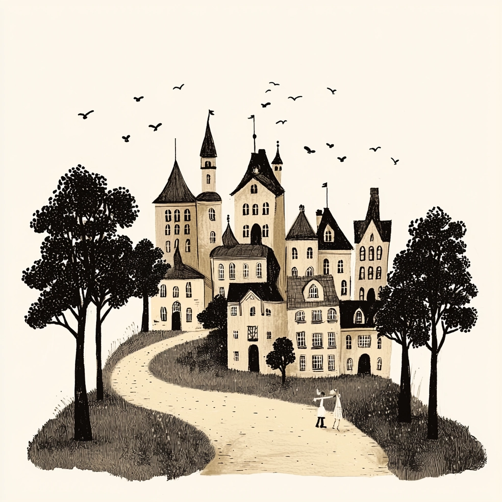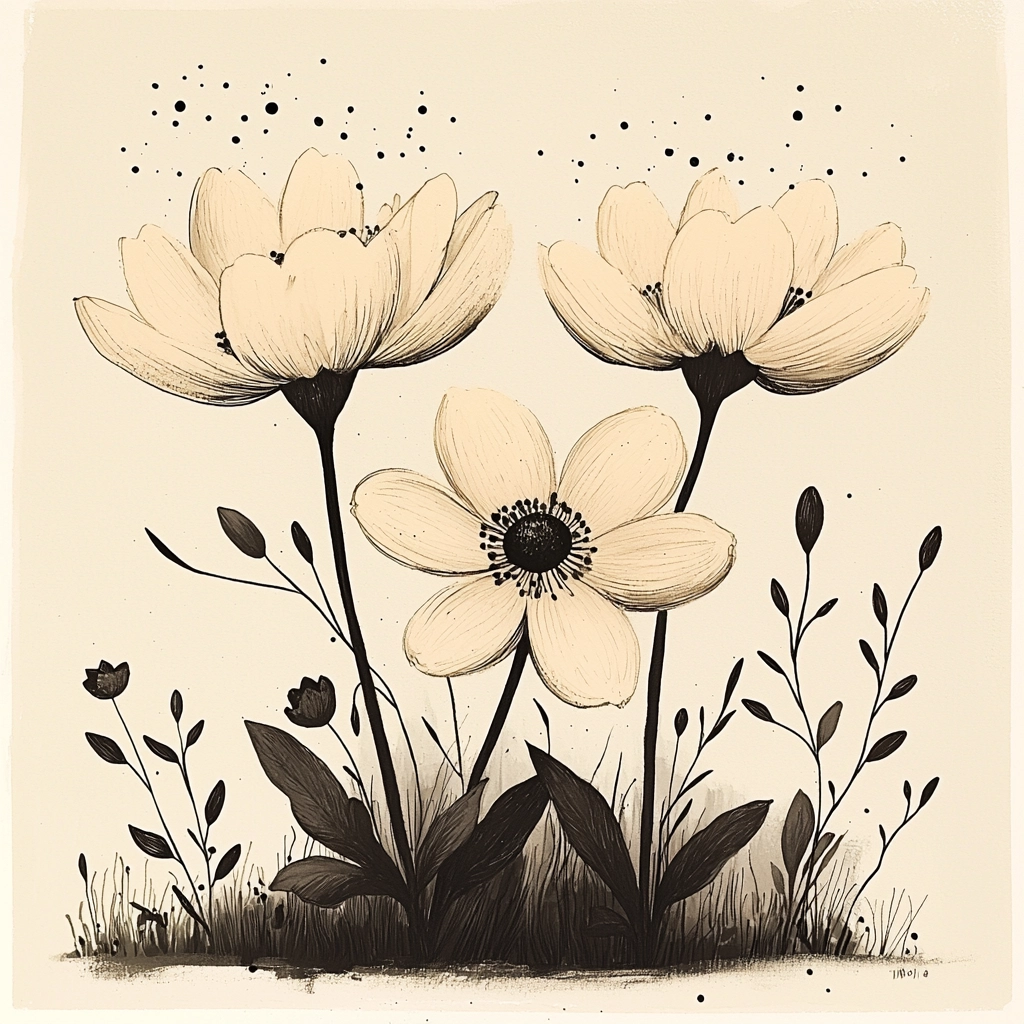 The lighting is even, allowing the intricate line work to shine. Black ink creates a stark contrast against the beige backdrop, enhancing the details and textures. The composition has a balanced spatial sense with subtle shading to suggest depth and volume.