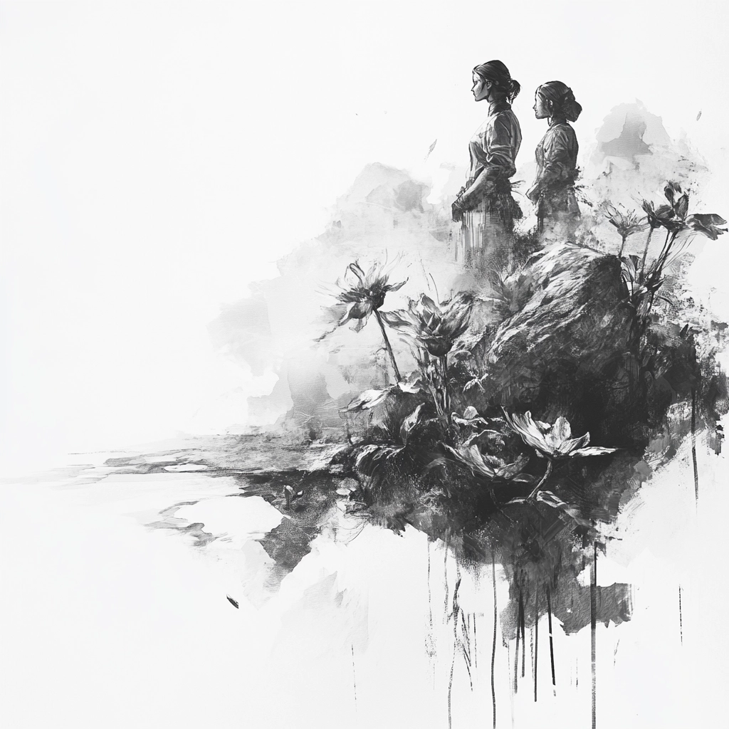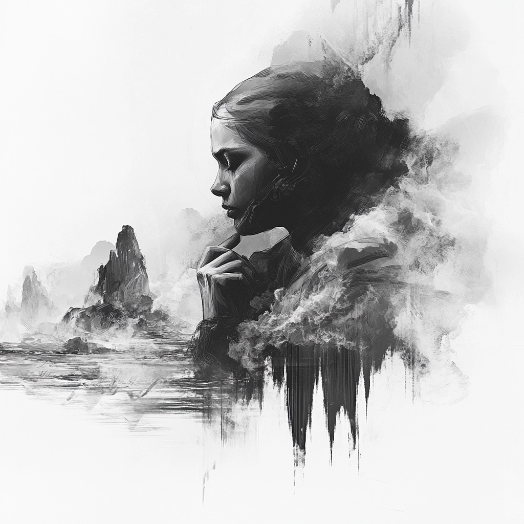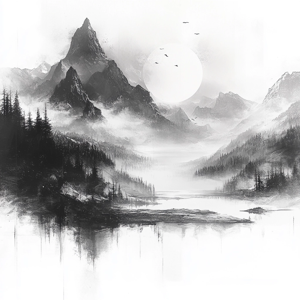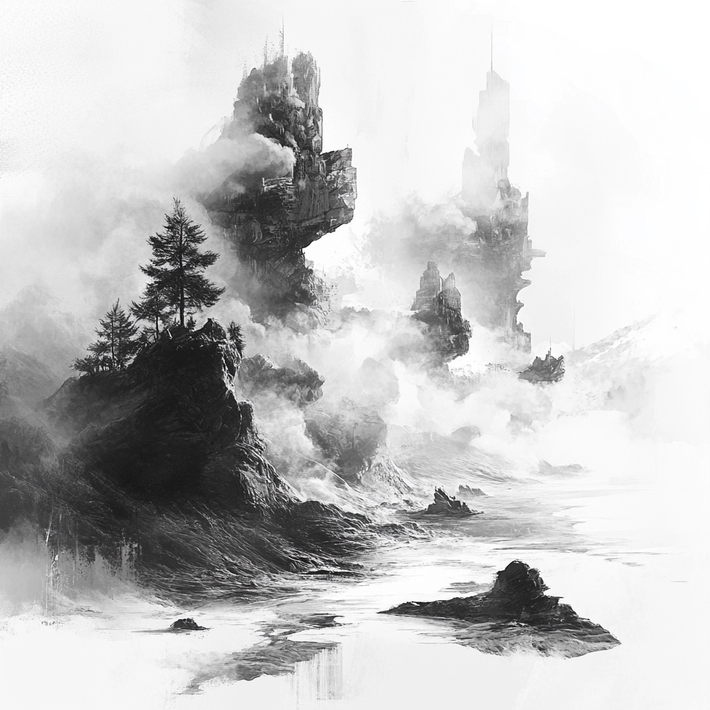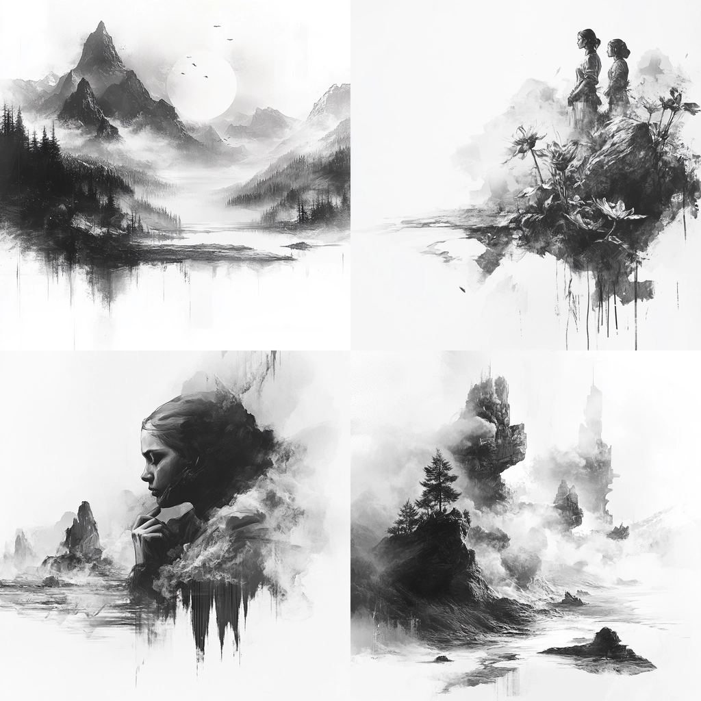 The use of contrasting black and white tones emphasizes dramatic lighting and depth, creating a distinct sense of space. The textured appearance of the ink wash adds fluidity and movement, enhancing the impression of motion throughout the scenes.