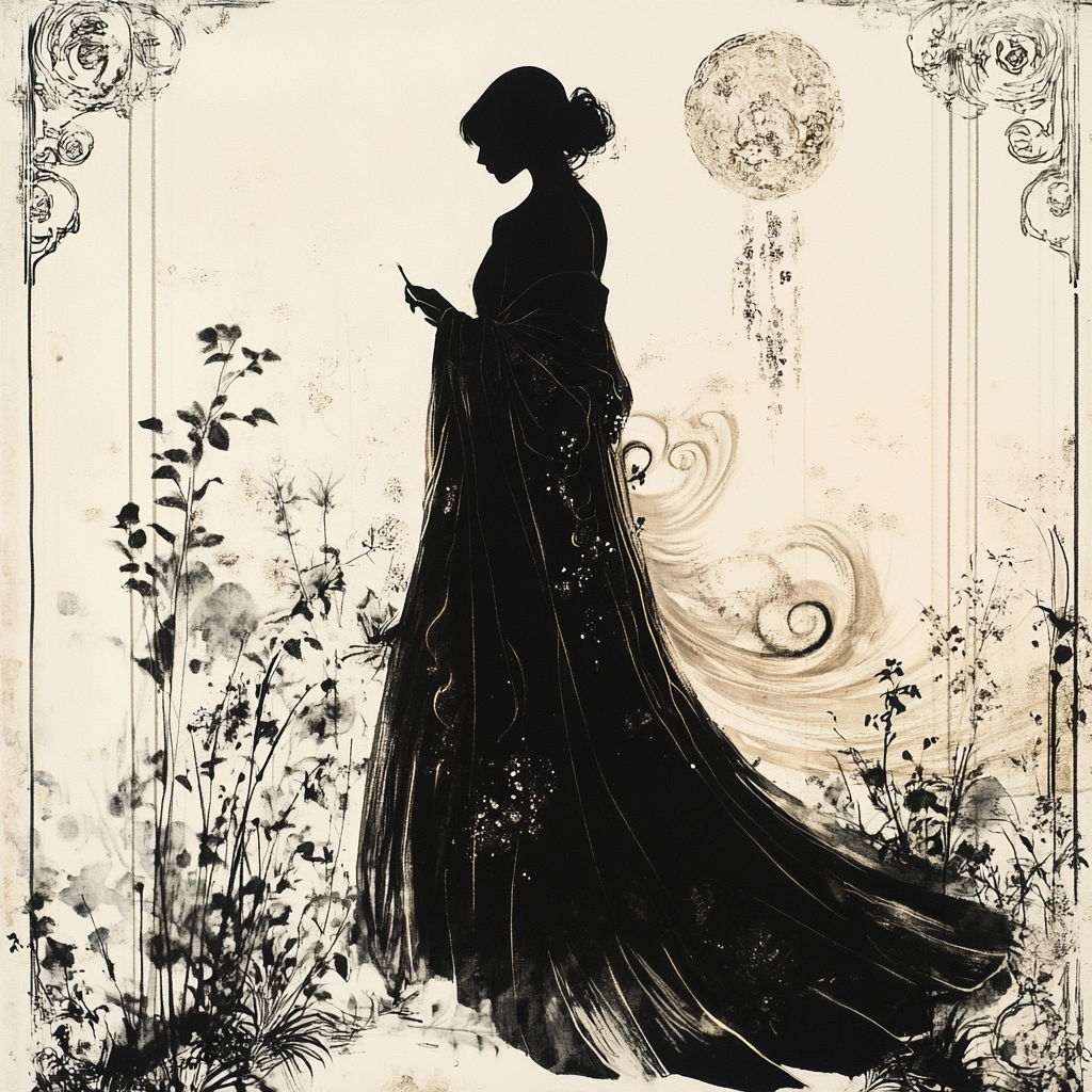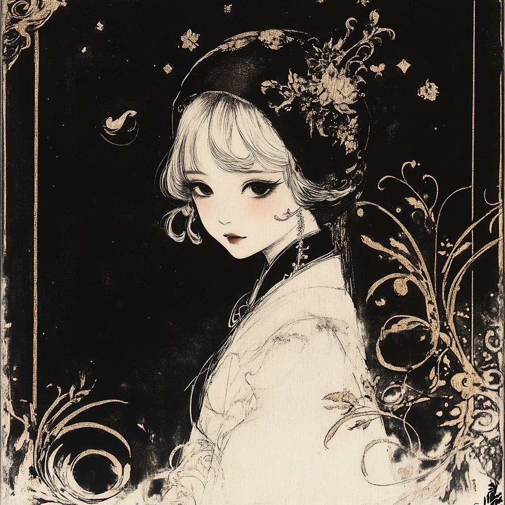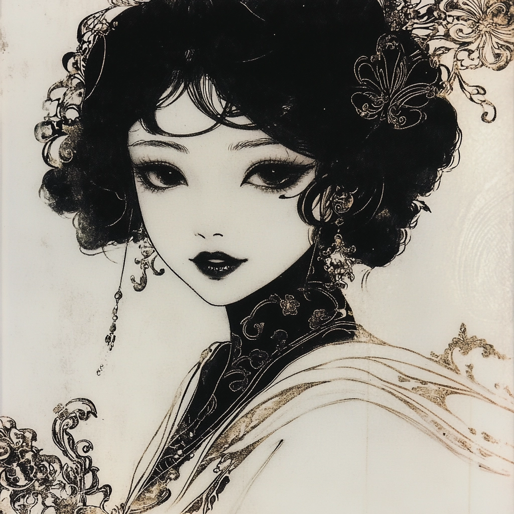 Defined contrasts, elegant flow, emphasis on intricate line work.