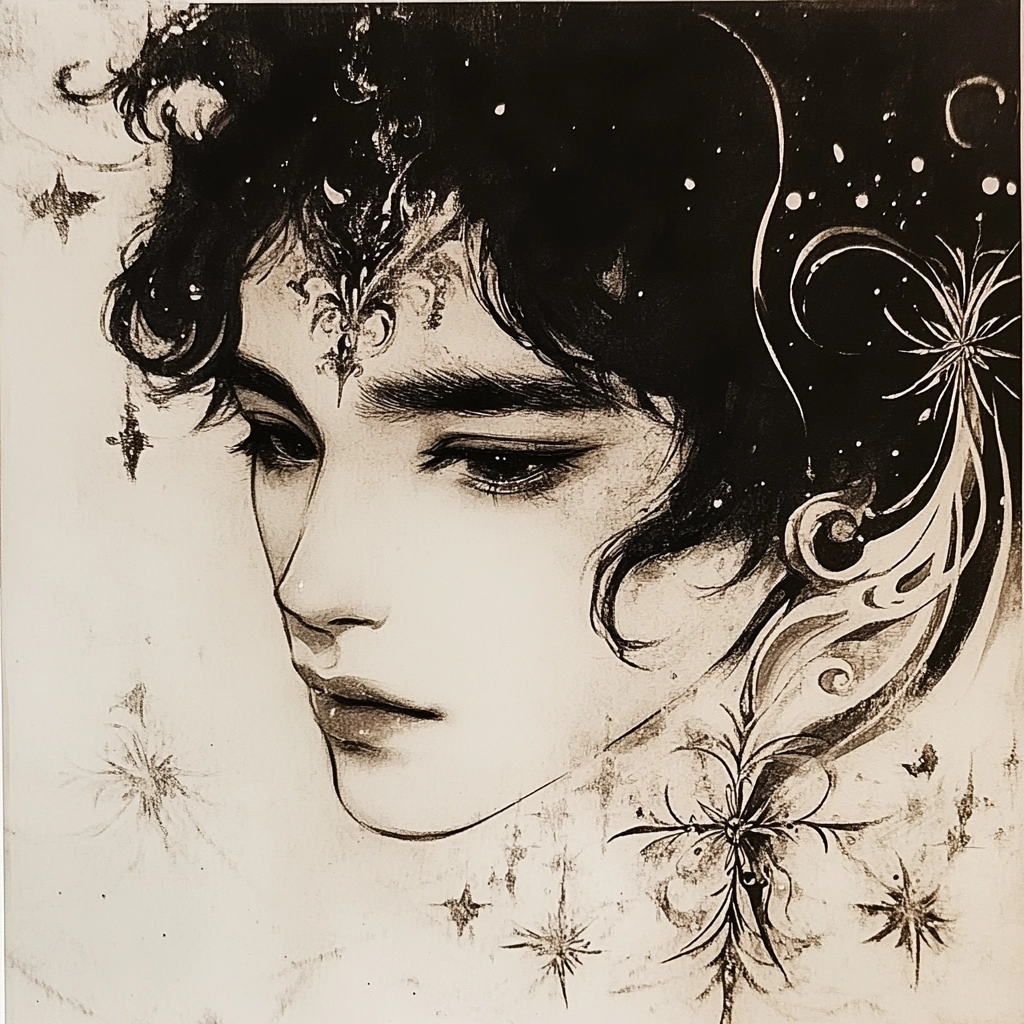 The use of lighting accentuates the contrast between the black and white elements, creating depth and a dynamic balance. The intricate ink outlines and detailed textures contribute to an artistic sense of flow and movement, enhancing the visual richness of the composition.