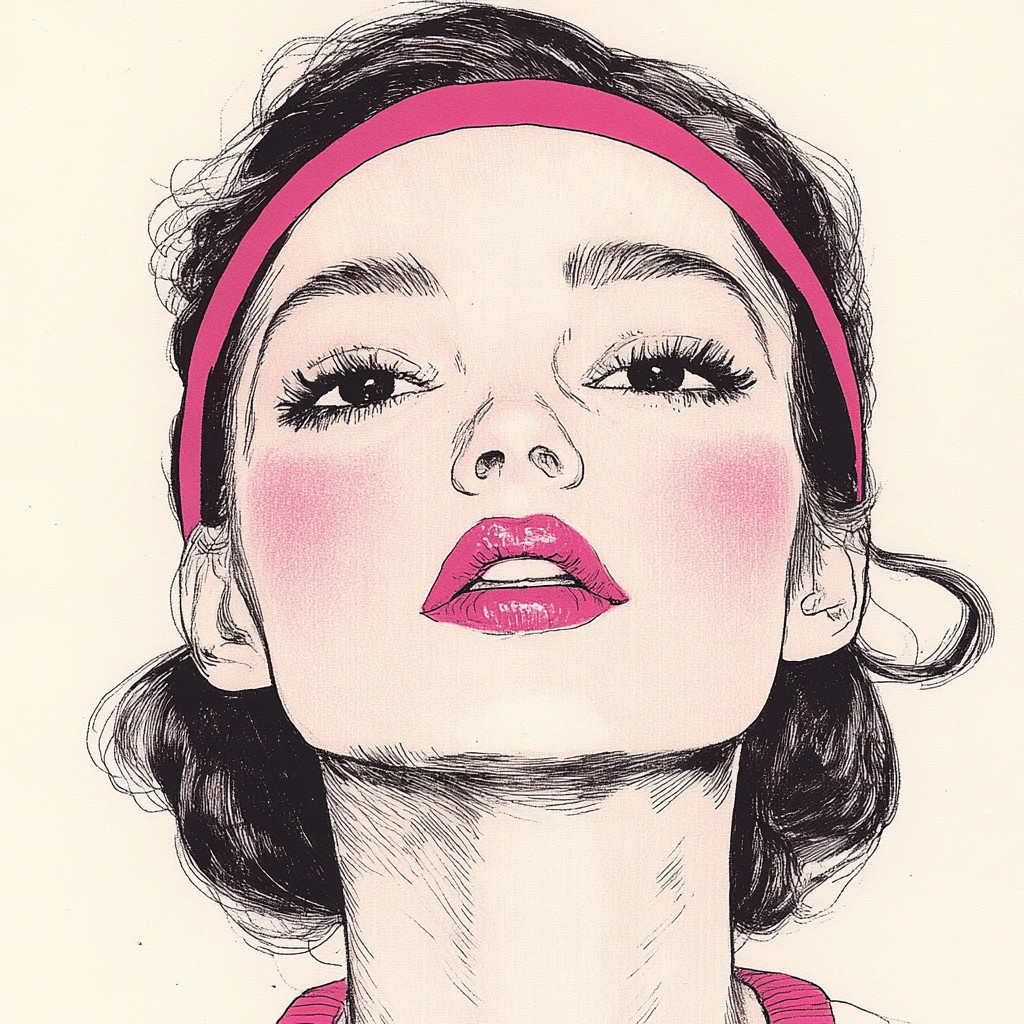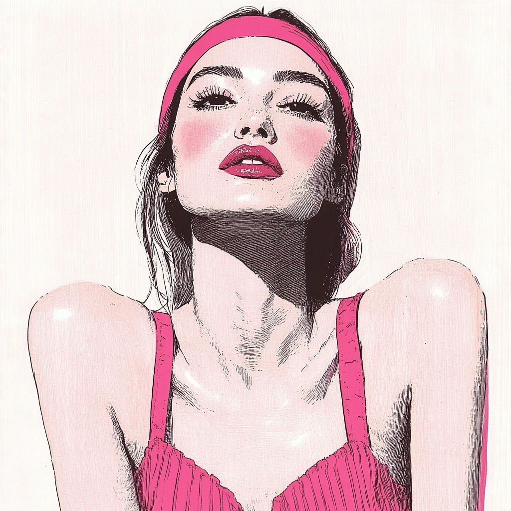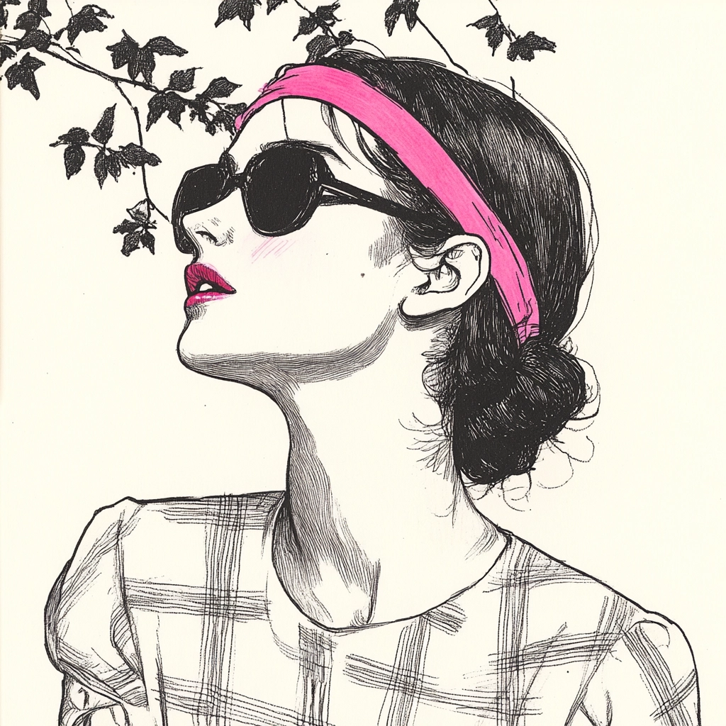 The monochrome palette features precise lines and defined contours, allowing pink accents to provide a pop of color. The use of shading creates depth, while the ink texture adds a tactile quality.