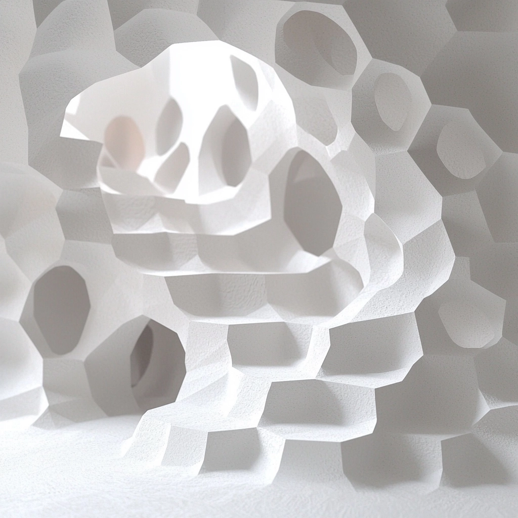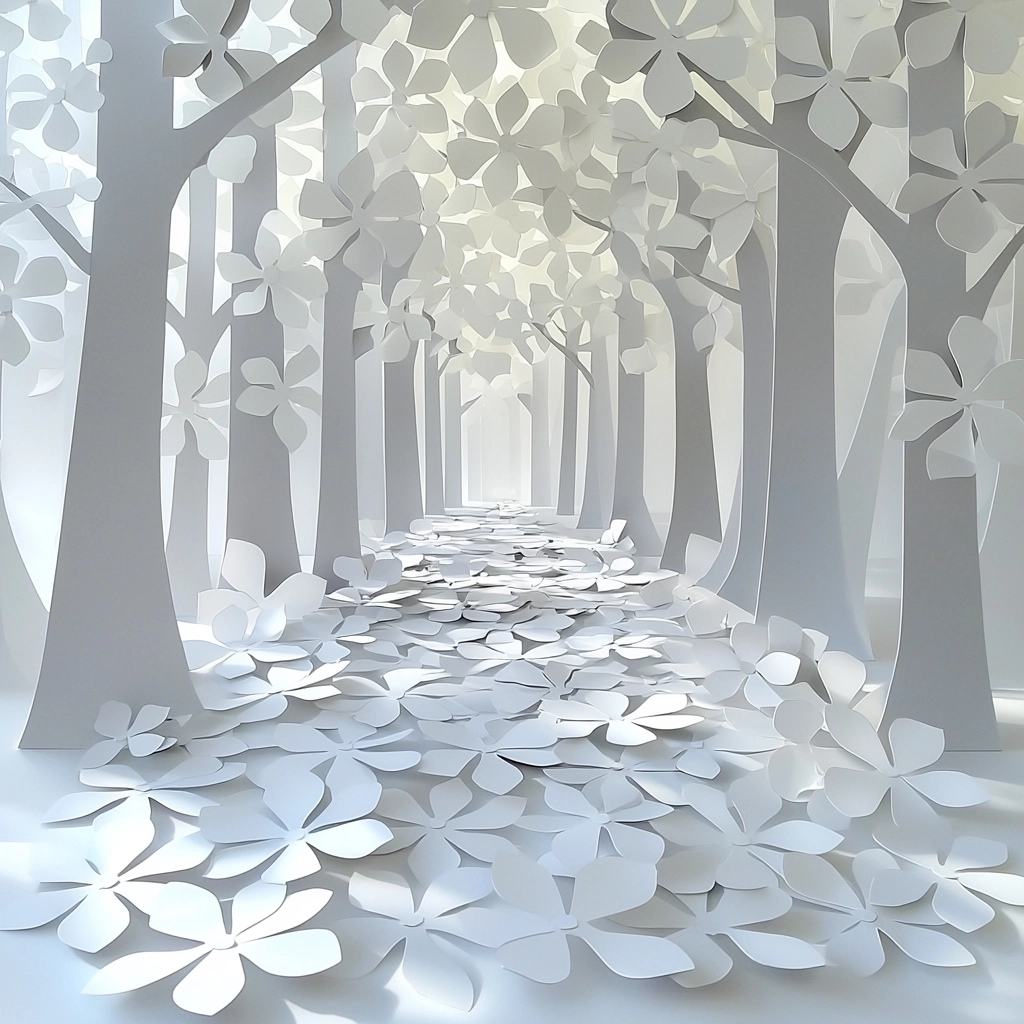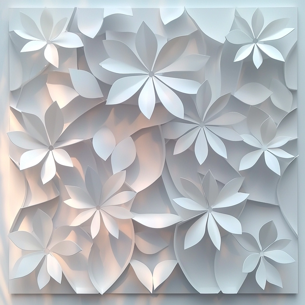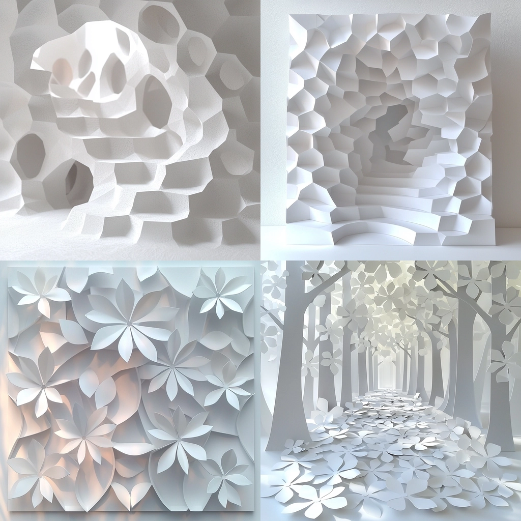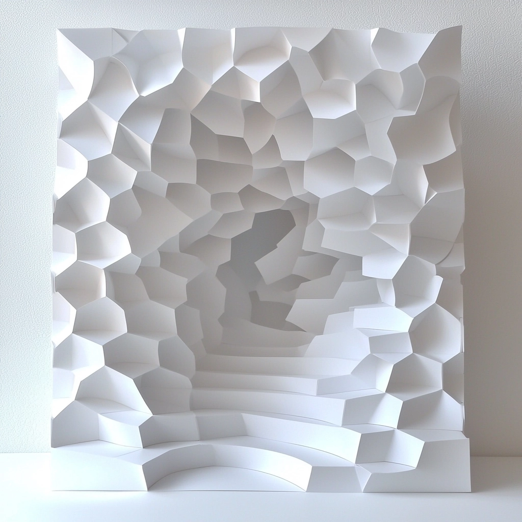 The lighting accentuates the paper's three-dimensional form, highlighting subtle shadows and depths. The white and gray palette enhances the paper's delicate and tactile nature. Spatial distribution creates an evolving interaction between light and shape.