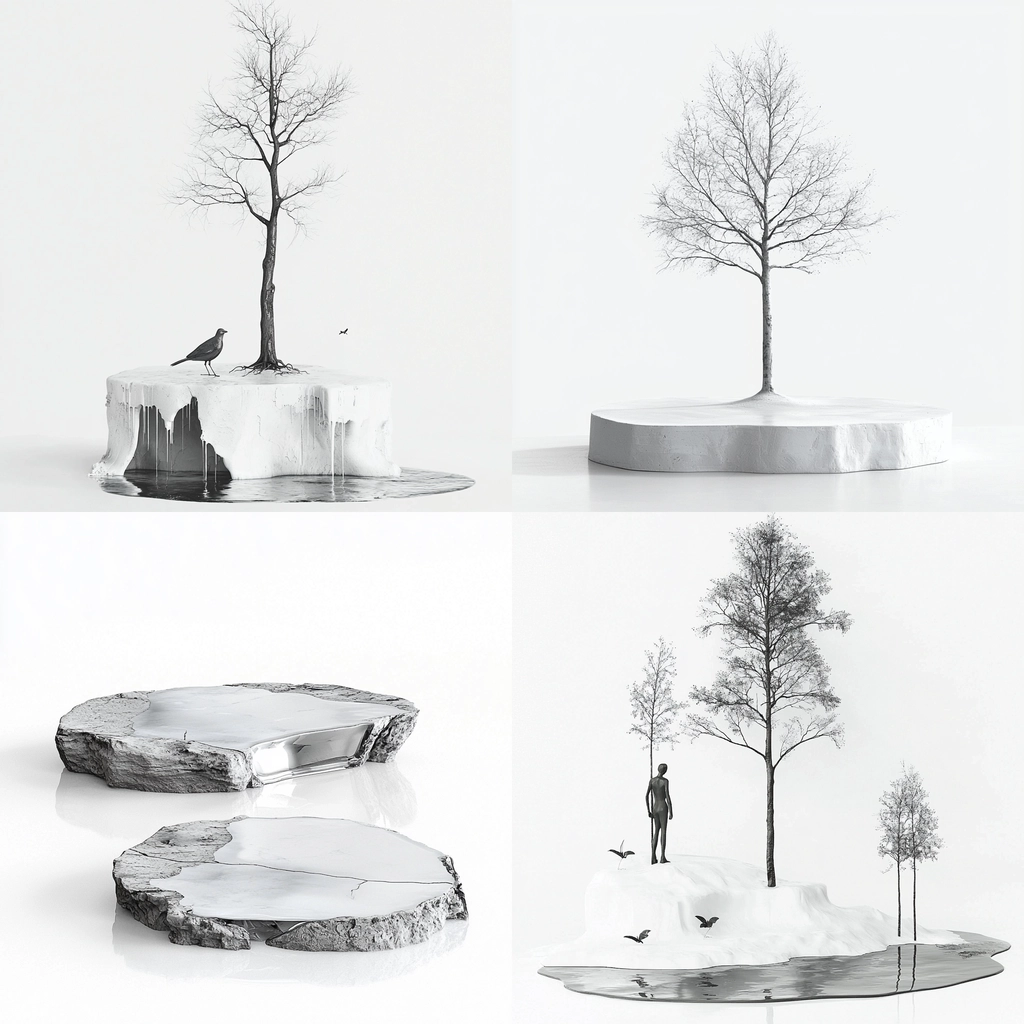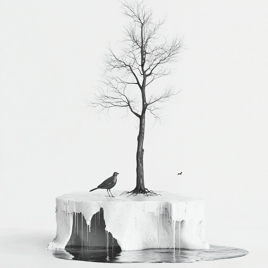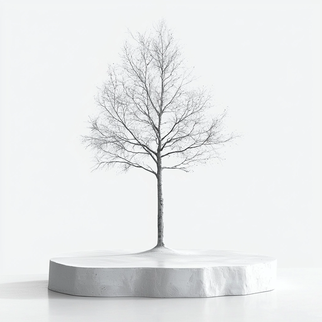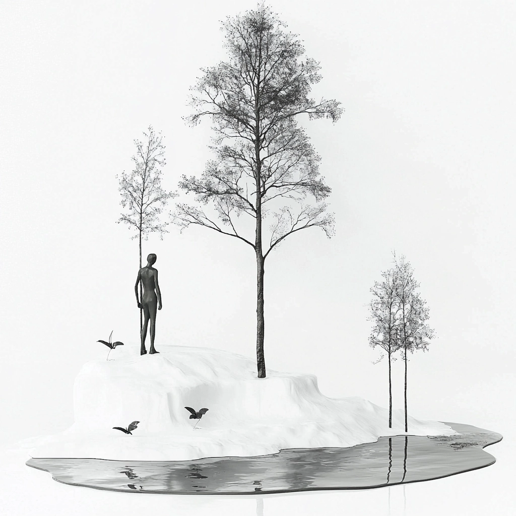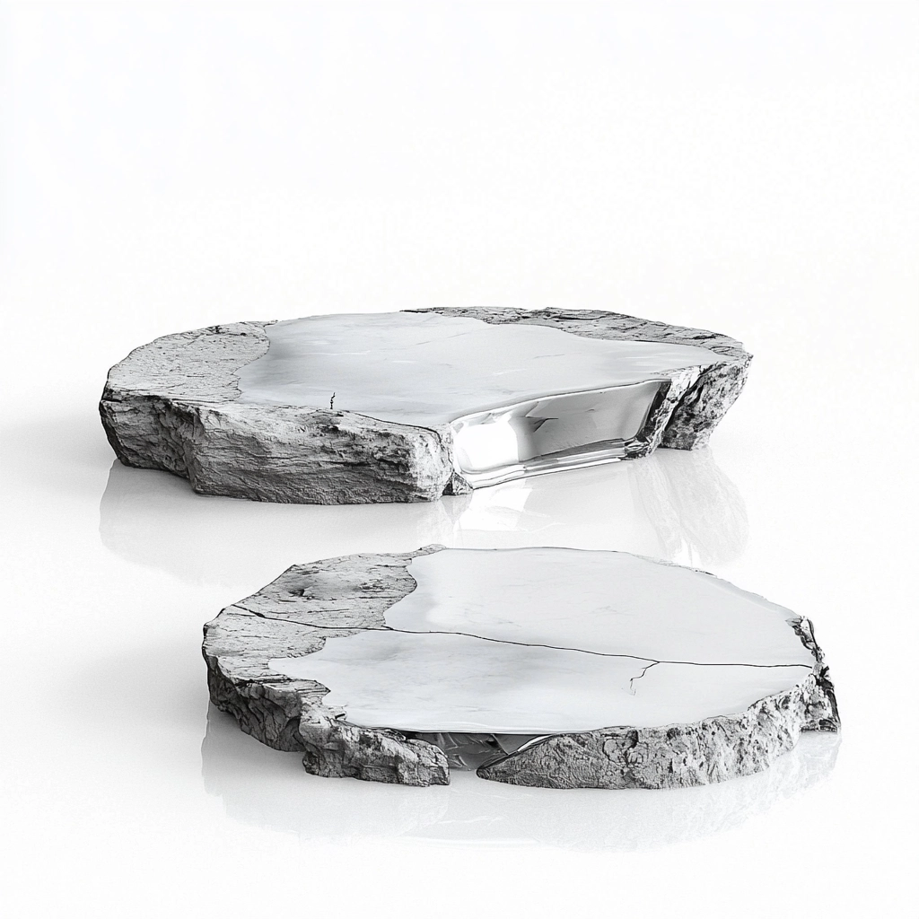 The artwork employs stark lighting that enhances contrast between light and shadow, with a smooth gradient creating depth. It captures the sleek texture of reflective surfaces, emphasizing minimalism through a thoroughly clean presentation.