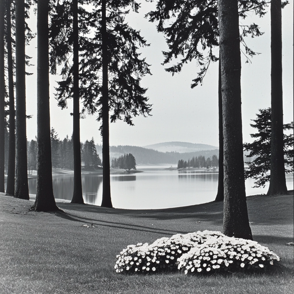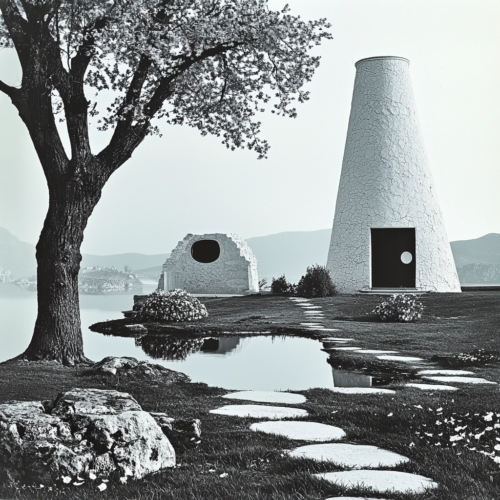 Black and white tones create a stark, minimalistic landscape with geometric forms and simple compositions.