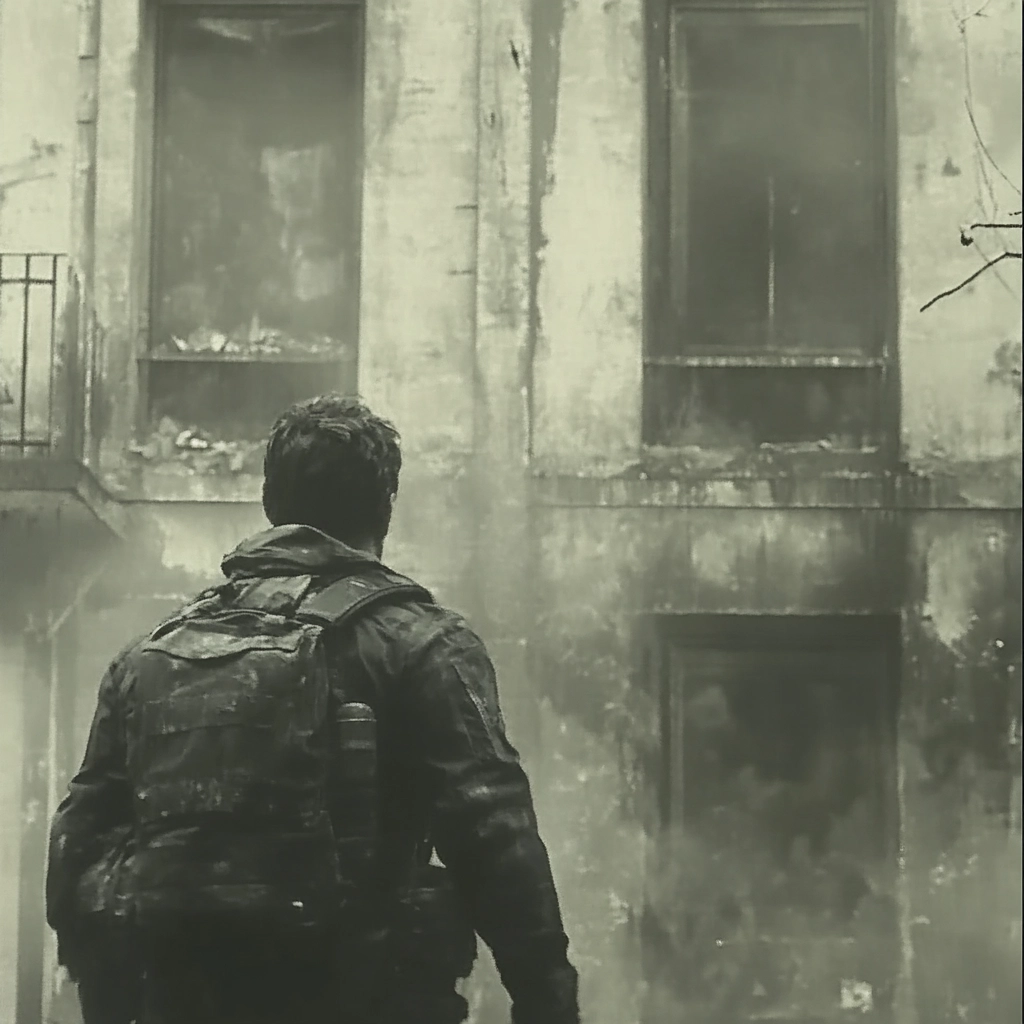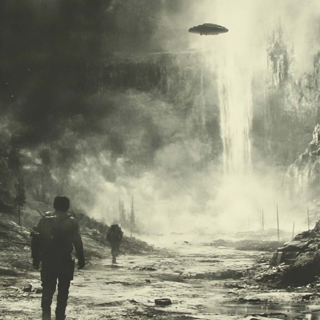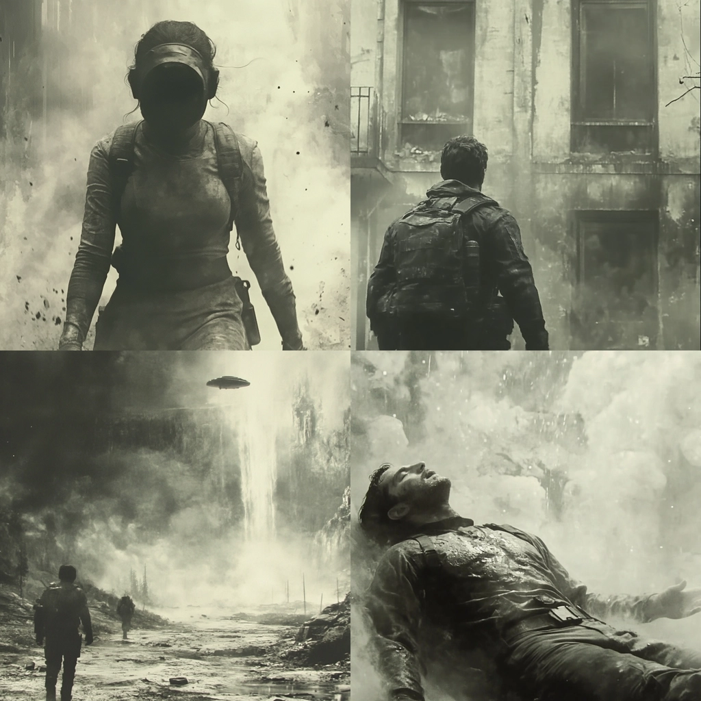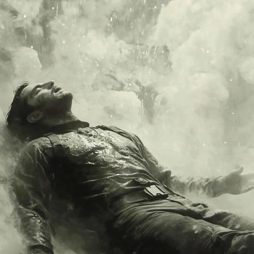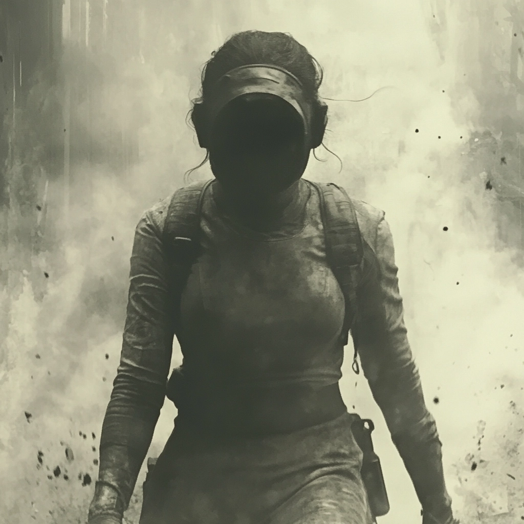 The use of light enhances contrast, casting deep shadows and highlighting contours. The scene contains a flat spatial depth but rich in texture through the interplay of smoke and mist. Smooth transitions between light and dark accentuate the muted tones throughout.