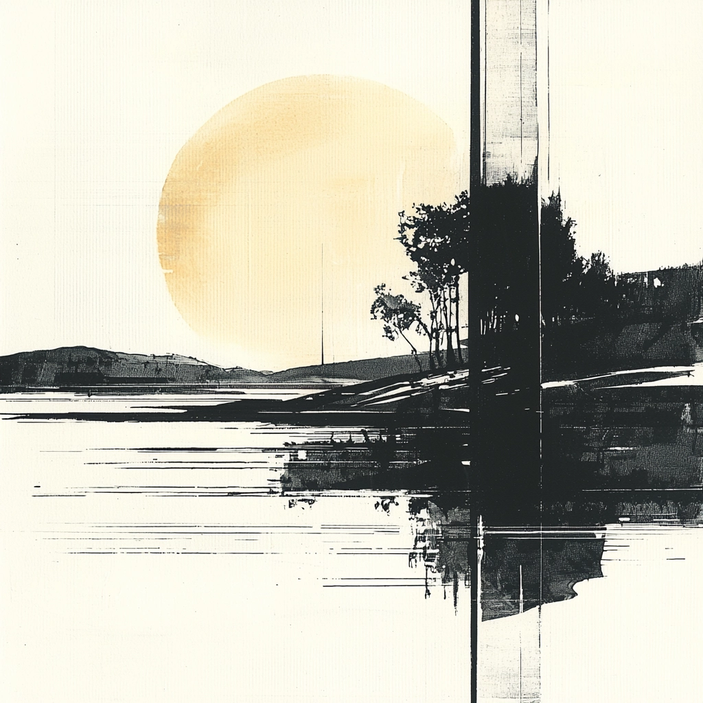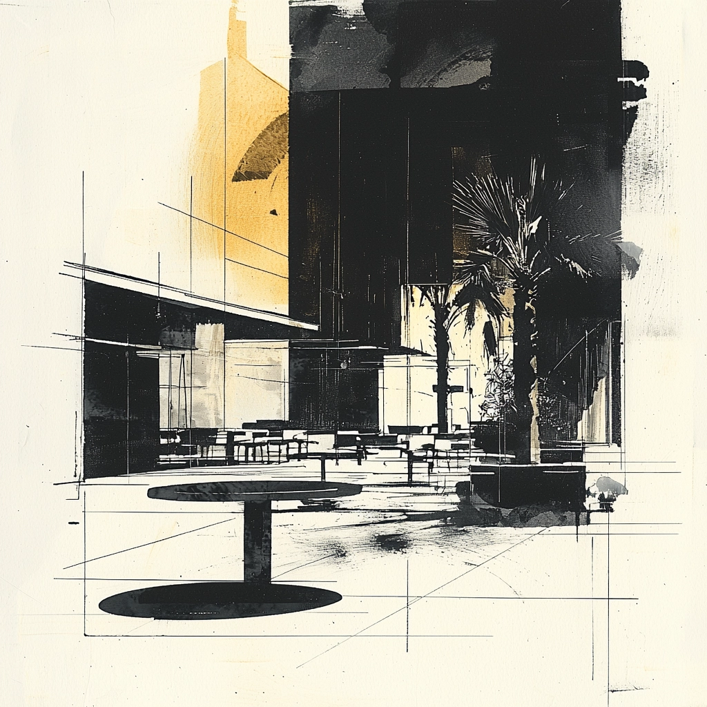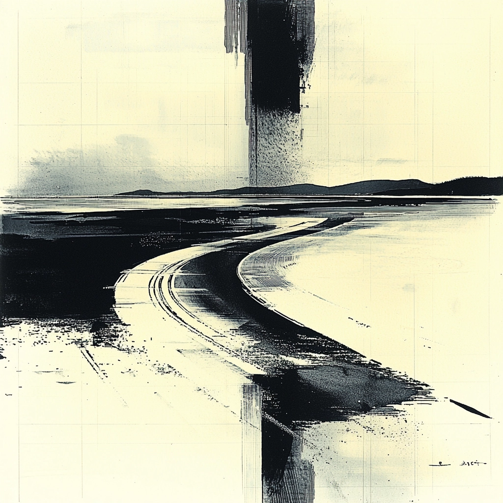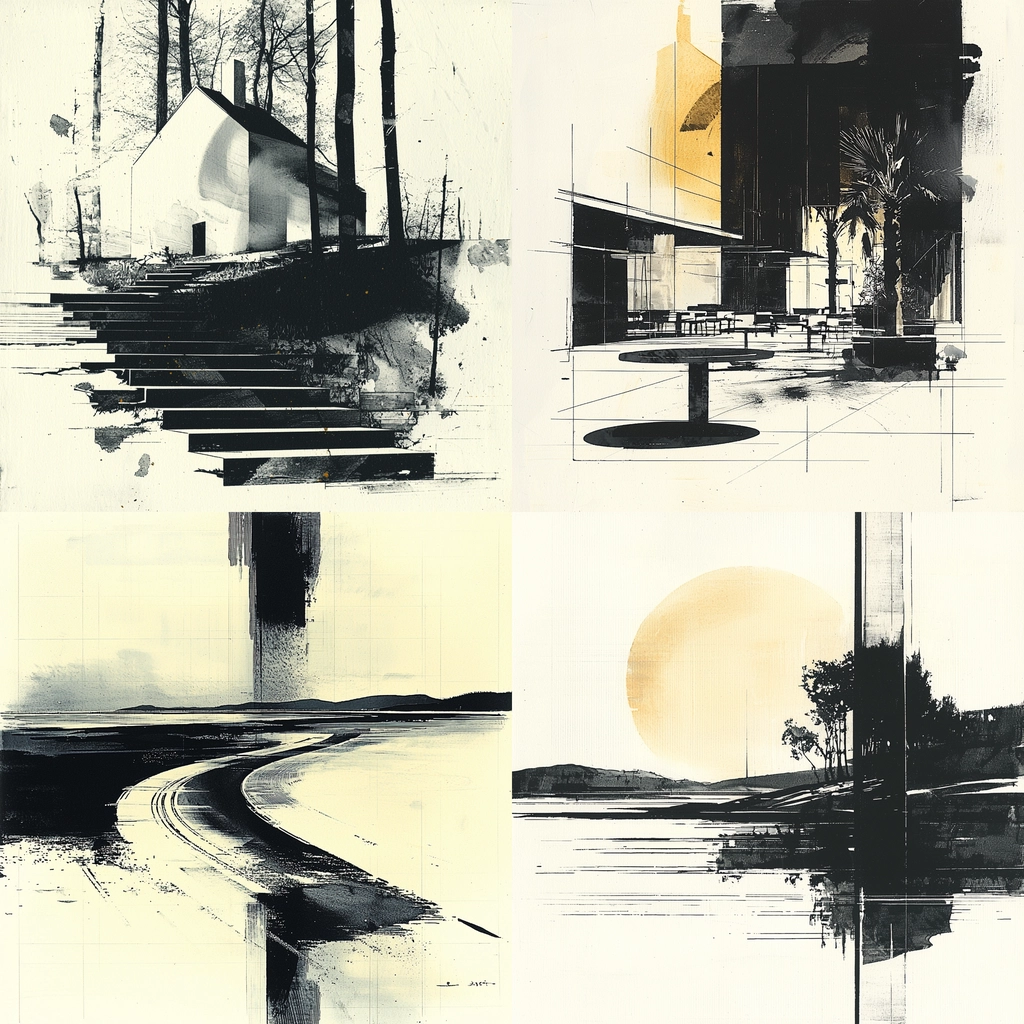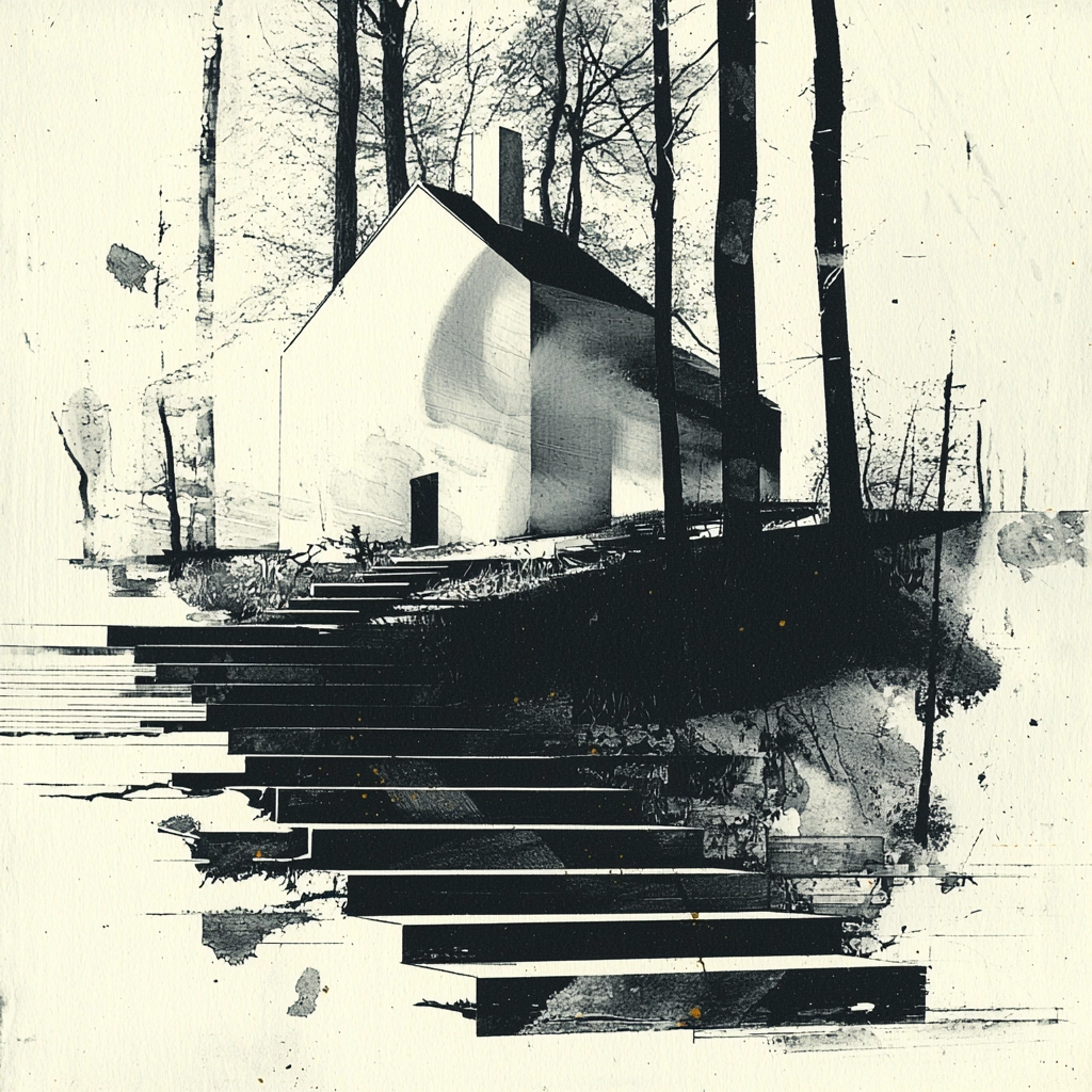 Contrasting black and white with sharp angular forms create a balanced yet dynamic composition.