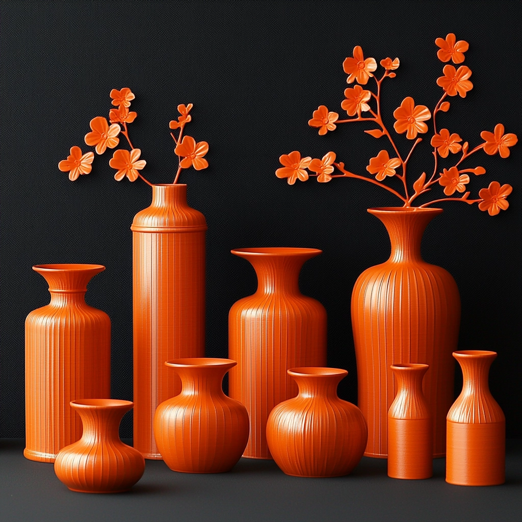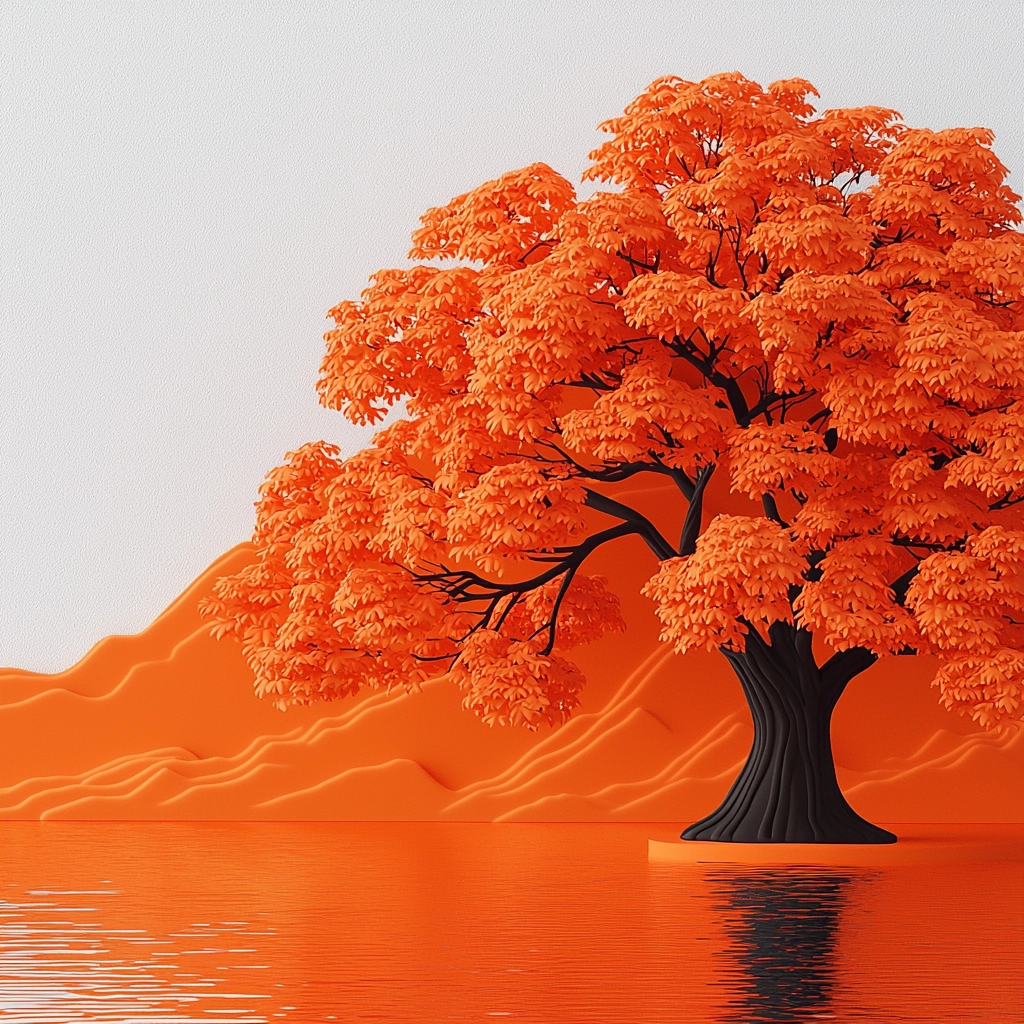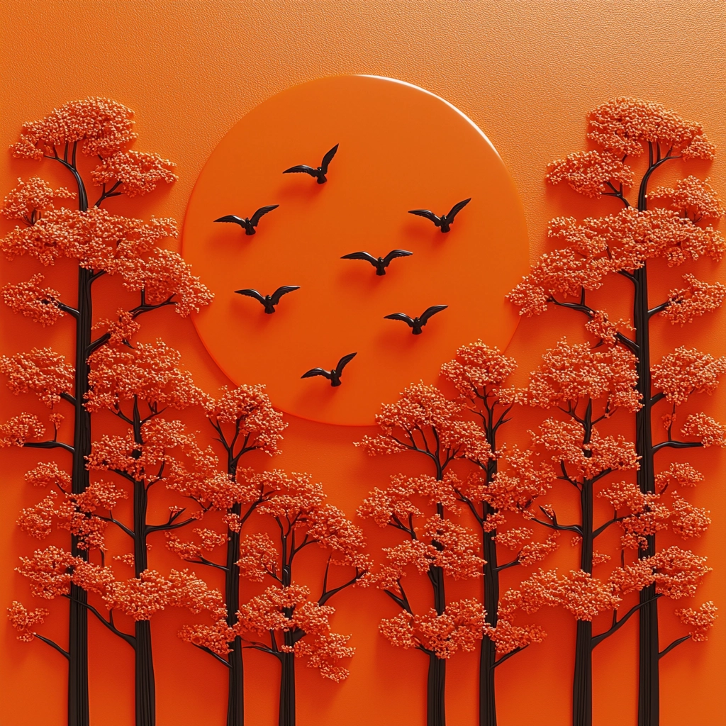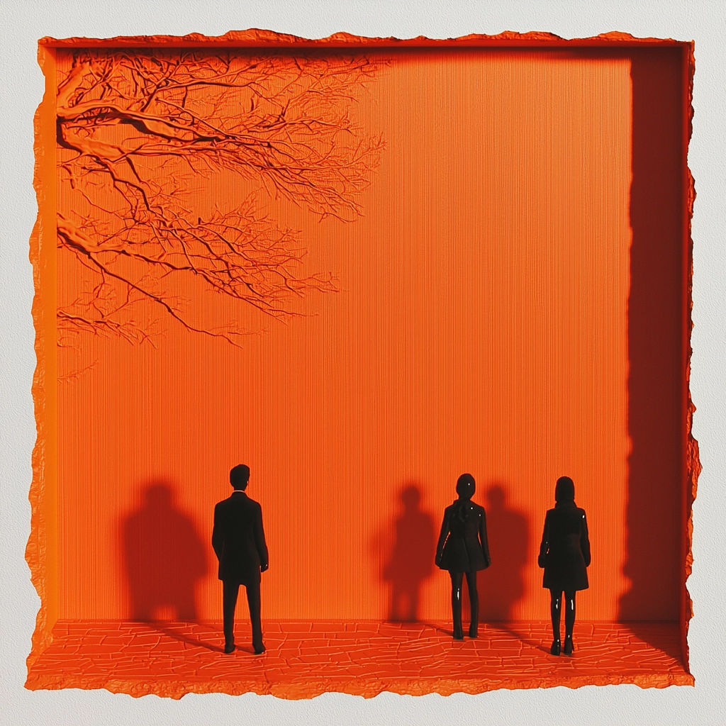 The composition employs stark lighting to enhance textural contrast, with expressive use of orange creating a dynamic spatial depth. The refined textures in the scenes underscore a polished, controlled aesthetic, anchored by deep shadows.