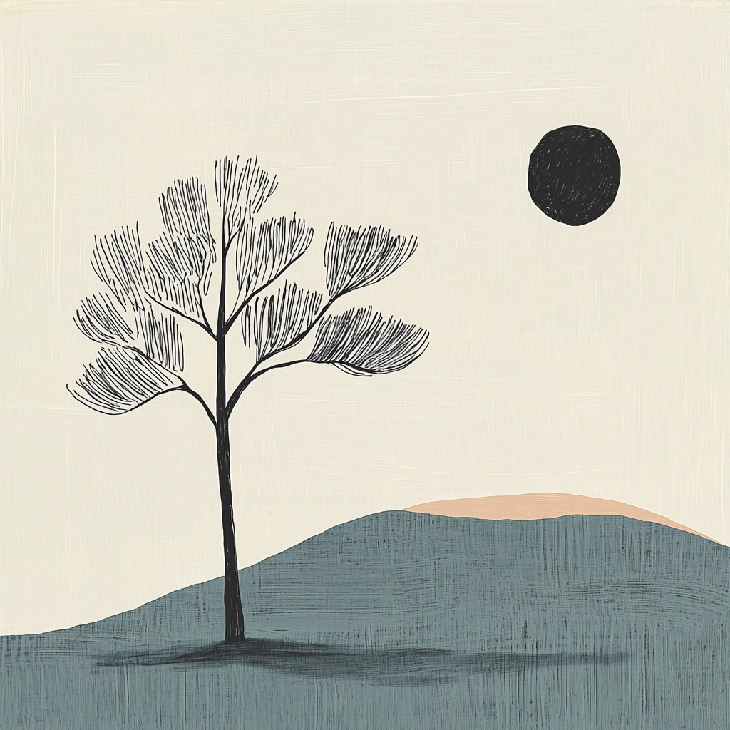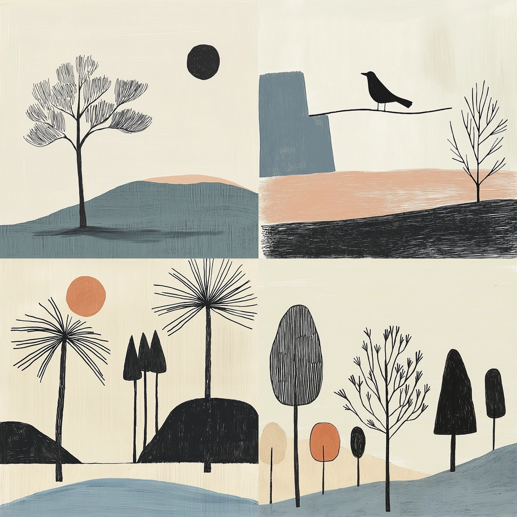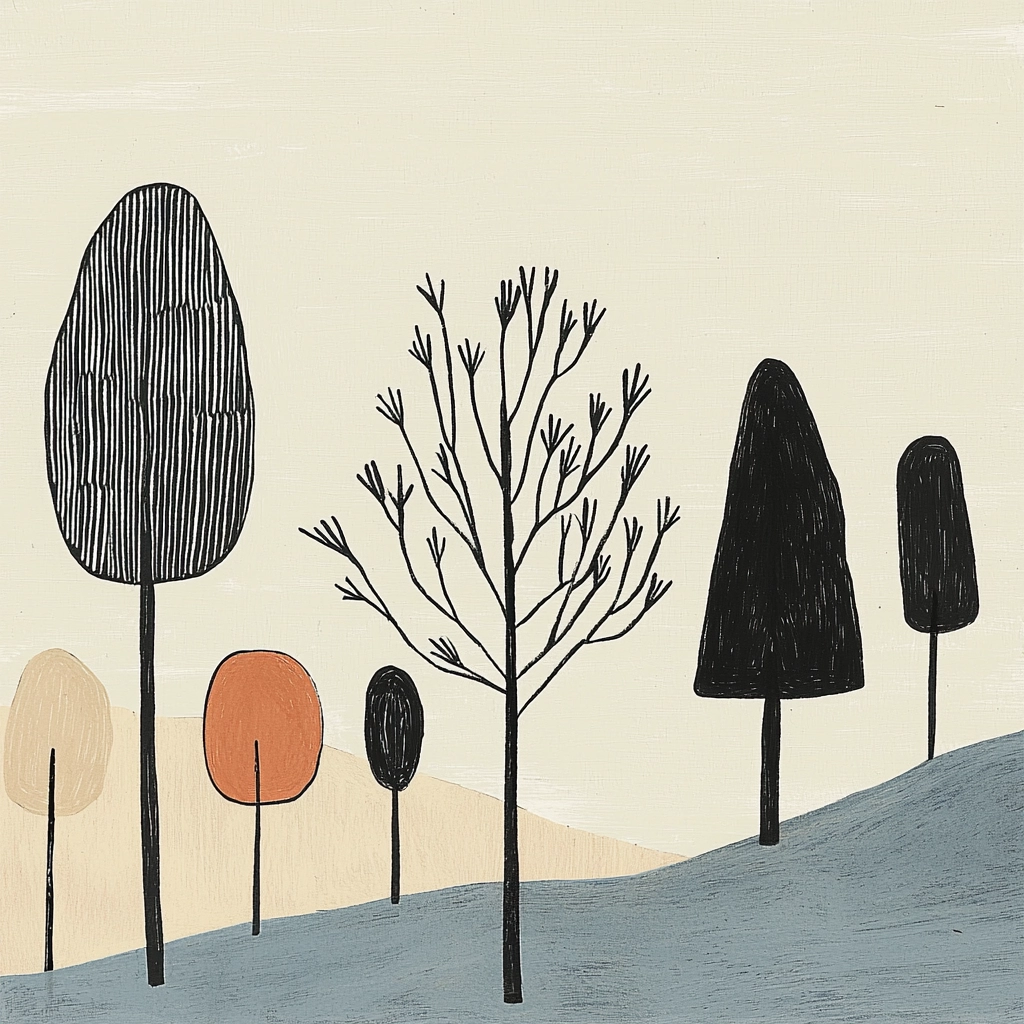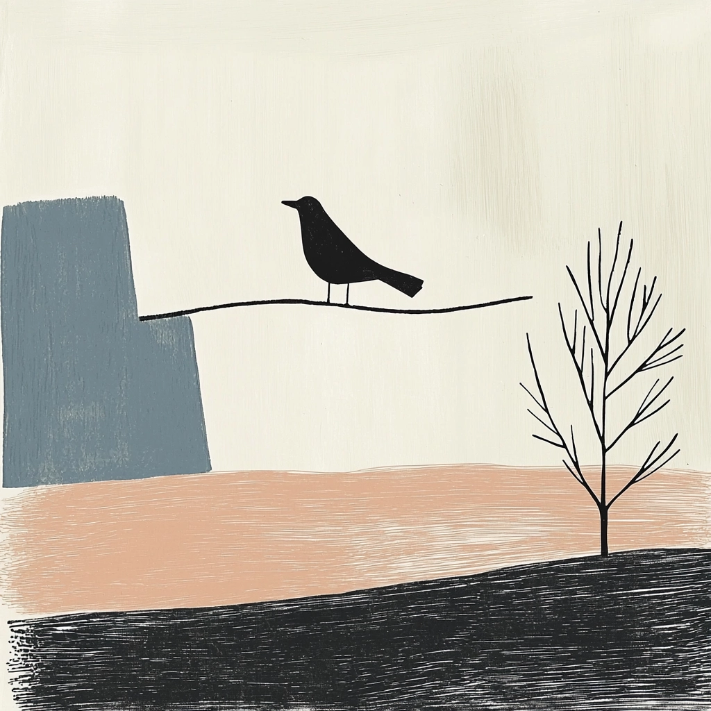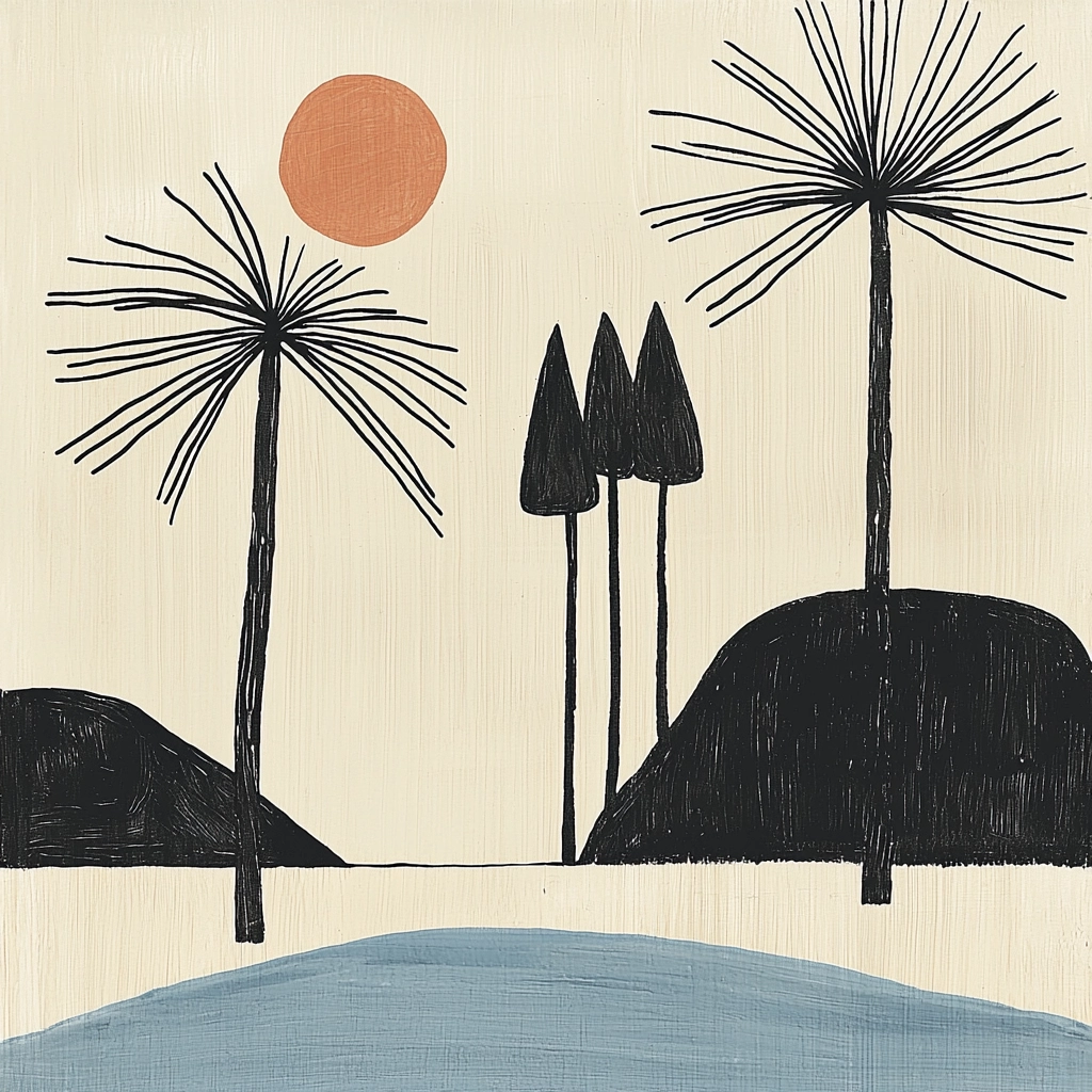 The use of black outlines against the muted beige background creates a stark contrast, accentuating the simplicity of the forms. Soft blue fills harmonize with the beige, providing a gentle transition across shapes and spaces, enhanced by textured brushstrokes giving depth and tactility.