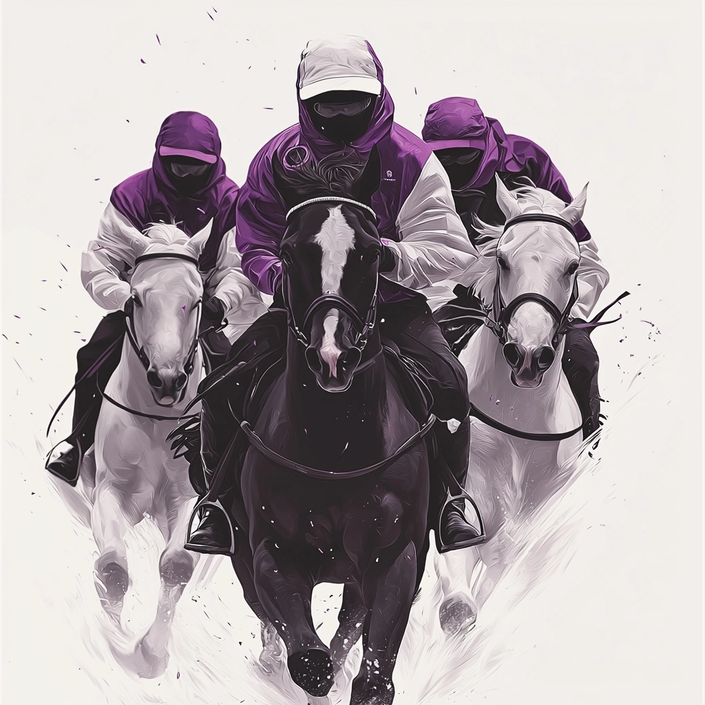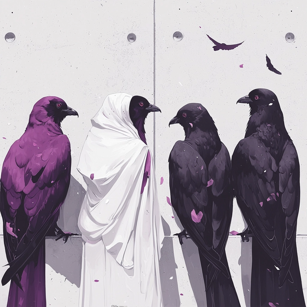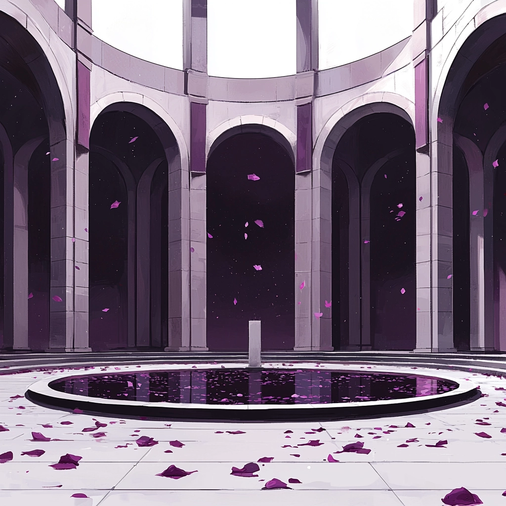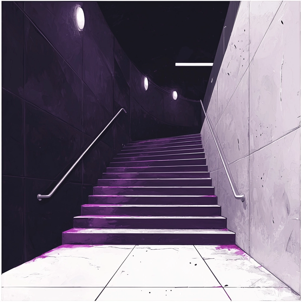 Lighting is used to create dramatic contrasts, enhancing the spatial depth and composition. The texture is smooth, contributing to a refined finish. Purple tones dominate, supported by deep blacks creating a stark yet cohesive visual impact.