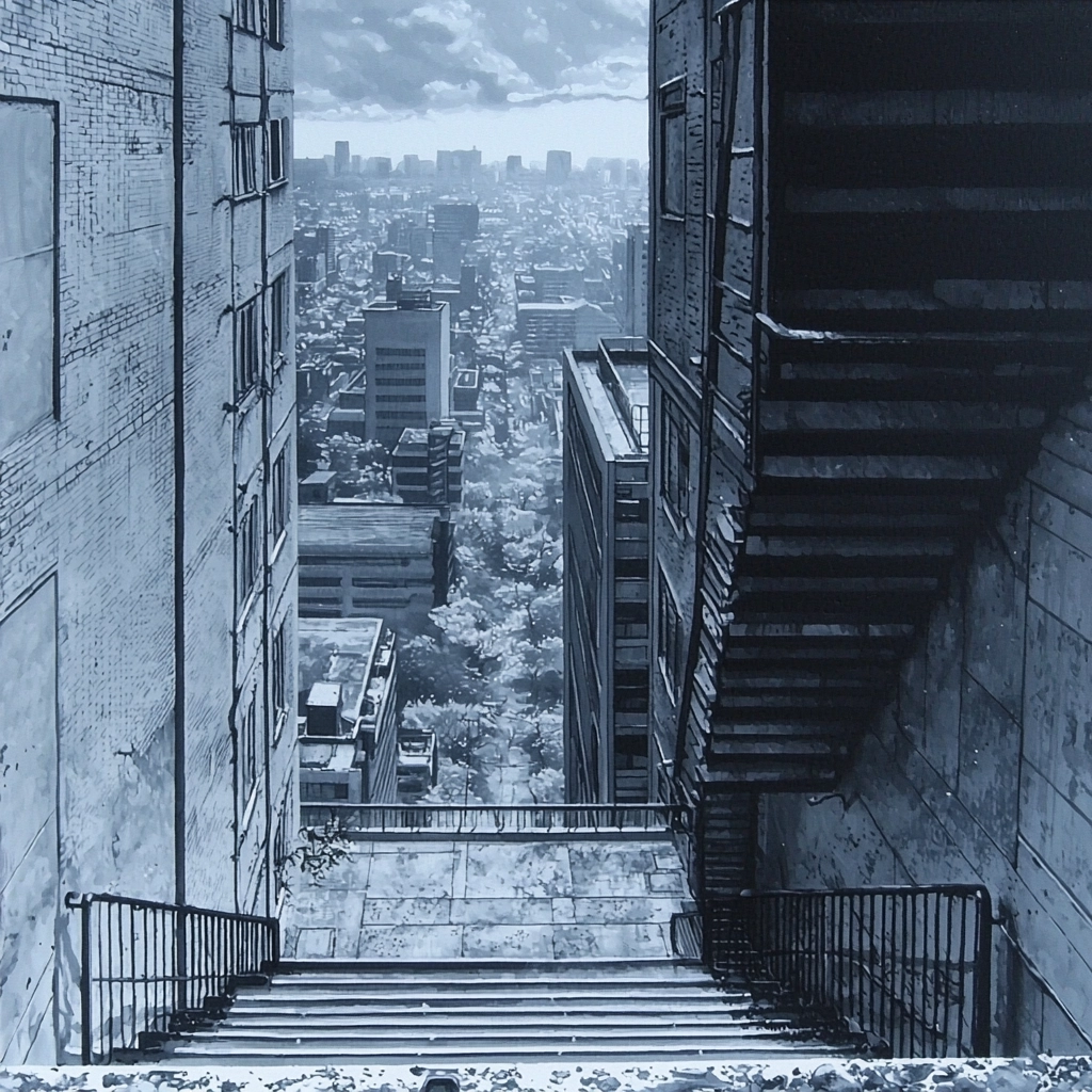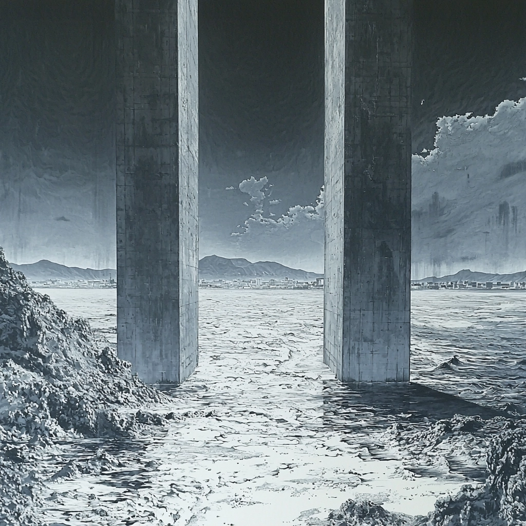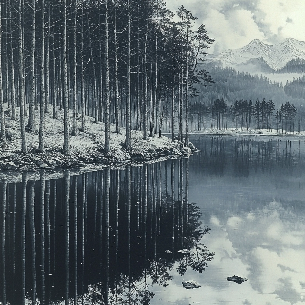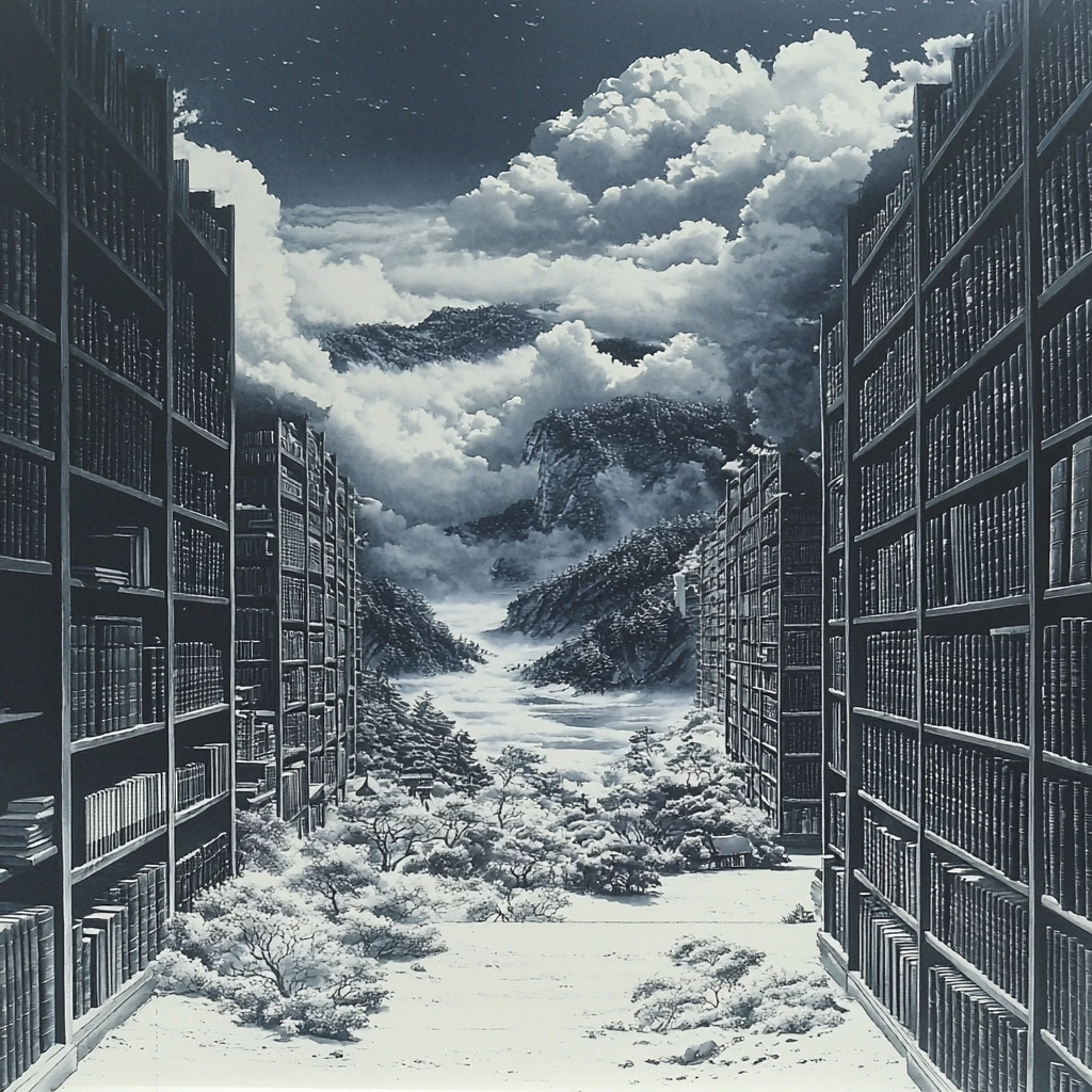The grayscale palette enhances focus on structural details and spatial engagement, with soft gradients that create a sense of vastness and intricacy. Subtle shading techniques highlight texture and depth, emphasizing architectural and natural elements with precision.