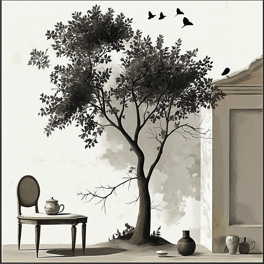 Lighting effects create soft shadows enhancing the depth. The dominant use of monochrome yields a crisp and clear visual experience, highlighting details through shades of gray. Textural contrasts between elements within the scenes stand out, supplying a tangible sense of space.