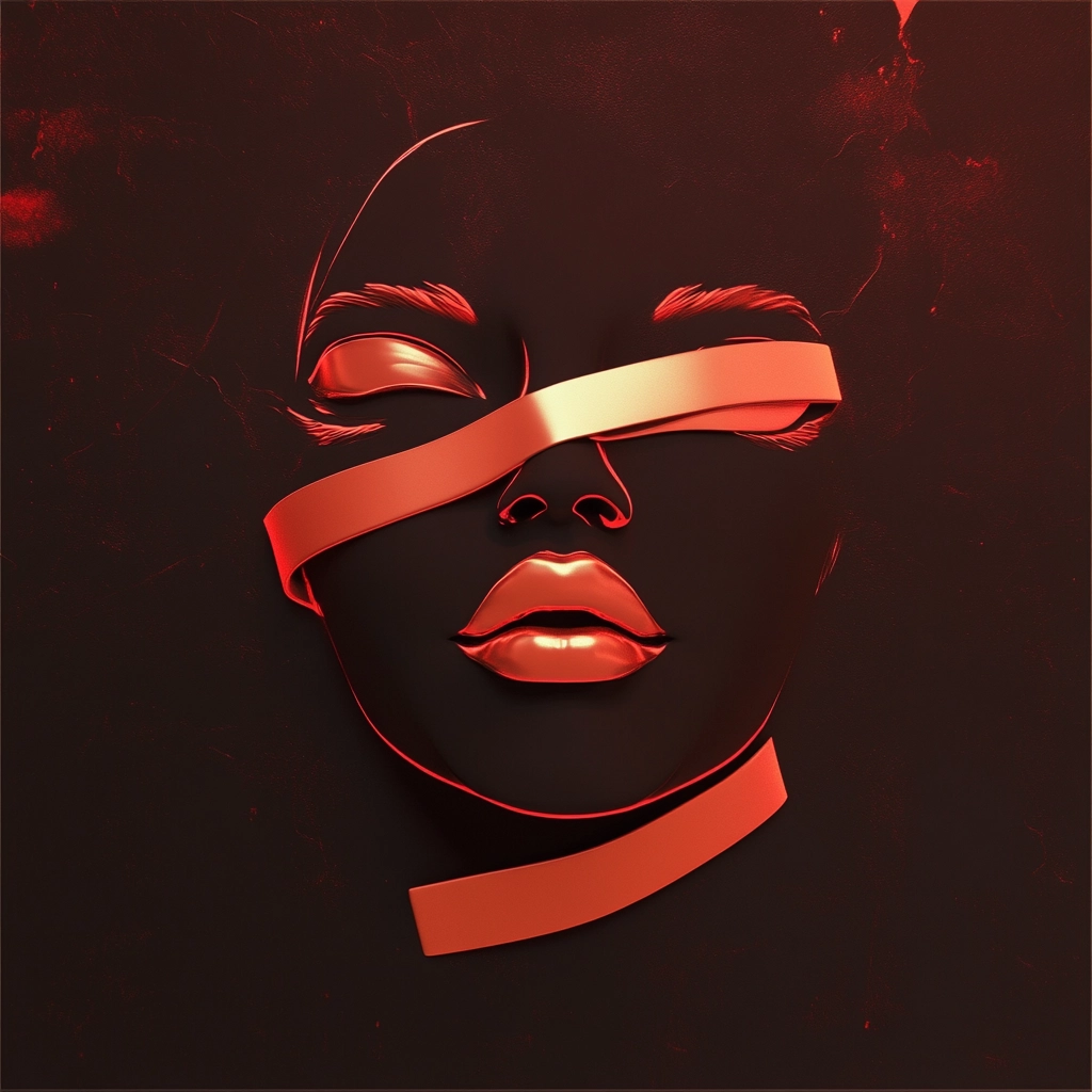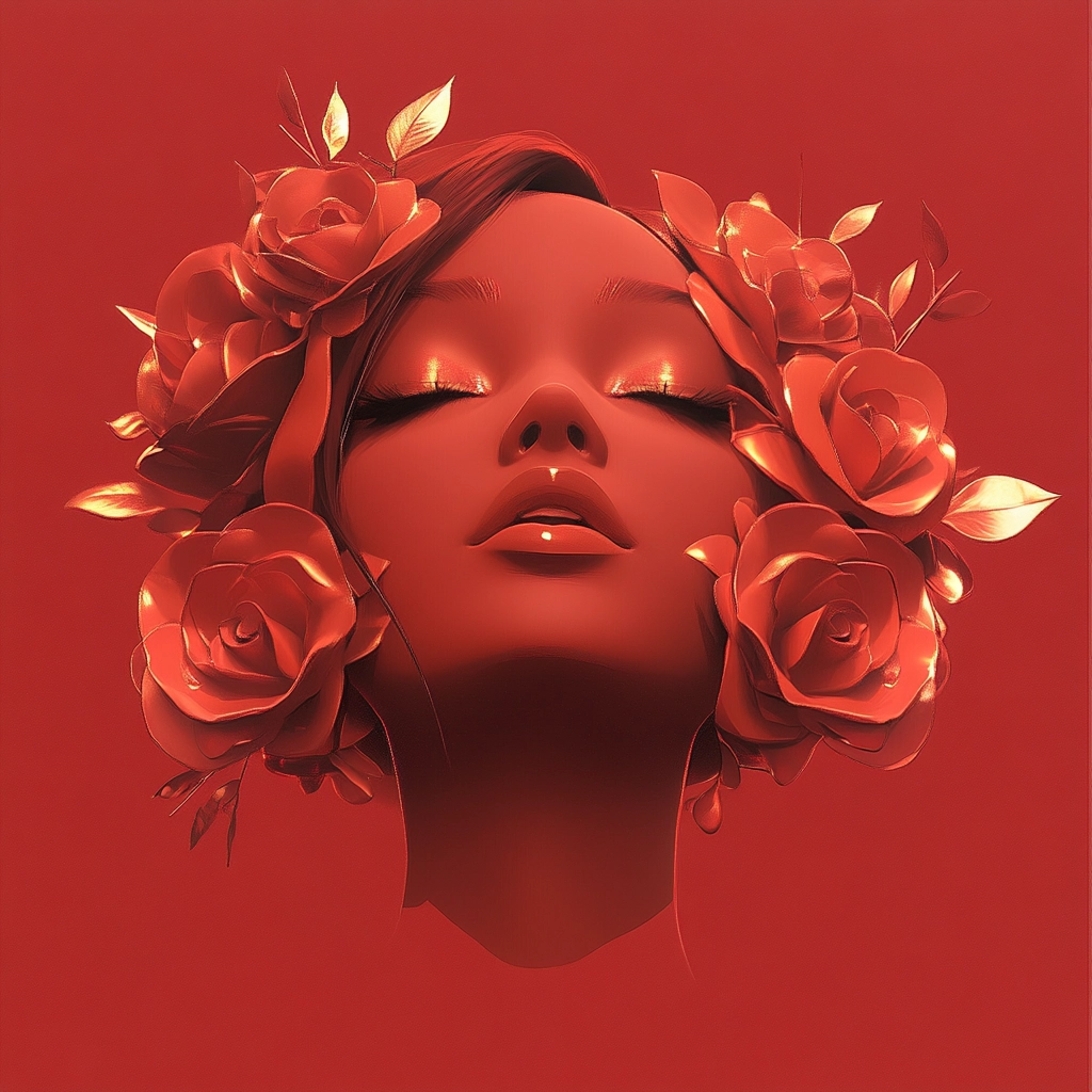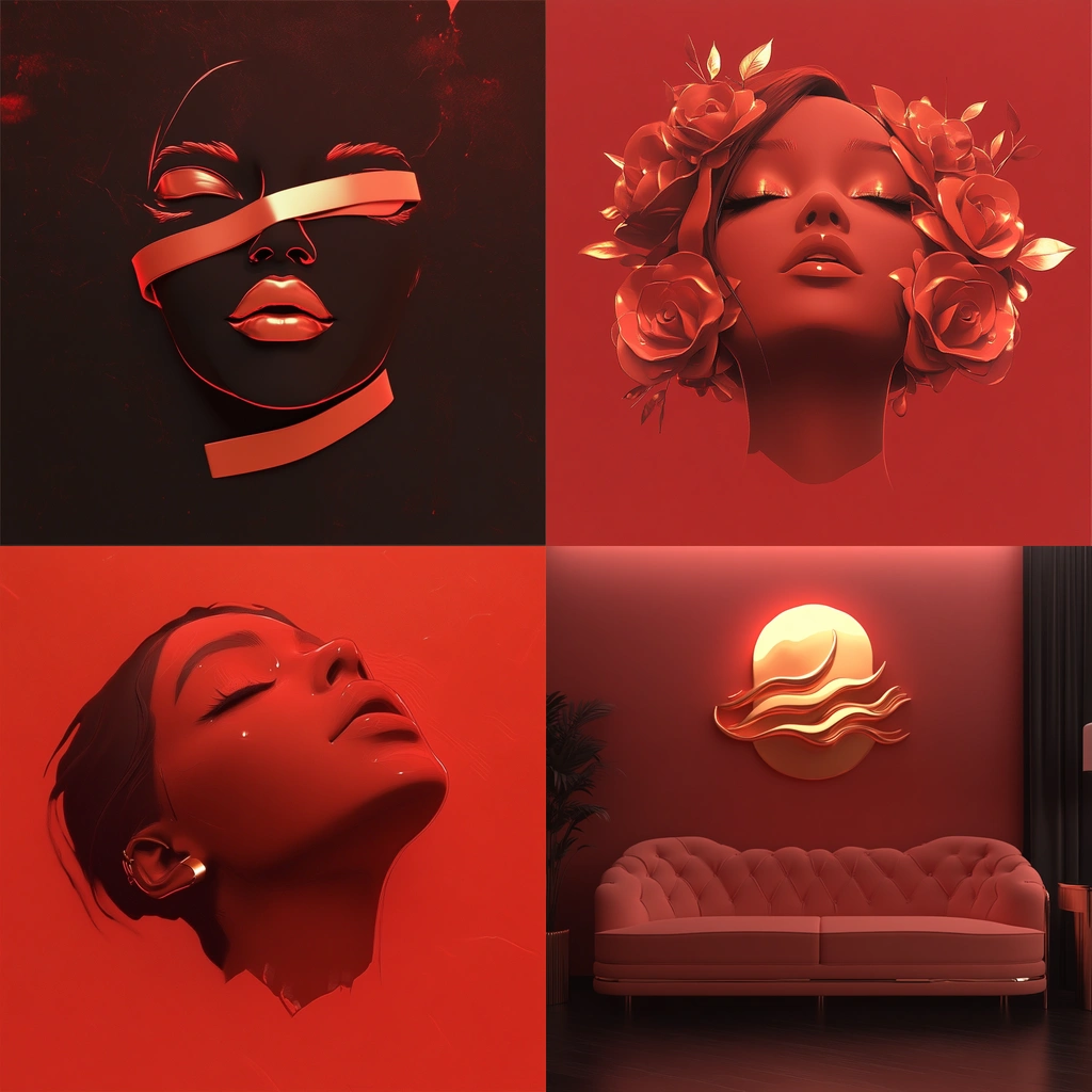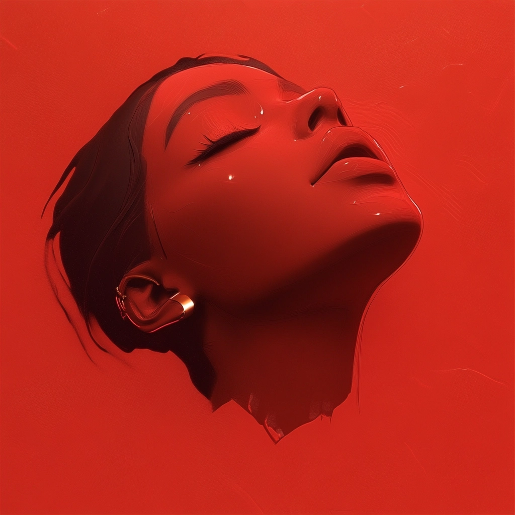 A bold use of red with layered textures and elements, creating depth through shading and silhouette contrasts.