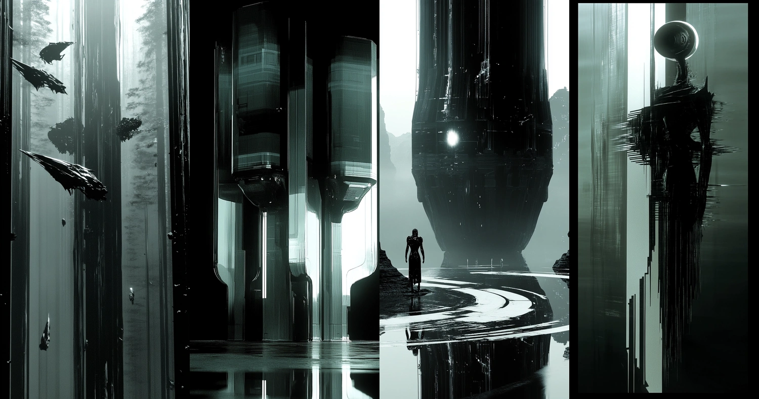Strong contrasts with reflective and sleek compositions.
