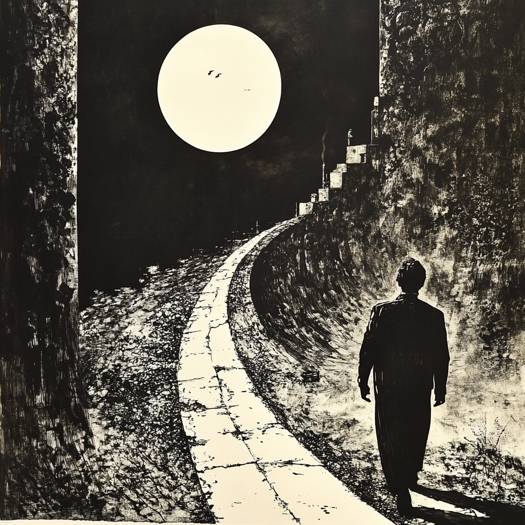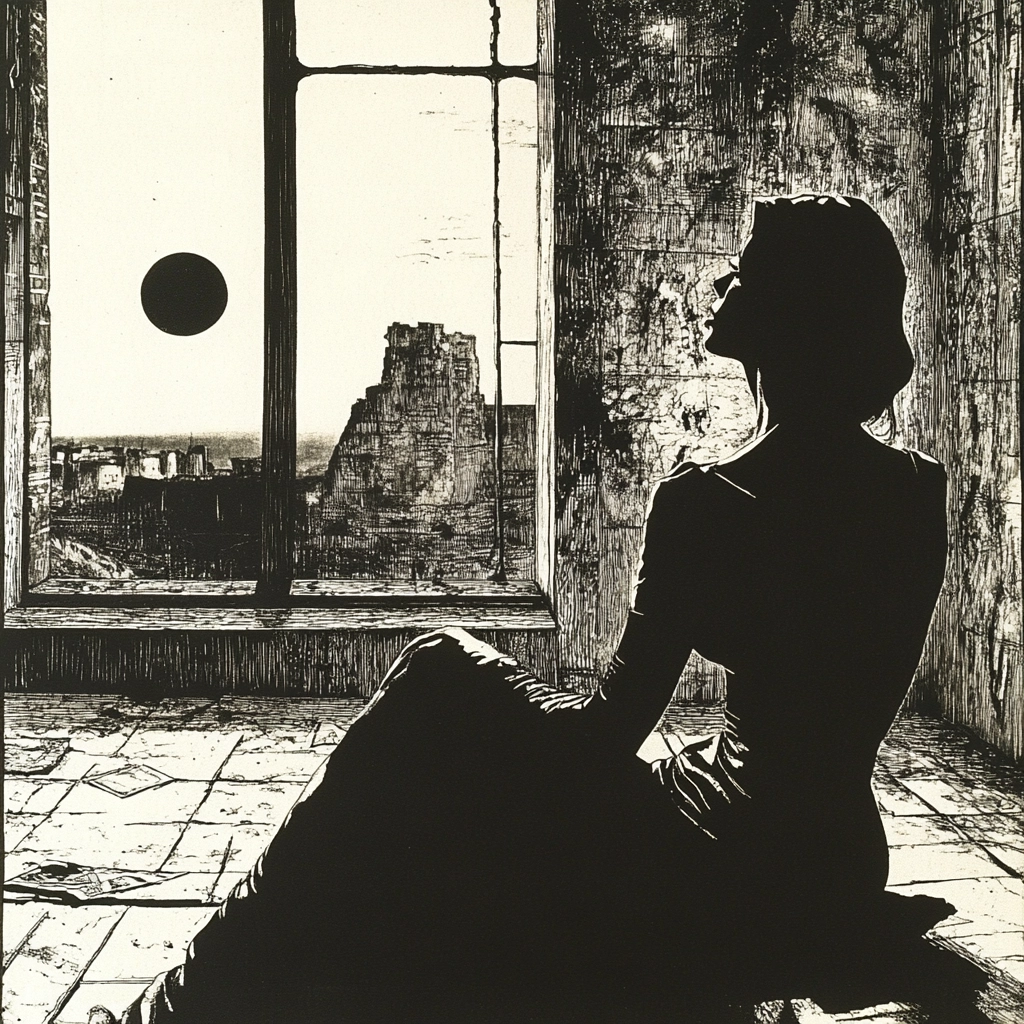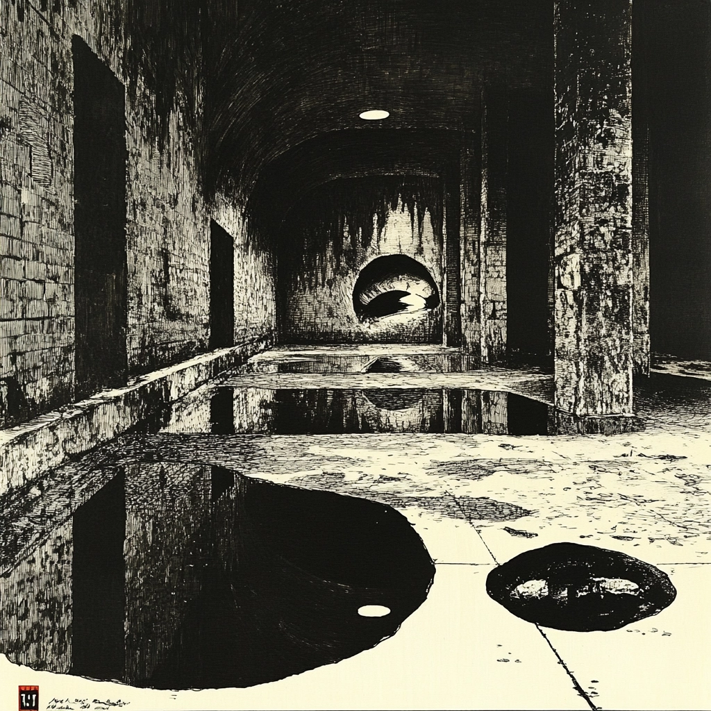 The use of sharp contrasts between black and white creates a dramatic lighting effect. Surfaces appear textured and worn, contributing to a strong sense of depth and space. Shadows are heavily emphasized, adding a sense of mystery to each scene.