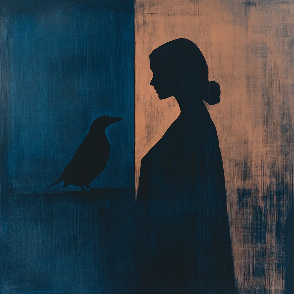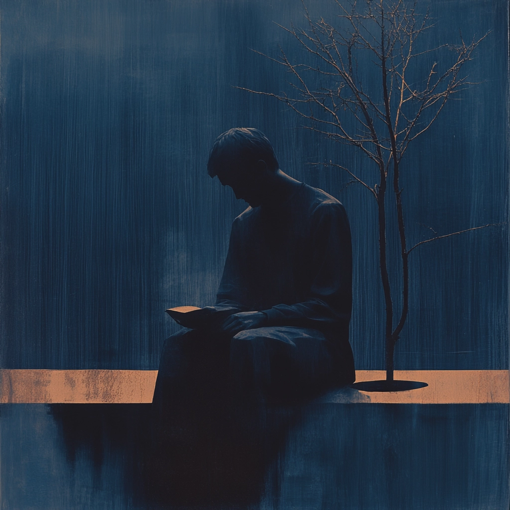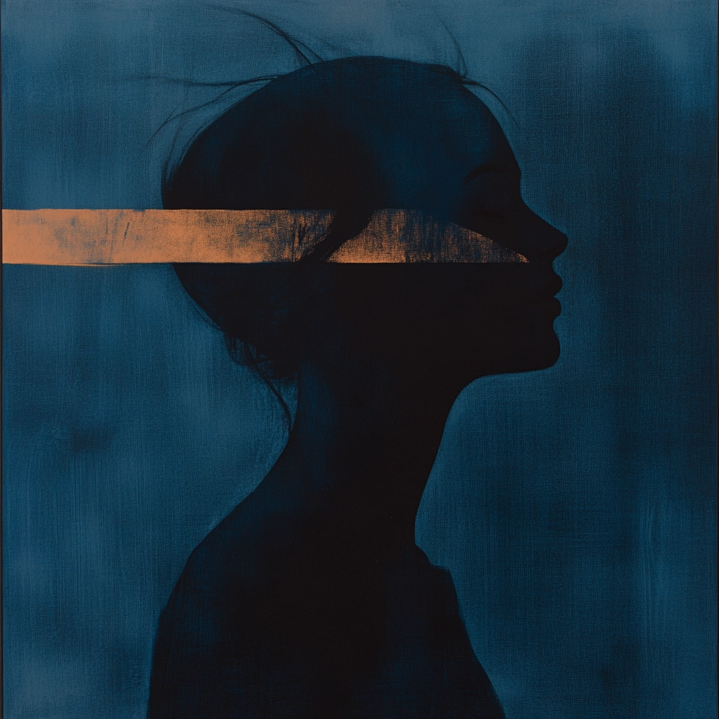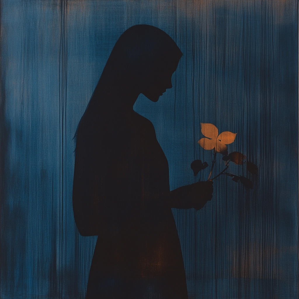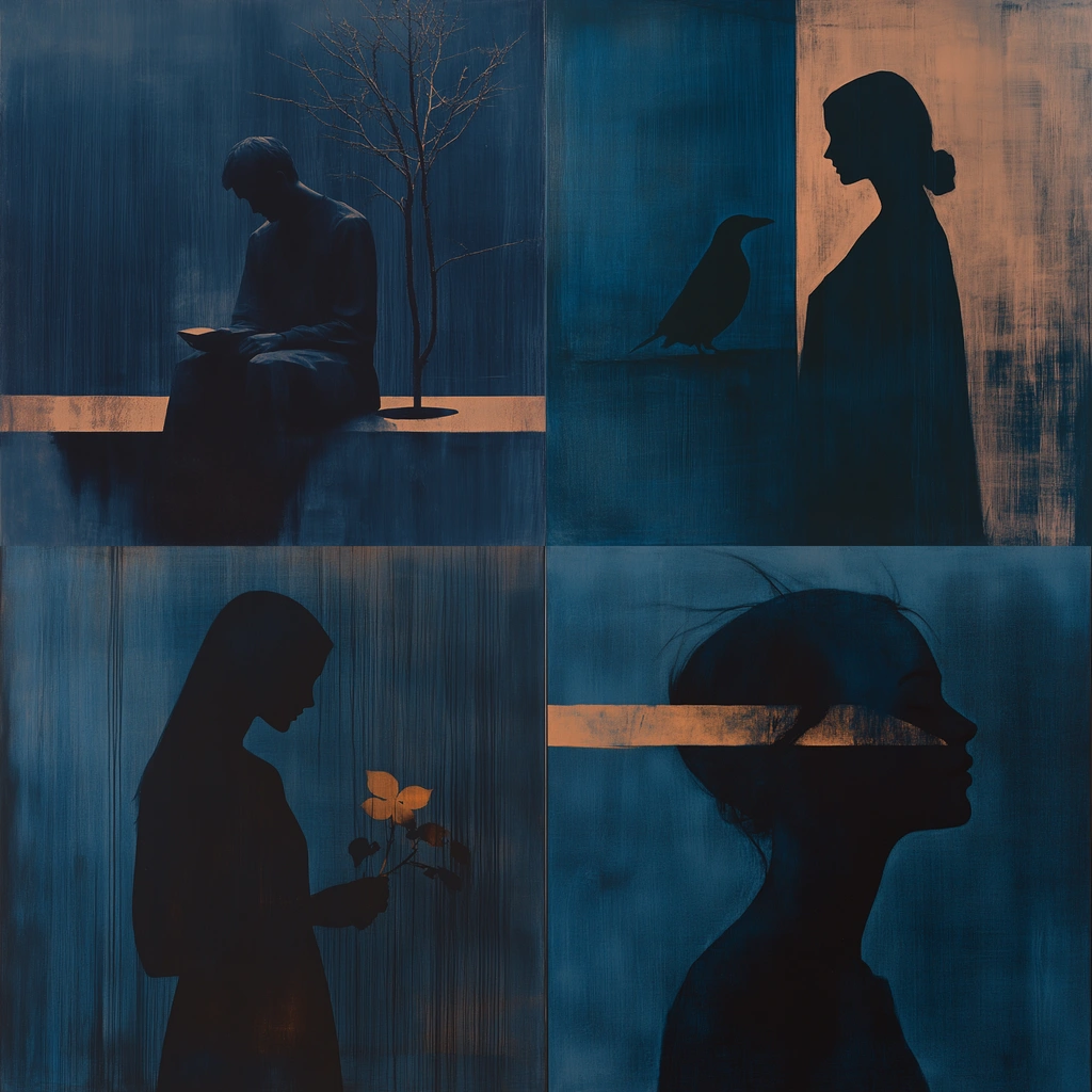 A composition of dark blue silhouettes contrasted by vibrant orange hues, creating depth and intrigue.
