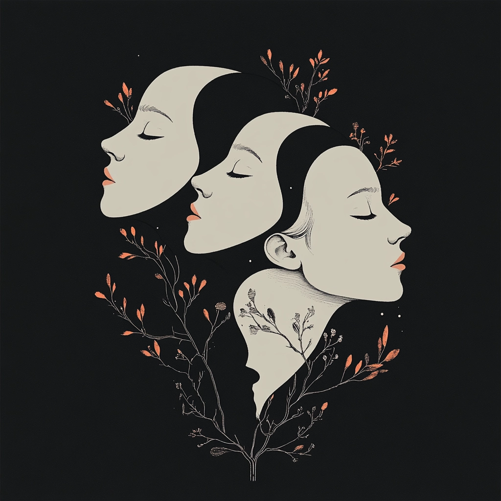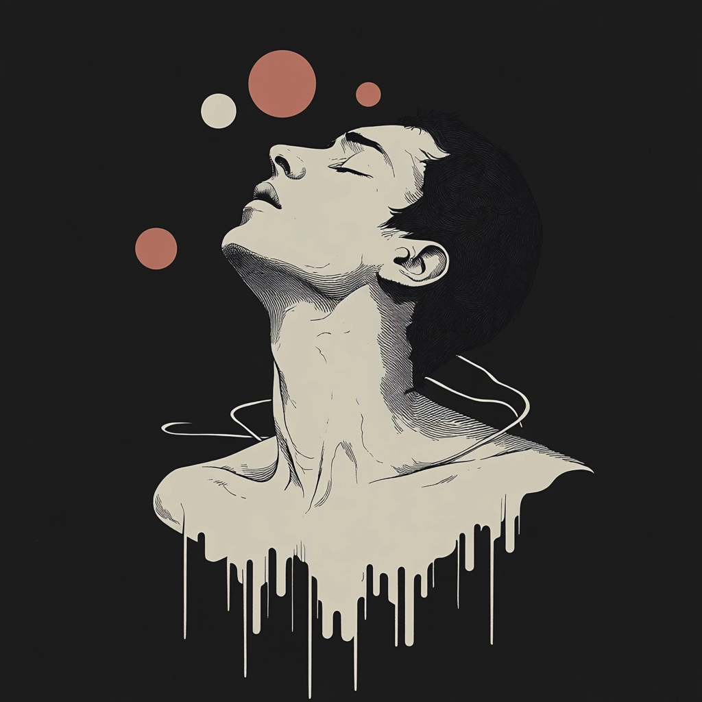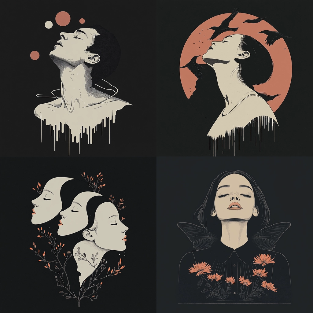 Lighting is stark with intense contrasts between dark and light areas, emphasizing the smooth, polished silhouettes. The compositions use layered textures, highlighted by an orange accent that adds depth and spatial balance against the predominantly monochrome palette.
