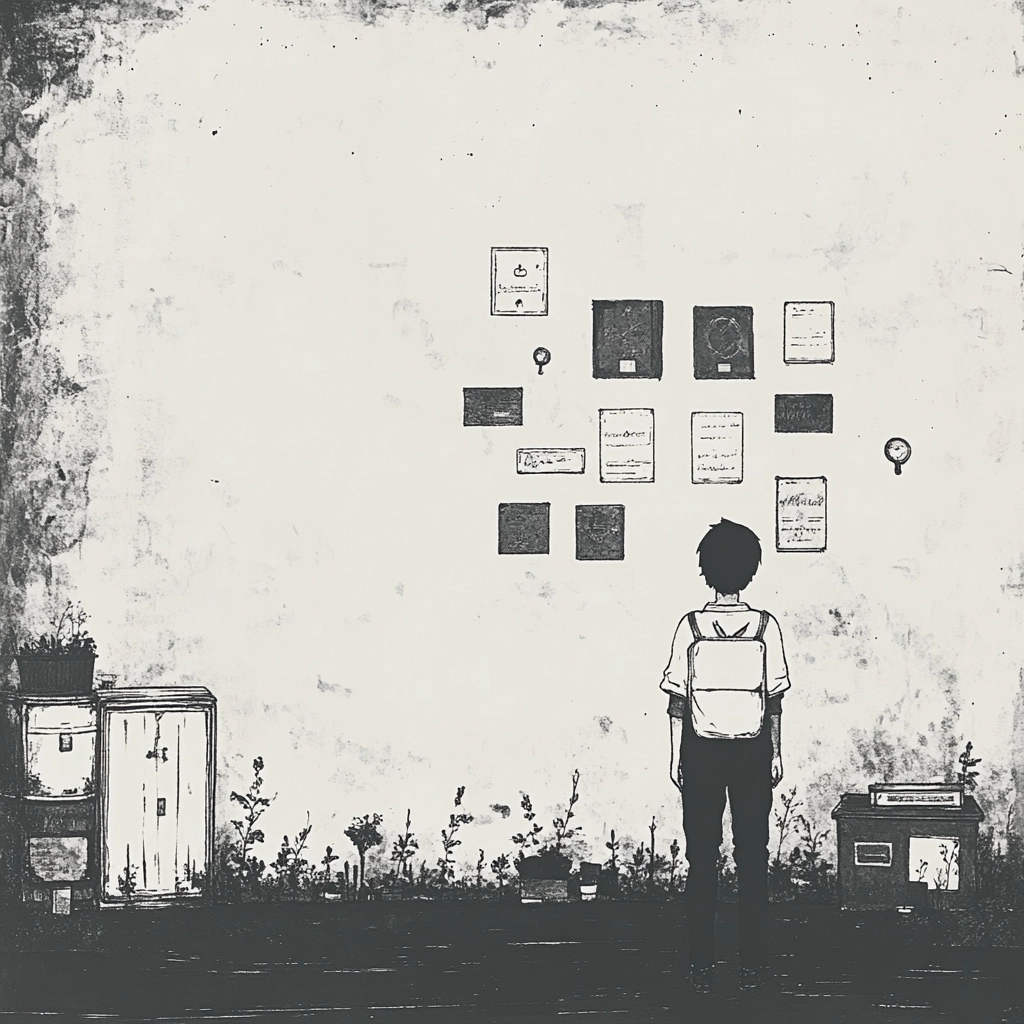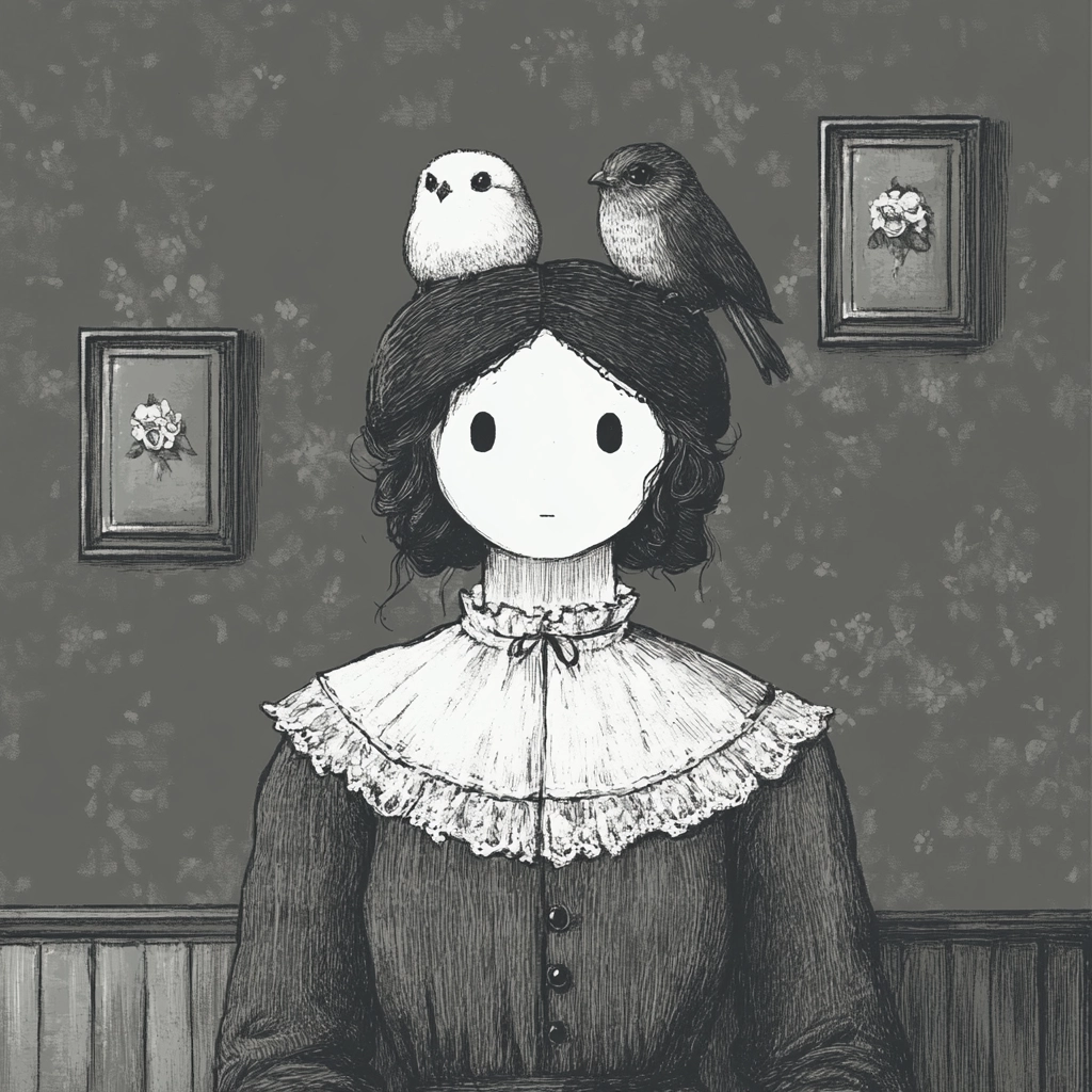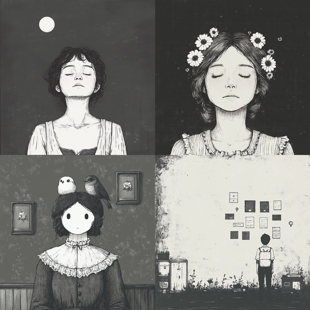 The artwork employs monochrome tones, utilizing shades of black, white, and gray to enhance contrast and depth. Textural variations contribute to a tactile sense within the drawings, promoting a feeling of dimensionality. The use of light and shadow further defines spatial relations, adding nuance to the flatness of the background.