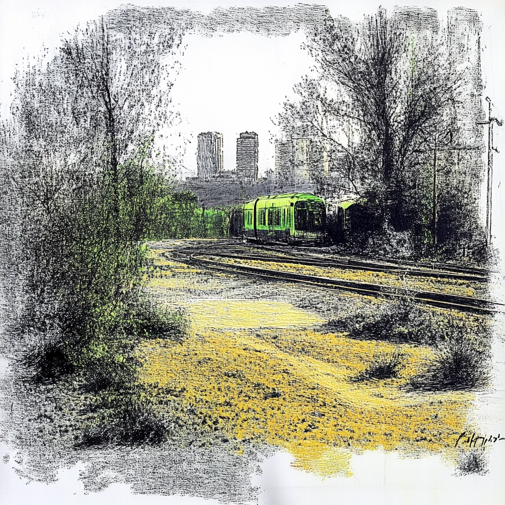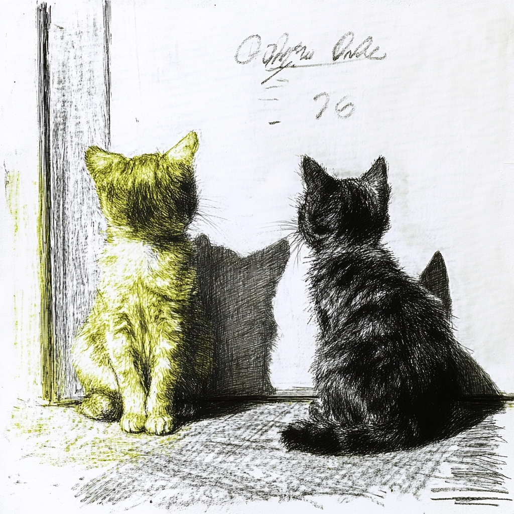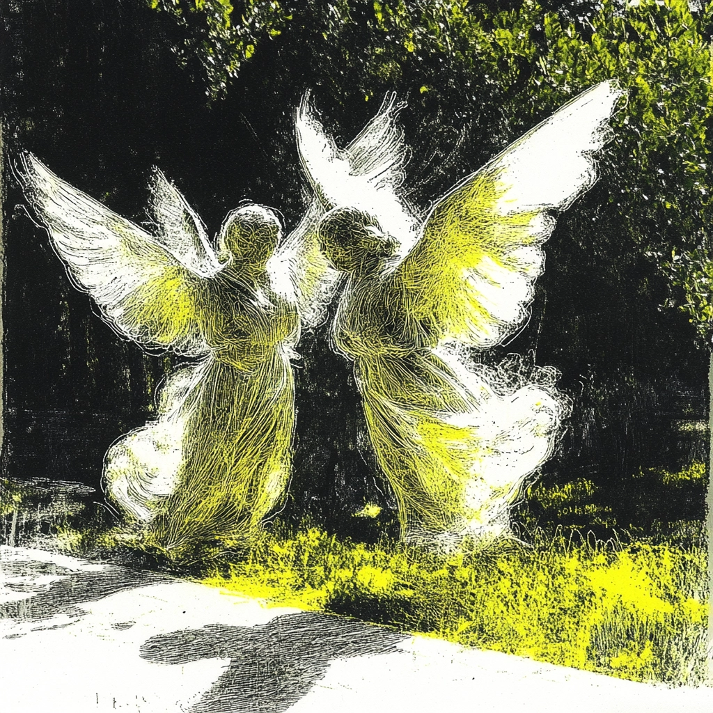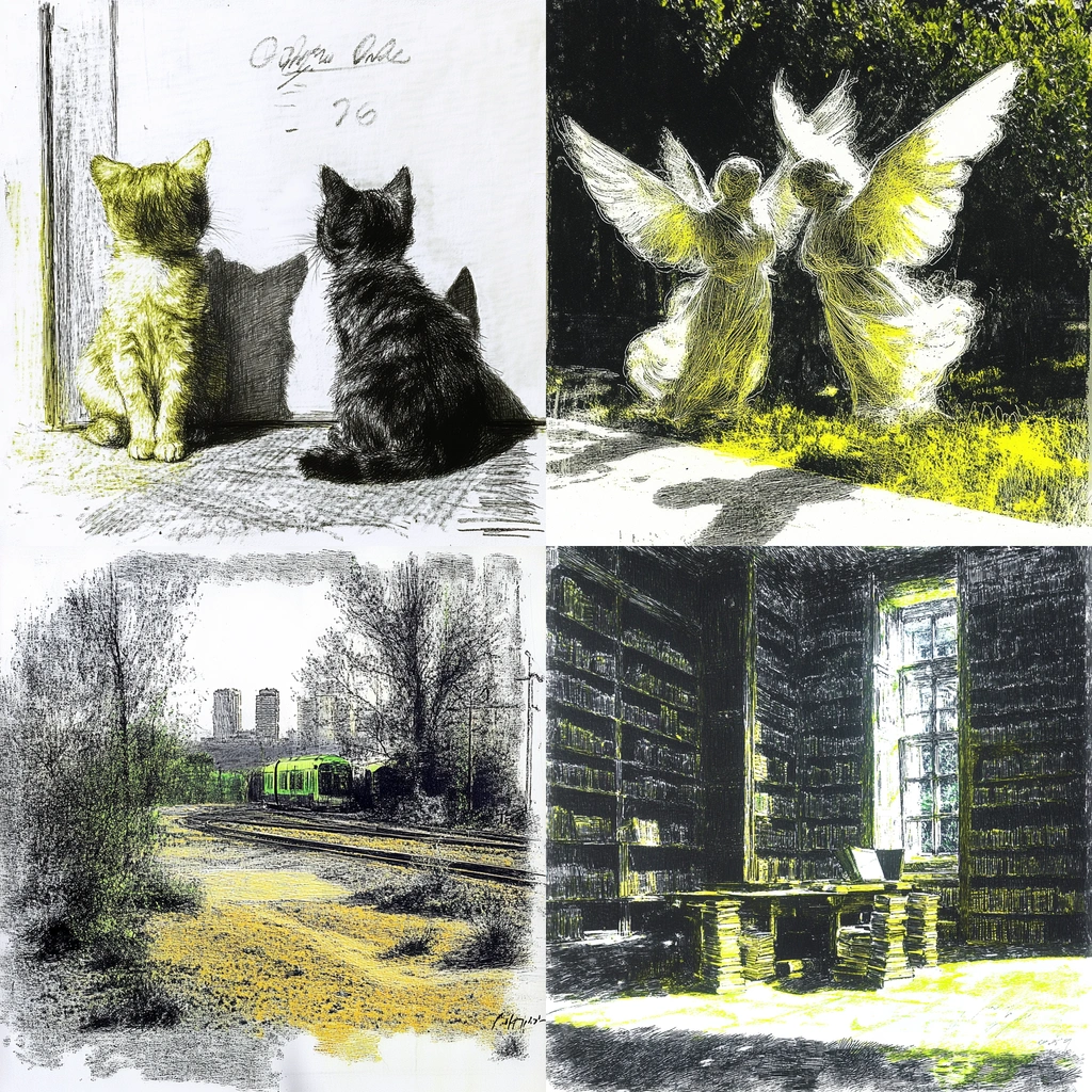 The artwork employs monochrome sketches enhanced with vivid yellow highlighting, crafting a striking visual interplay.